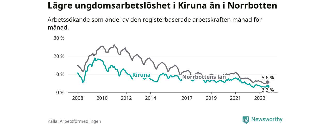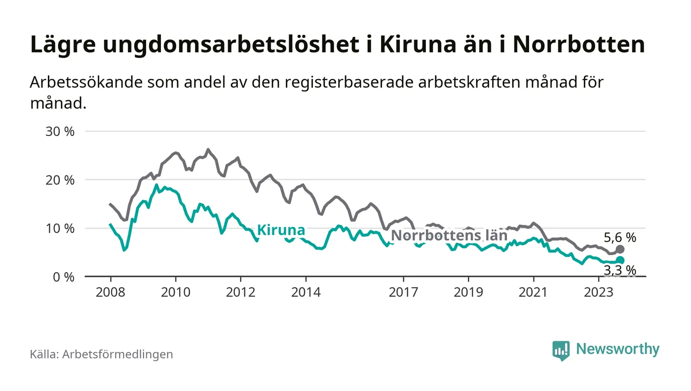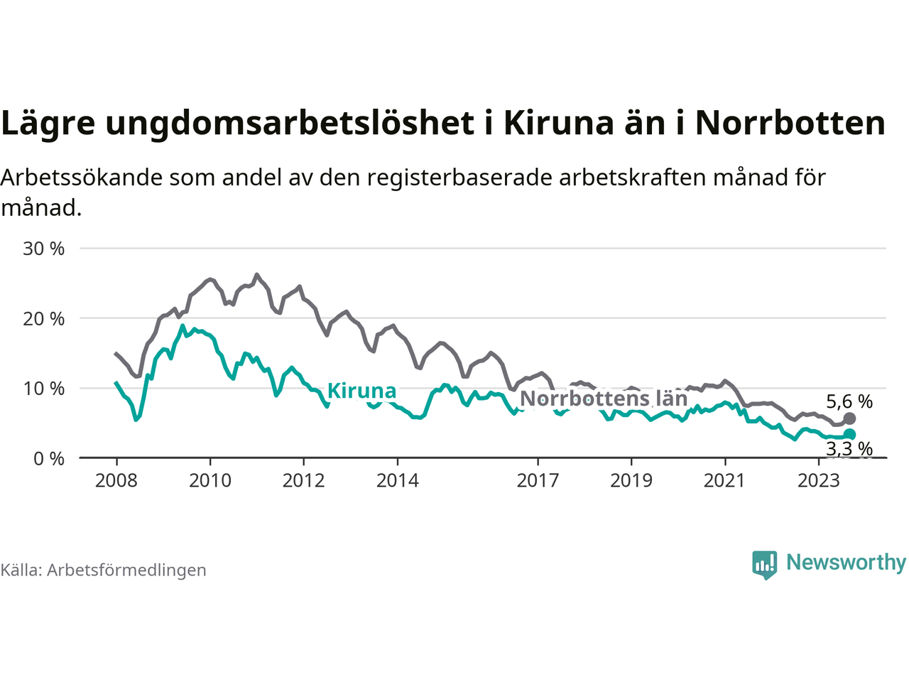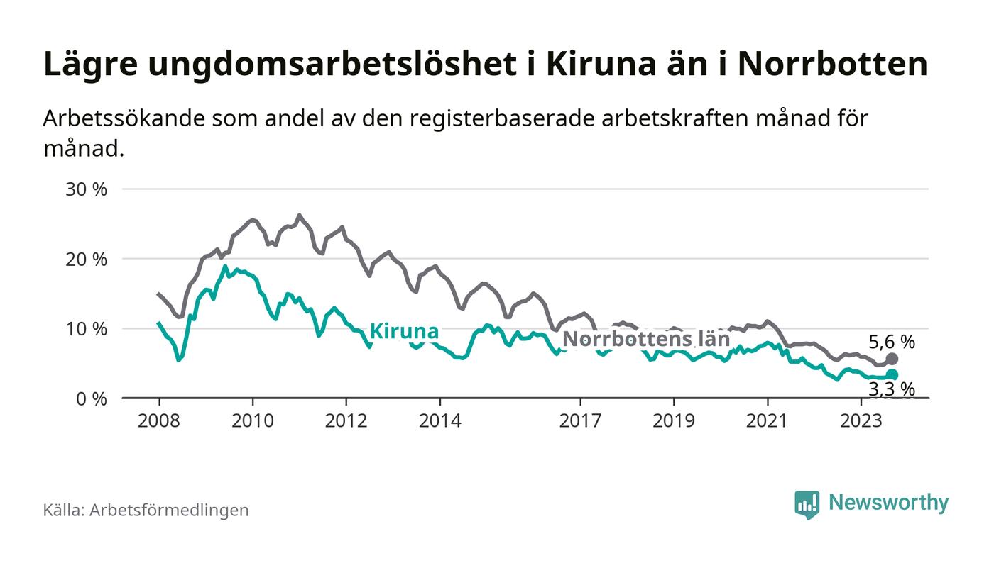Precis som den totala arbetslösheten ligger ungdomsarbetslösheten i Kiruna lägre än i Norrbotten som helhet. Skillnaden mellan kommunen och länet är 2,3 procentenheter.