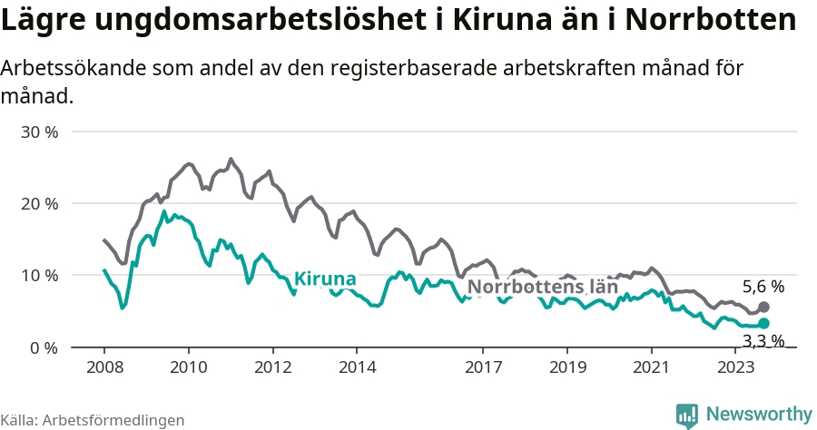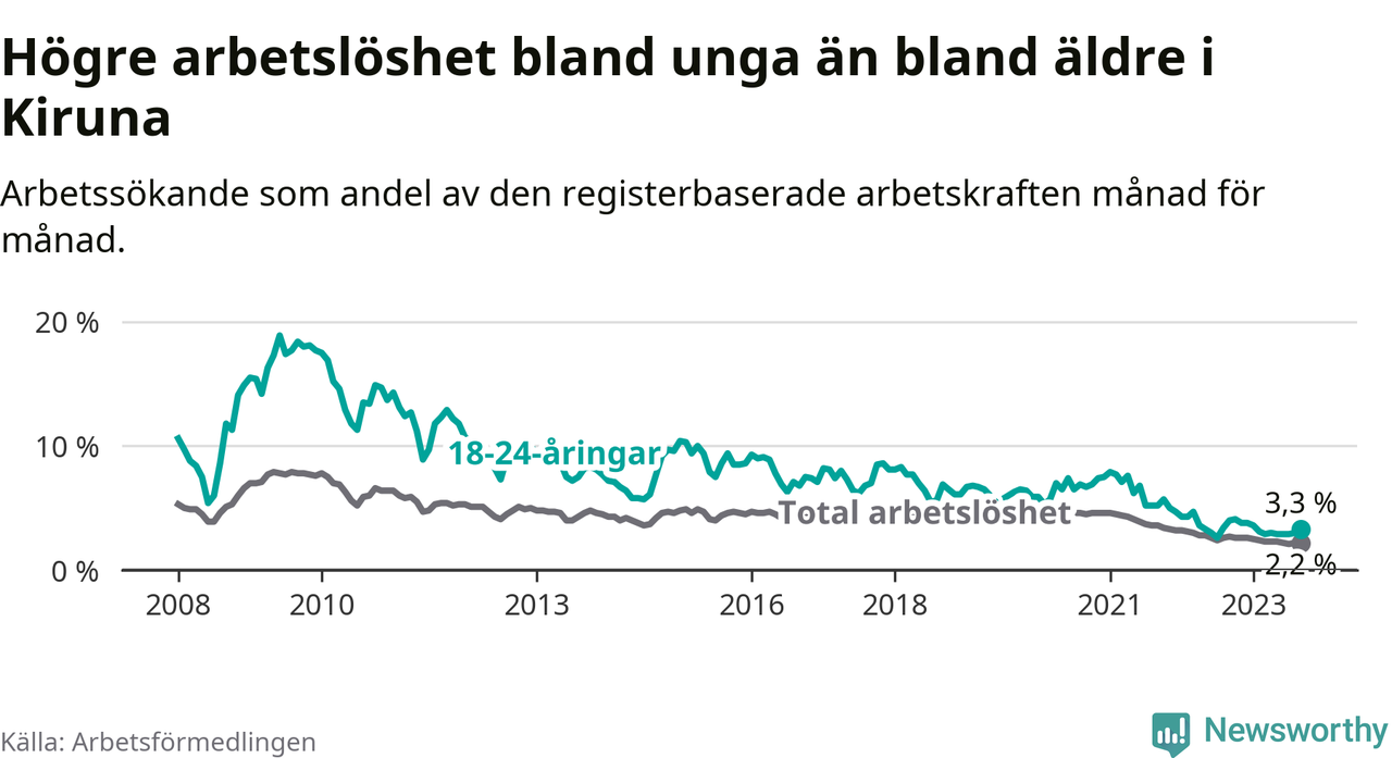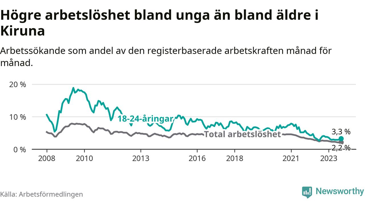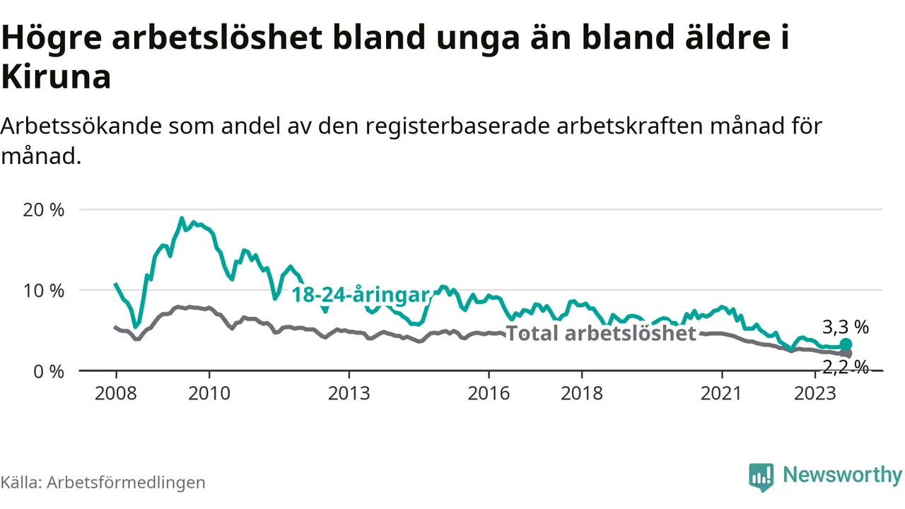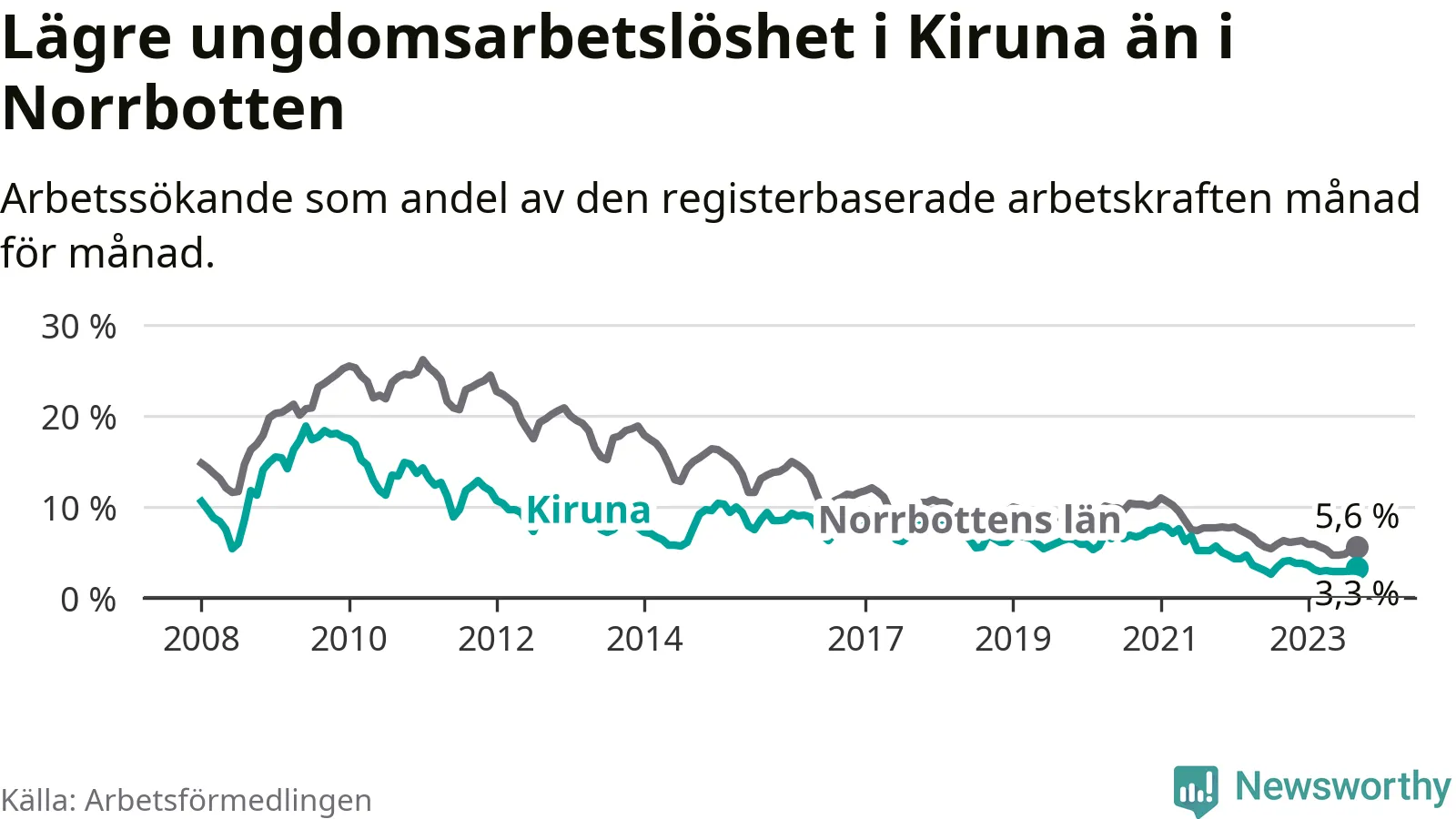 Precis som den totala arbetslösheten ligger ungdomsarbetslösheten i Kiruna lägre än i Norrbotten som helhet. Skillnaden mellan kommunen och länet är 2,3 procentenheter.