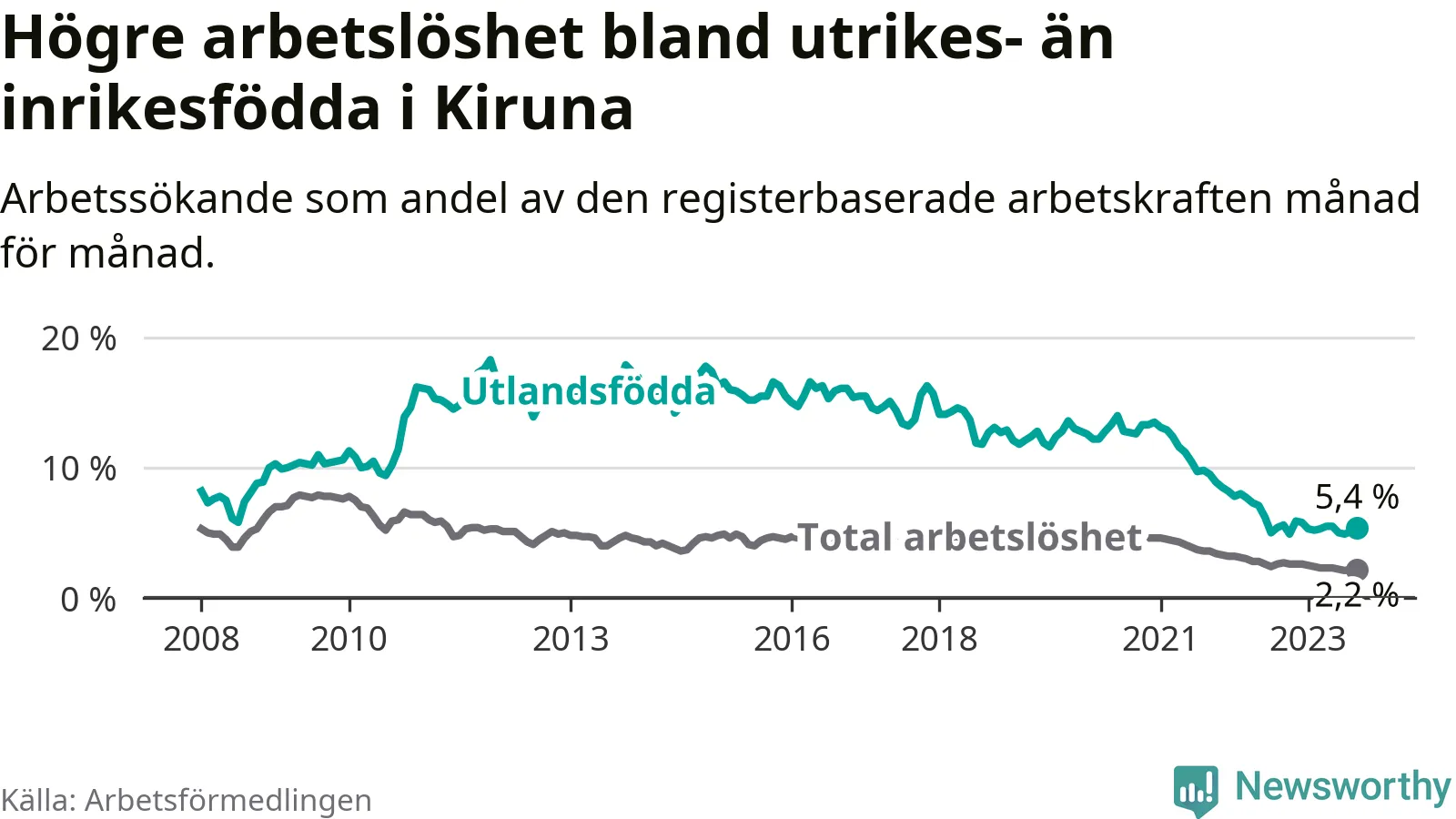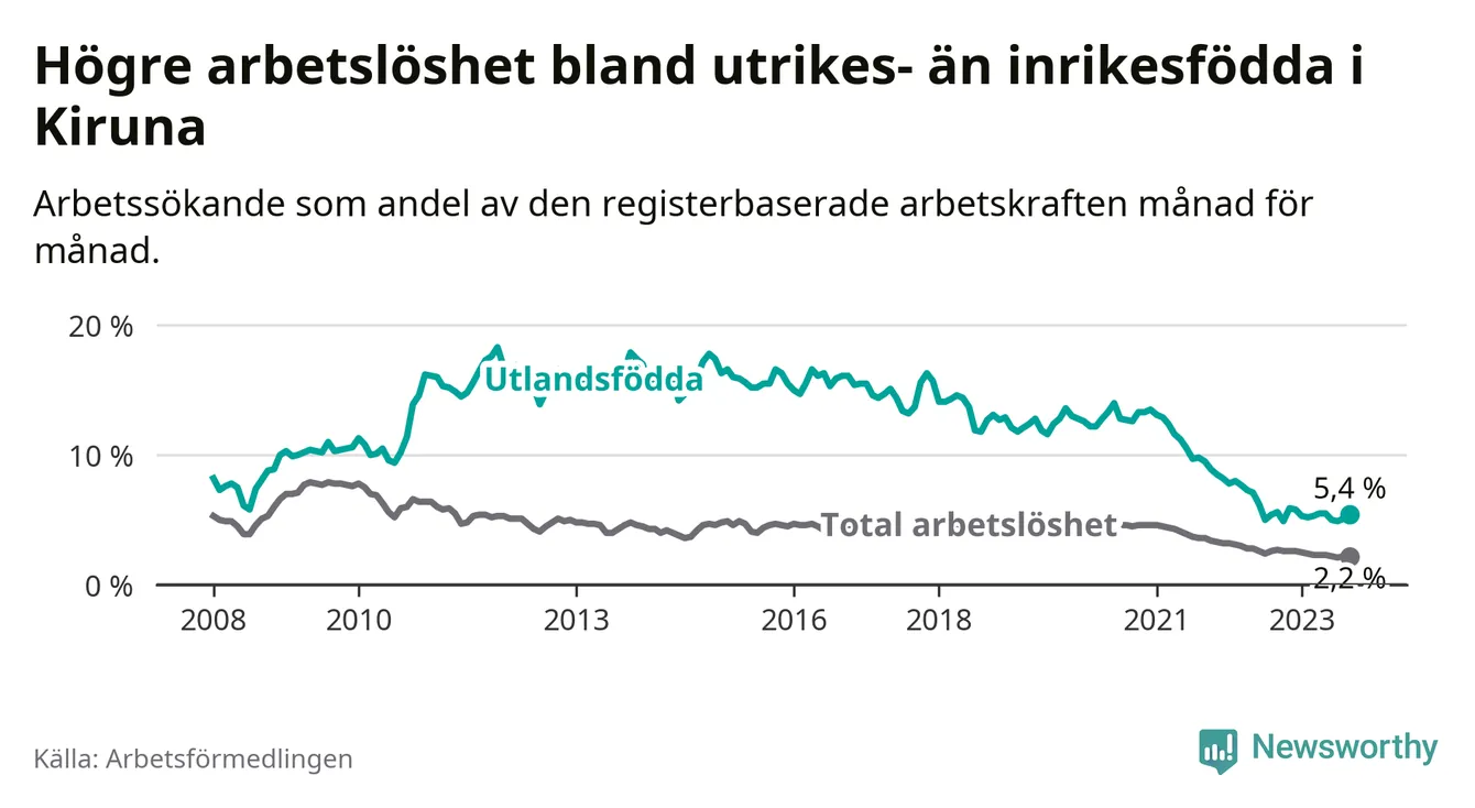 Efter nedgången i arbetslöshet bland utlandsfödda har Kiruna nu den lägsta arbetslösheten i Norrbotten. Överkalix har högsta arbetslöshet i länet bland personer födda i ett annat land (14,3 procent).