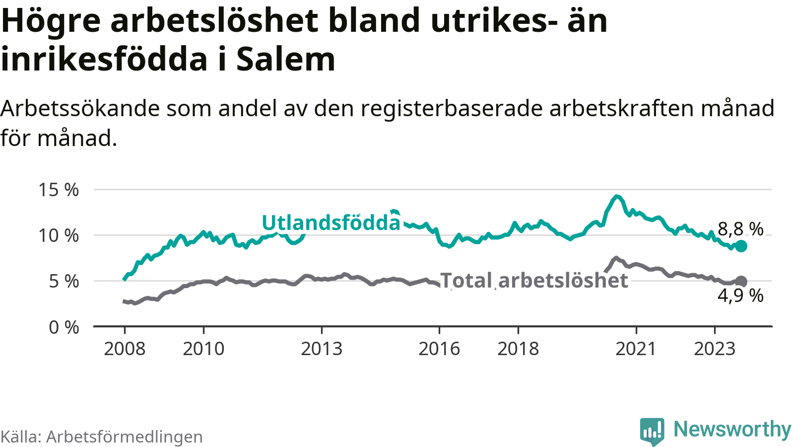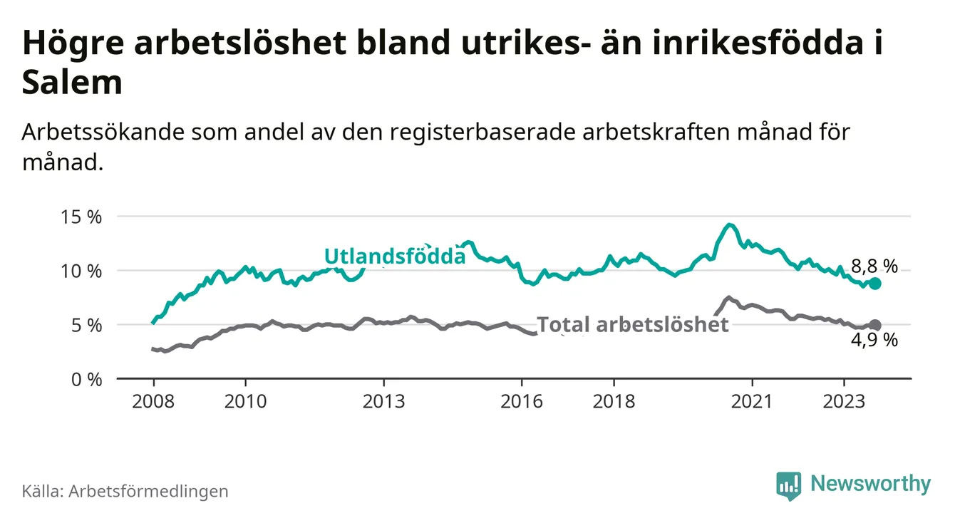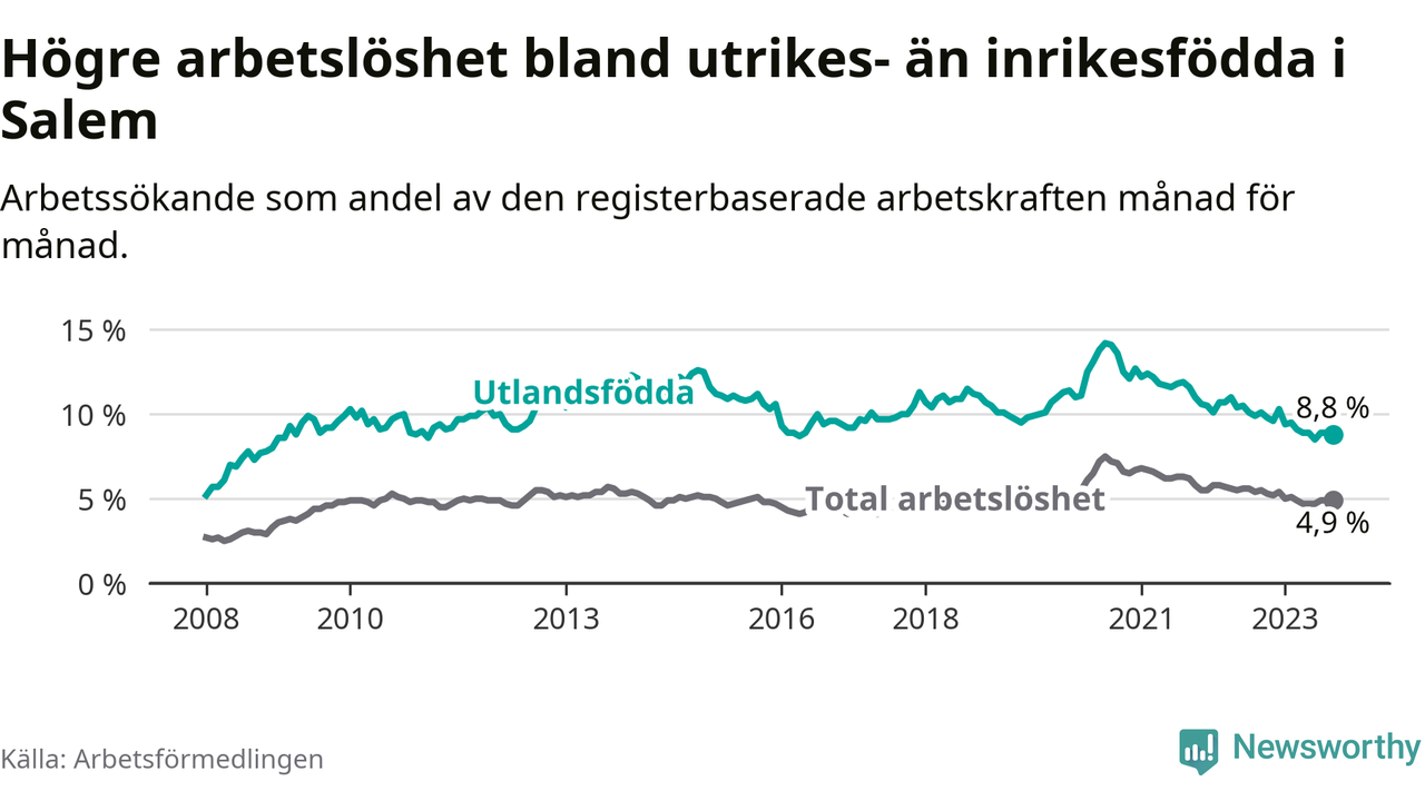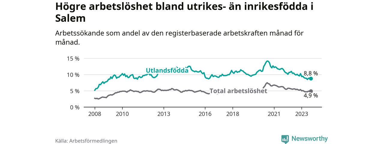 Skillnaden i arbetslöshet mellan utrikesfödda och hela befolkningen är 3,9 procentenheter i Salem. Det är en mindre skillnad än för ett år sedan (−0,7 procentenheter).