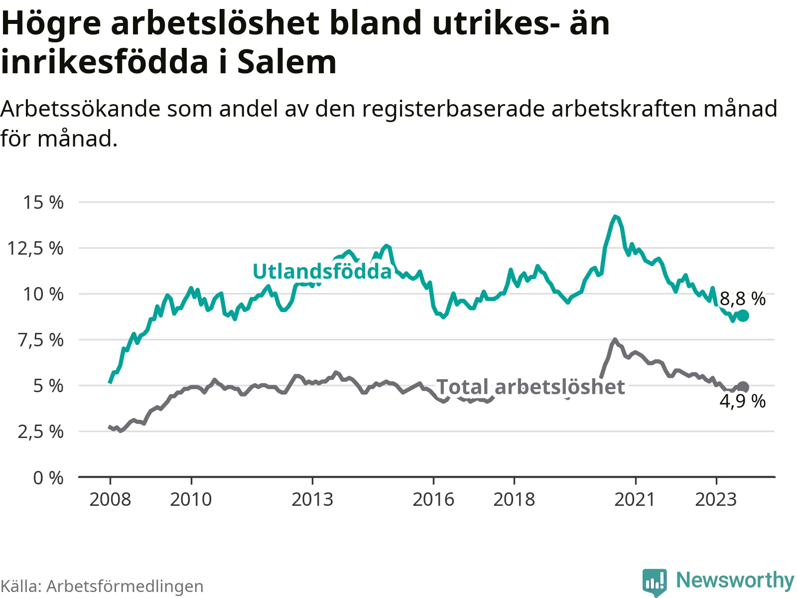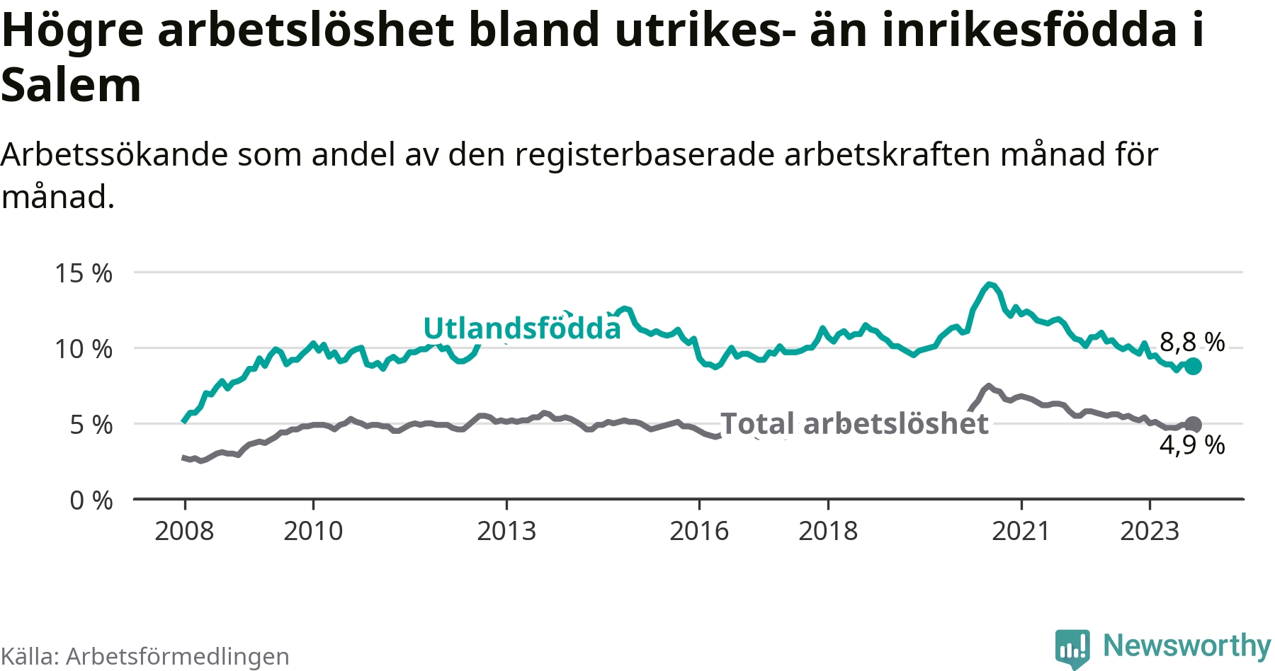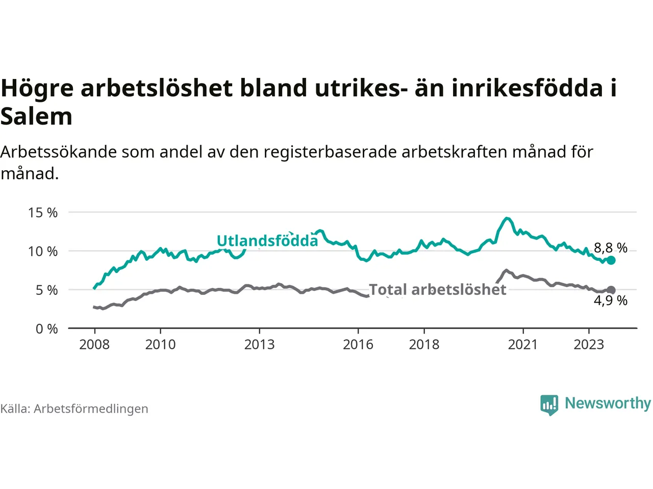 Skillnaden i arbetslöshet mellan utrikesfödda och hela befolkningen är 3,9 procentenheter i Salem. Det är en mindre skillnad än för ett år sedan (−0,7 procentenheter).