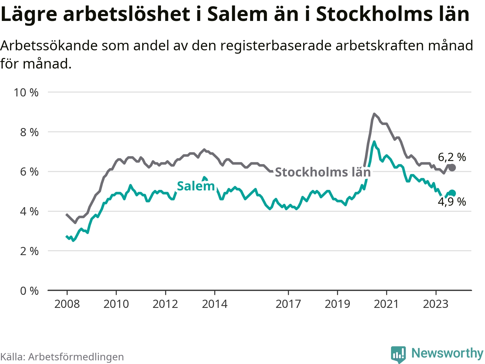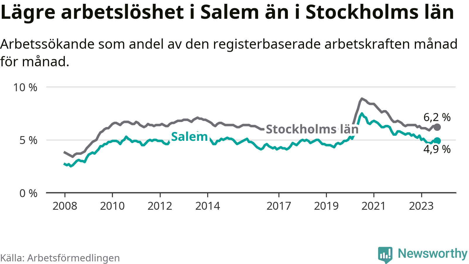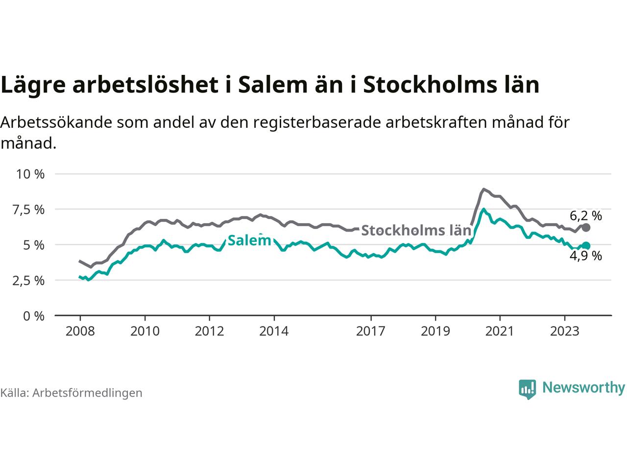 Graf: Arbetslöshet i Salems kommun och Stockholms län
