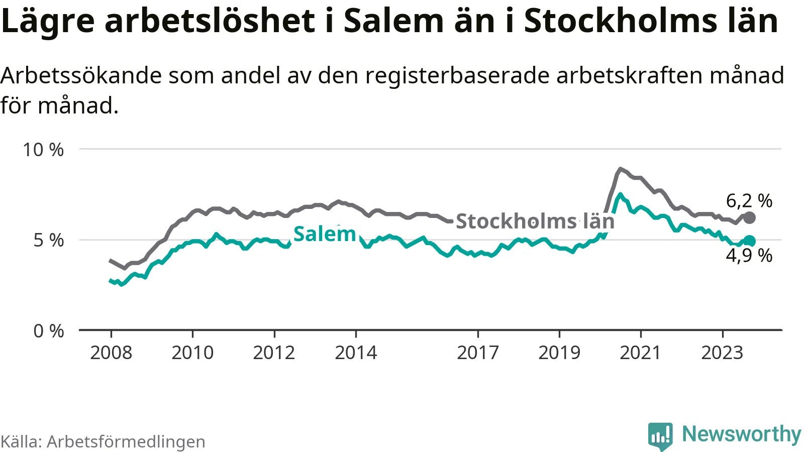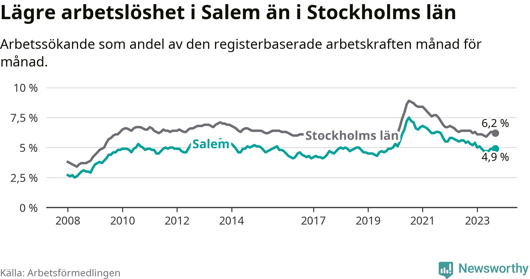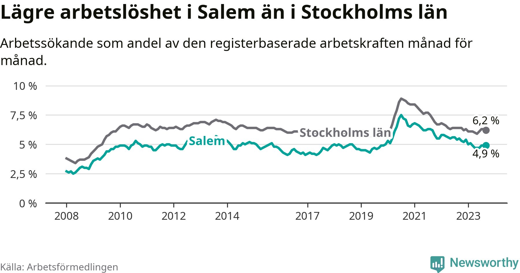 Graf: Arbetslöshet i Salems kommun och Stockholms län