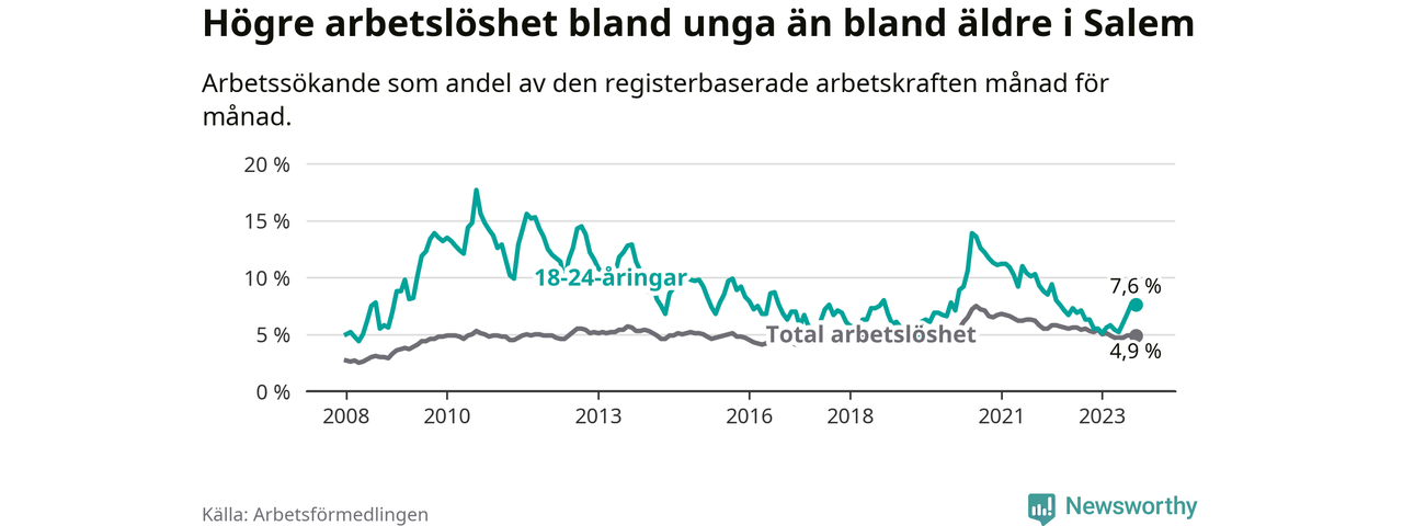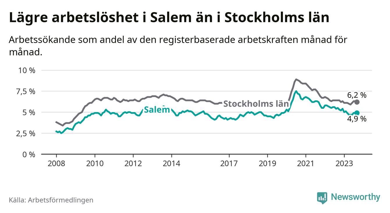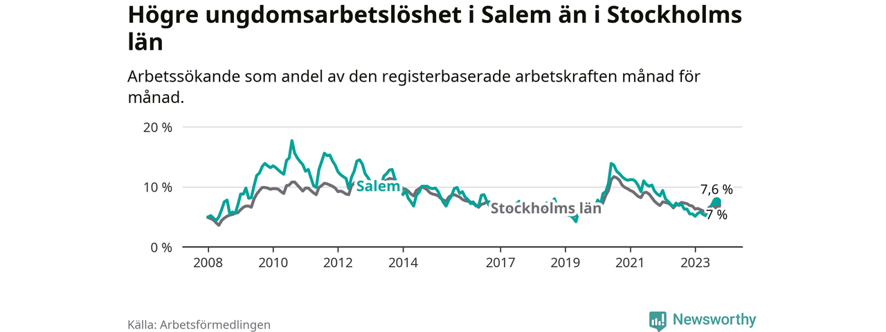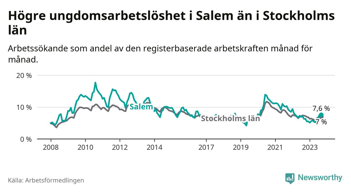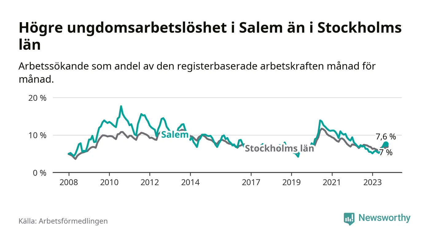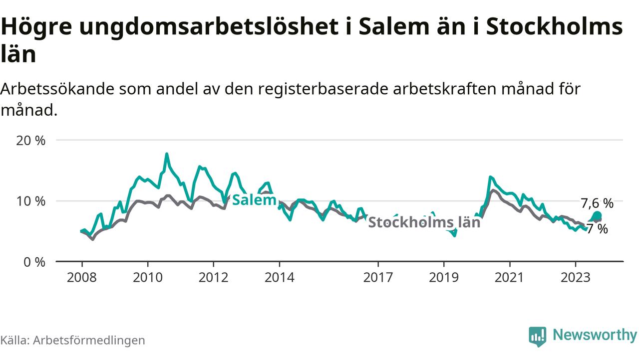 Medan Salem har lägre total arbetslöshet än Stockholms län, ligger ungdomsarbetslösheten 0,6 procentenheter högre i Salem.