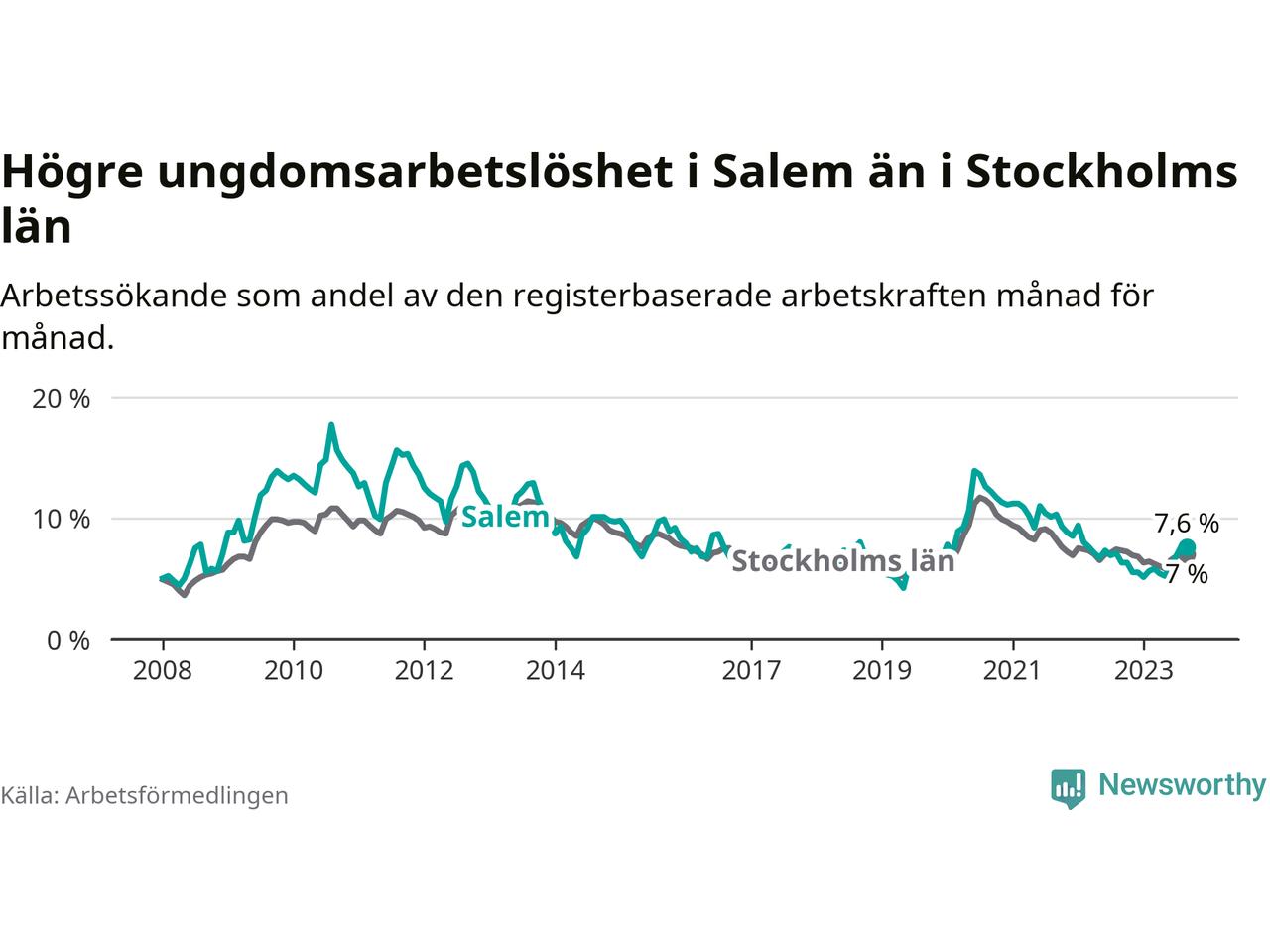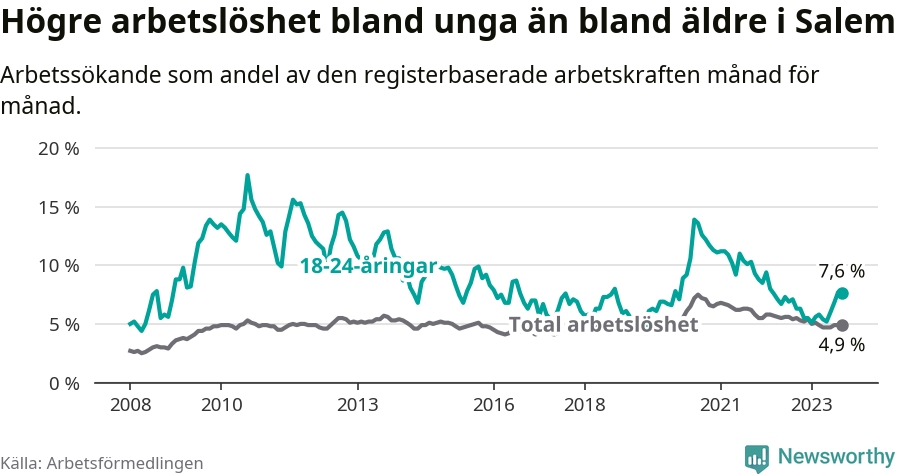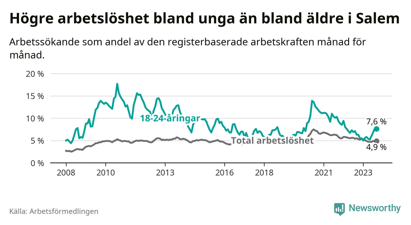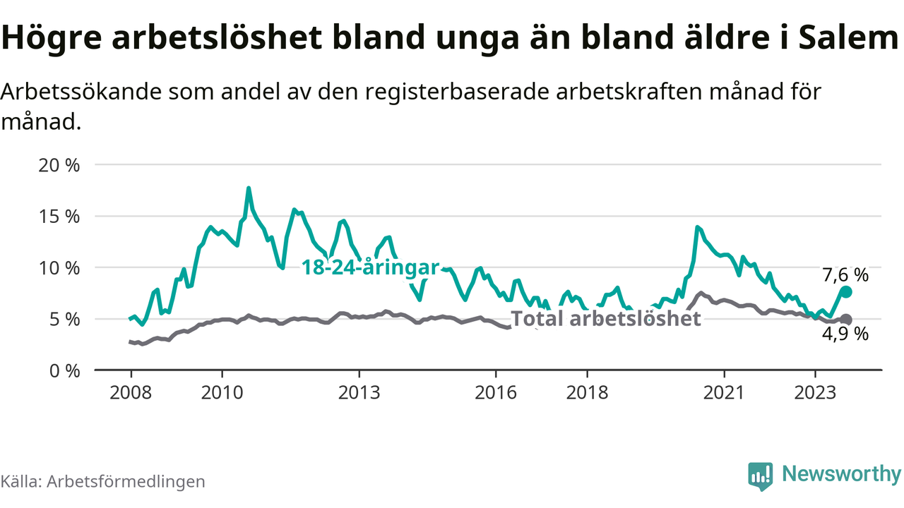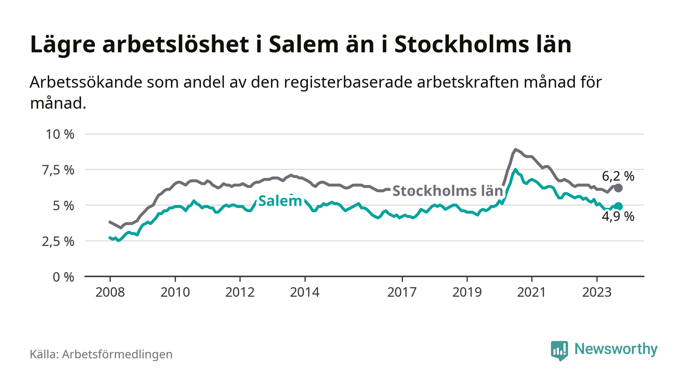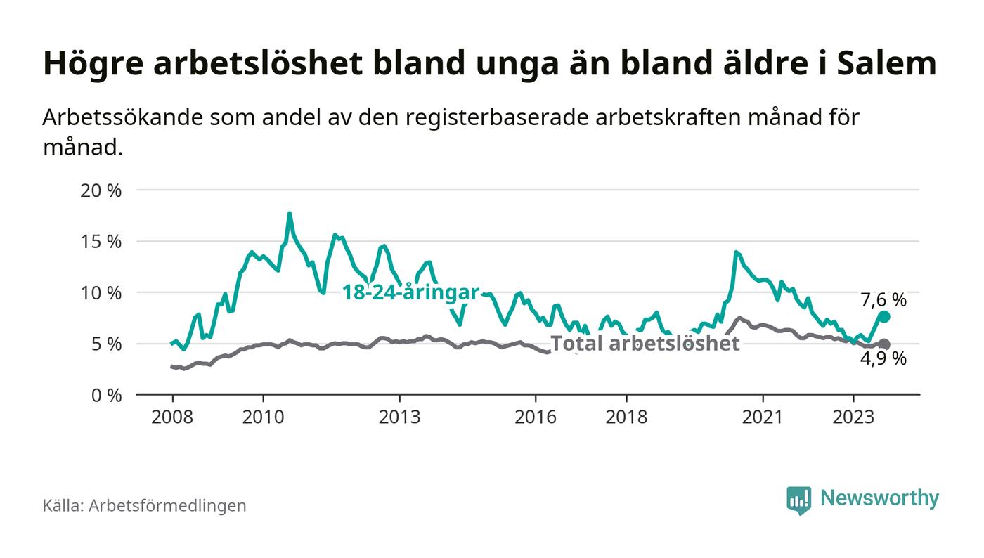 Medan Salem har lägre total arbetslöshet än Stockholms län, ligger ungdomsarbetslösheten 0,6 procentenheter högre i Salem.