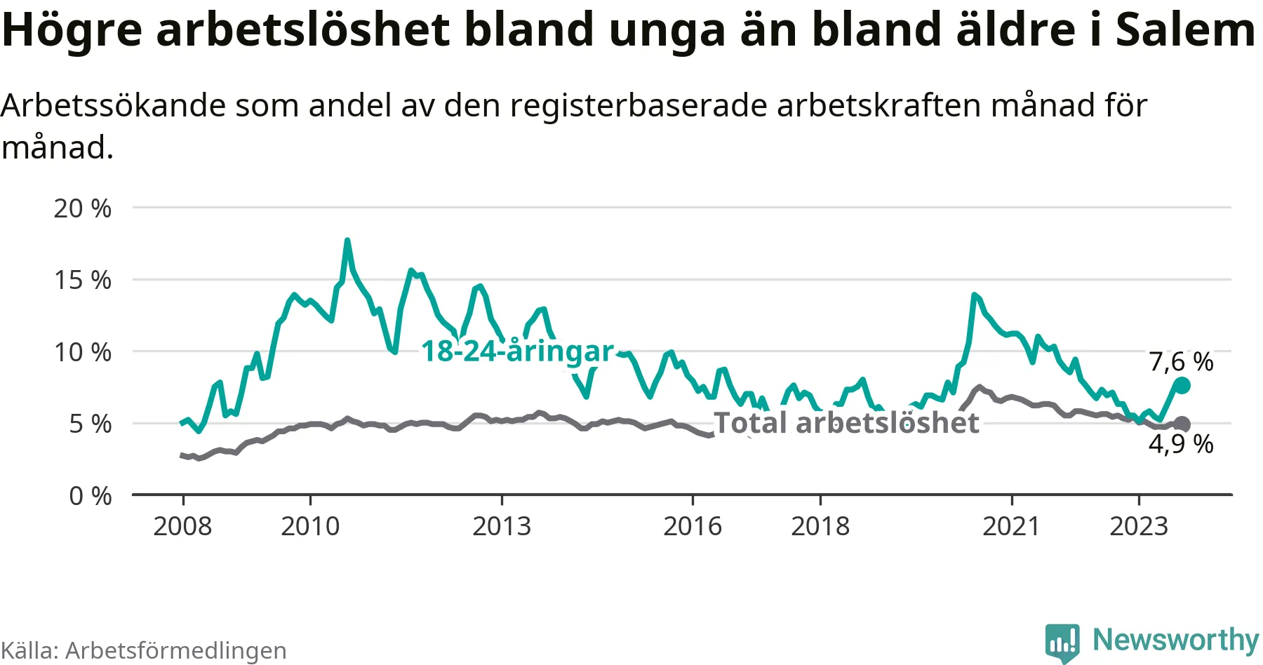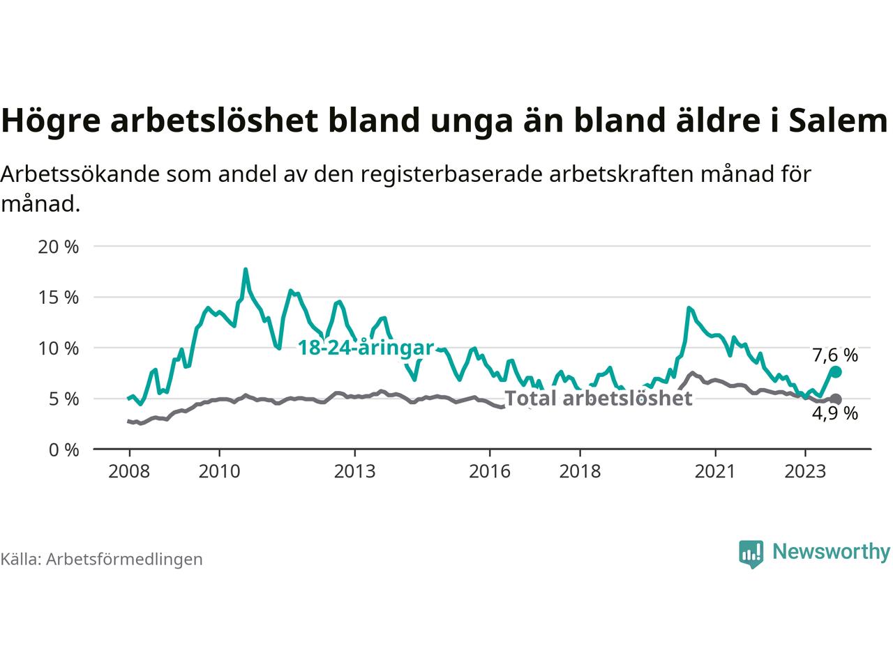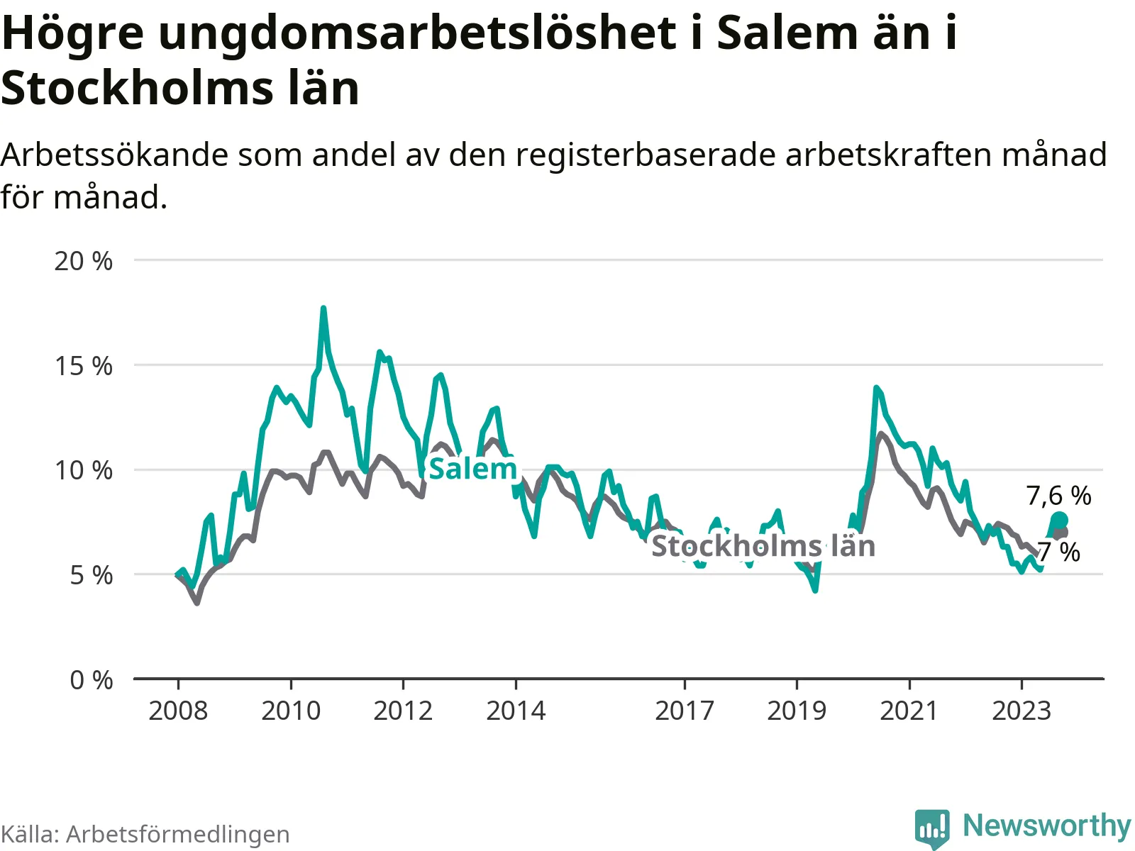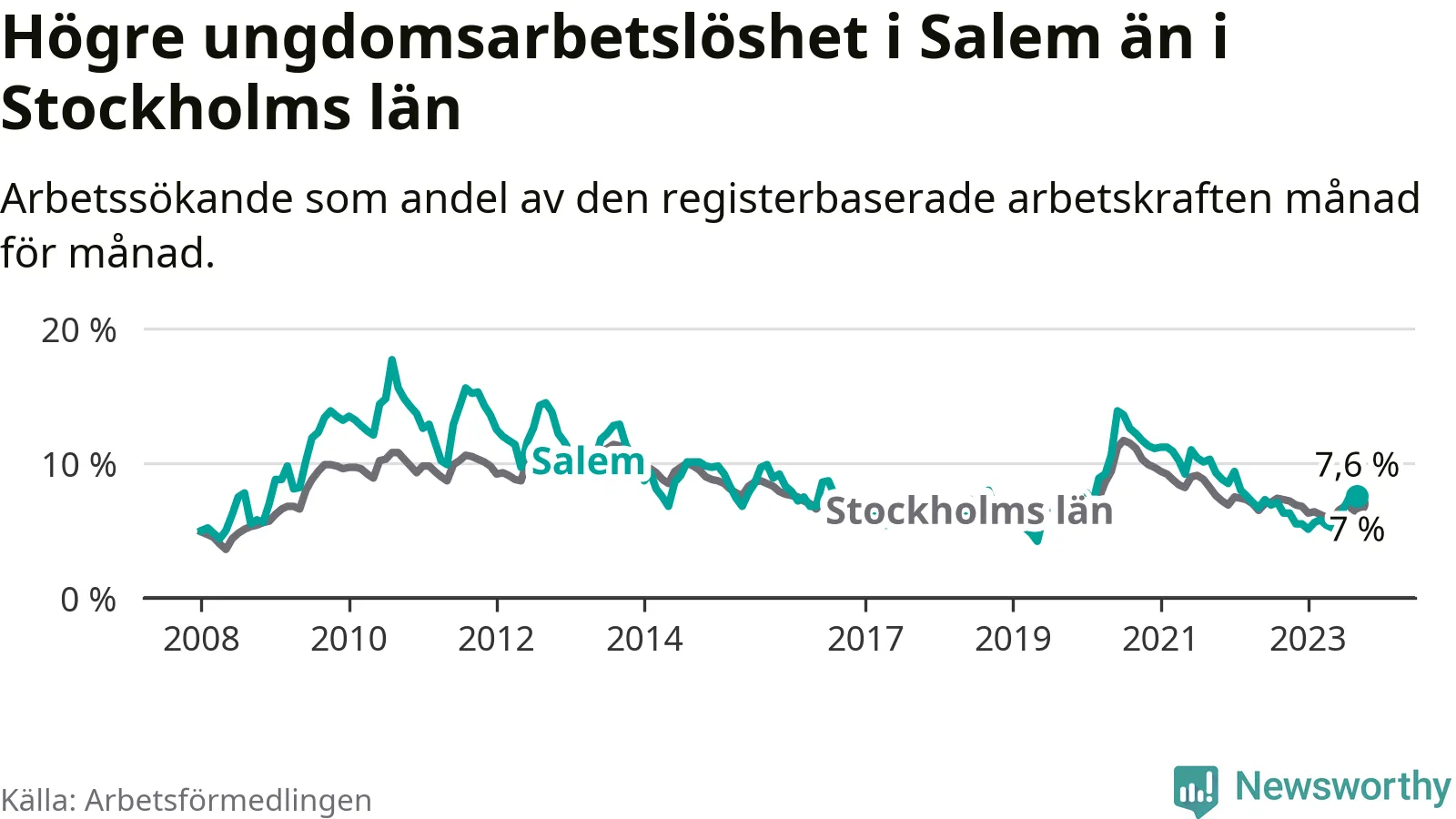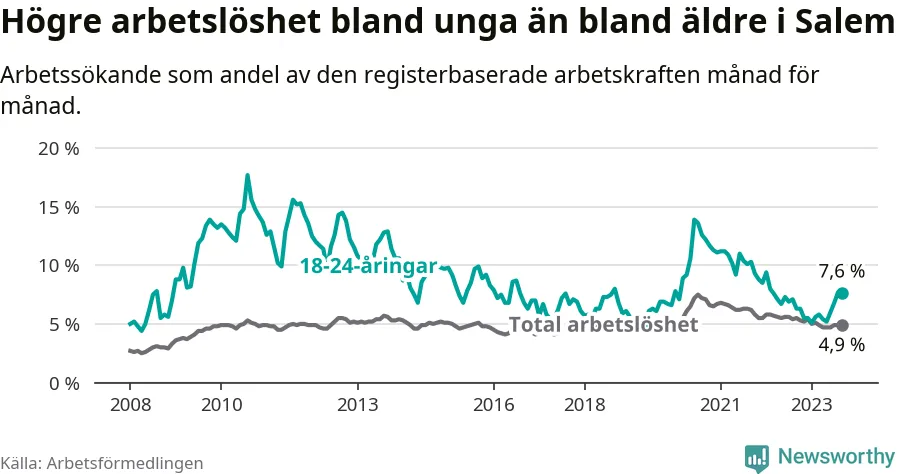 Medan Salem har lägre total arbetslöshet än Stockholms län, ligger ungdomsarbetslösheten 0,6 procentenheter högre i Salem.
