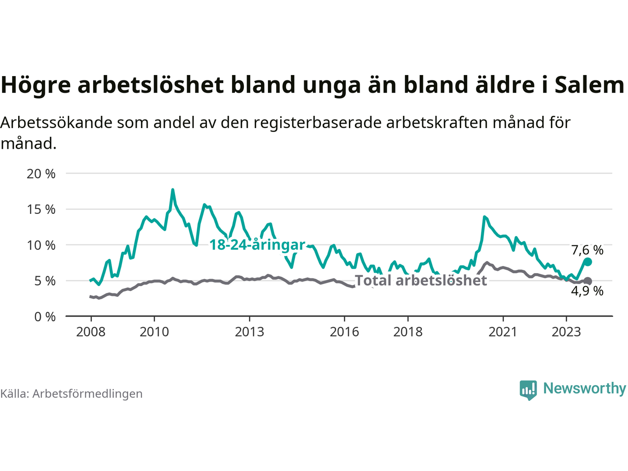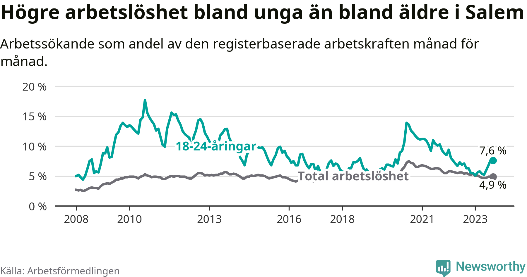 Graf: Skillnad i arbetslöshet mellan unga och hela befolkningen i Salems kommun