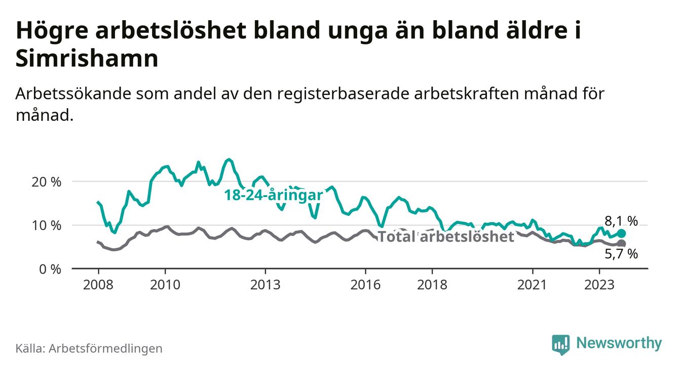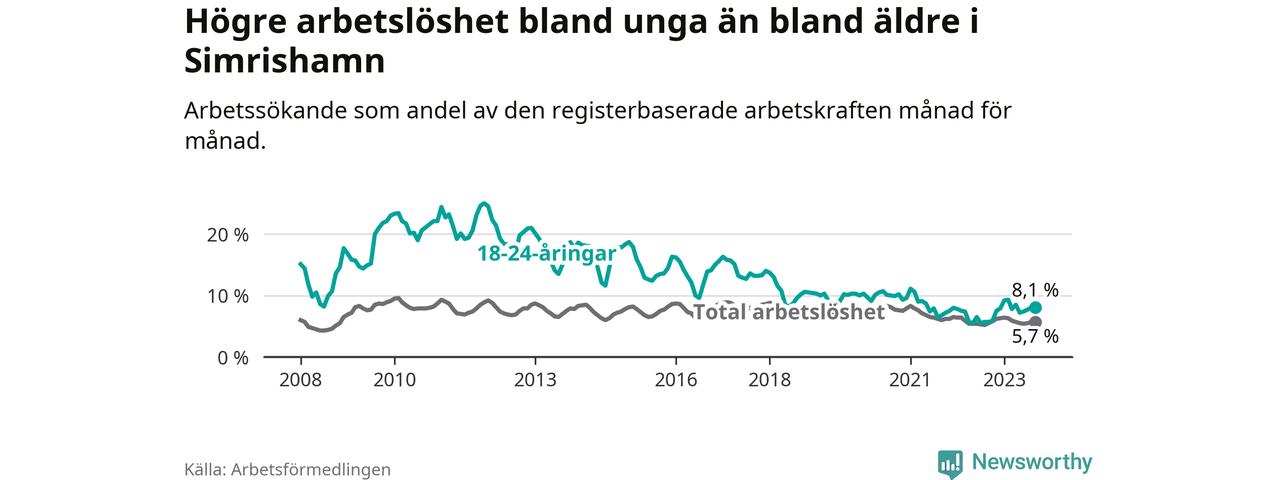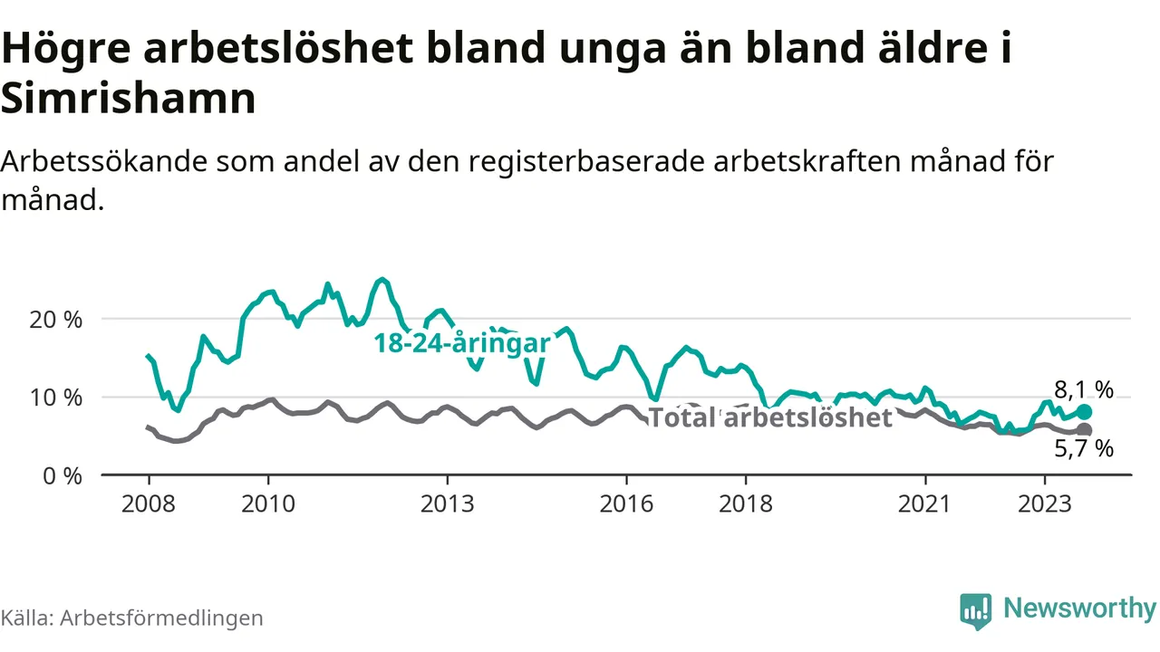 I och med den senaste månadens uppgång har de ungas arbetslöshet i Simrishamn stigit nio månader i följd (upp från 7,9 procent i december 2022 till 8,1 procent nu).