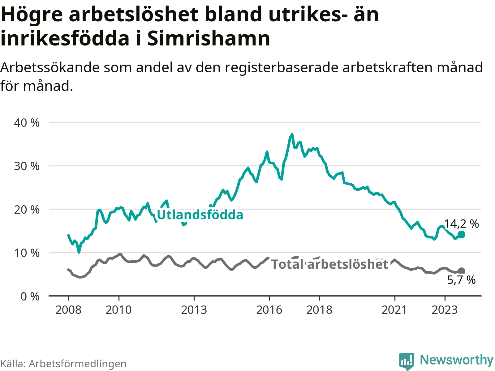 Arbetslösheten bland utlandsfödda var 14,2 procent i Simrishamn under september månad, motsvarande 181 av 1 275 personer. Det är 0,6 procentenheter fler än vid samma tidpunkt i fjol (+17 om man räknar personer).