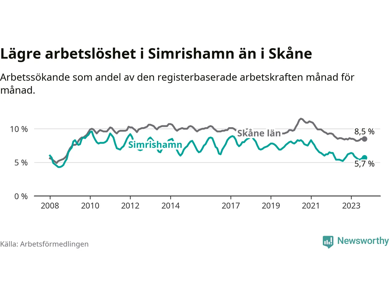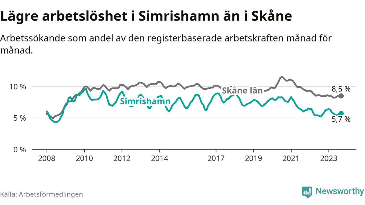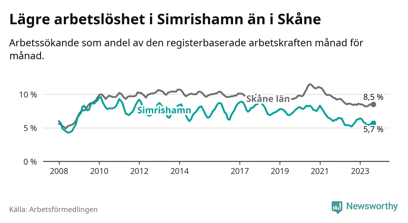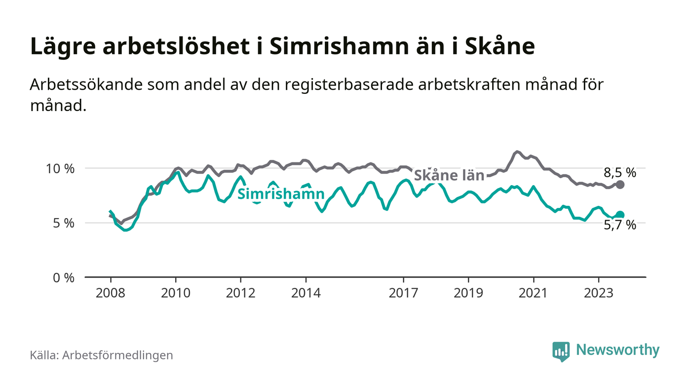 Även om arbetslösheten i Simrishamn alltså ökar, så ligger den fortfarande under snittet i hela Skåne län (5,7 procent i kommunen, jämfört med 8,5 procent i hela länet). Vellinge har den lägsta arbetslösheten i länet (3,3 procent), medan Malmö har den högsta (12,2 procent). För att Simrishamn skulle komma ner i samma arbetslöshetsnivå som Vellinge skulle 194 personer behöva sysselsättas.