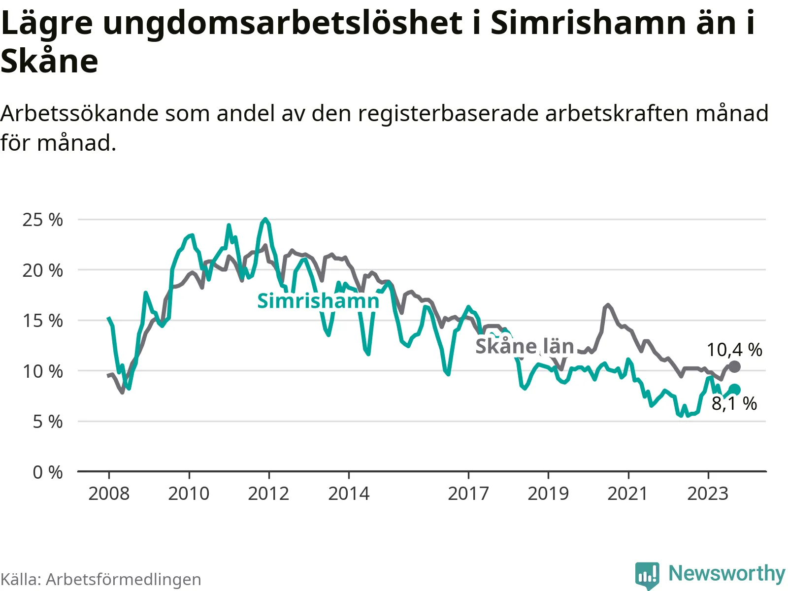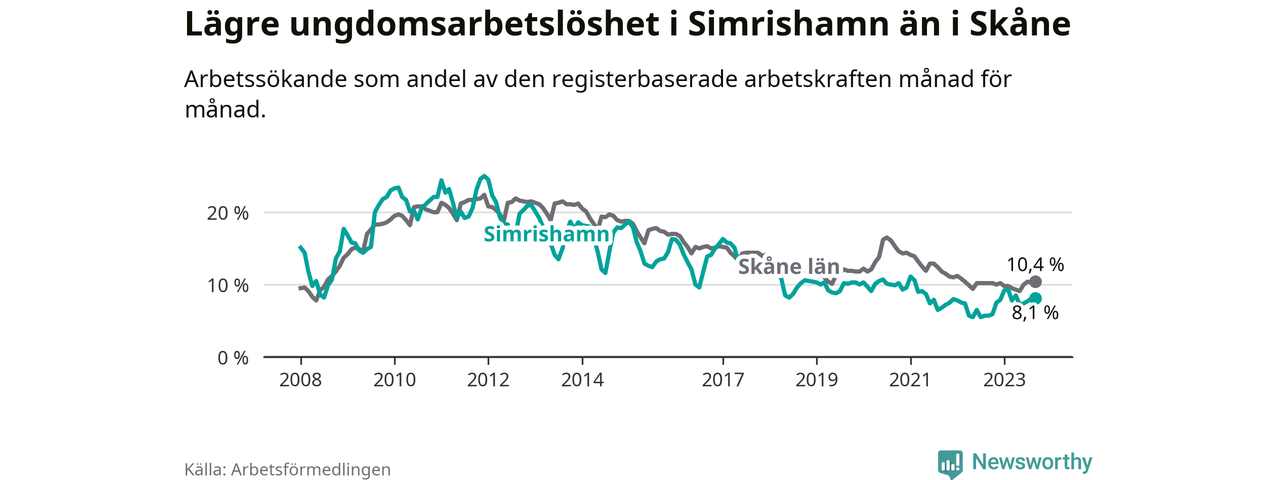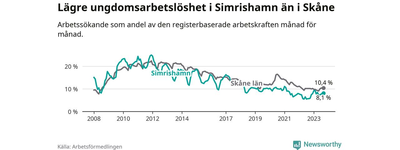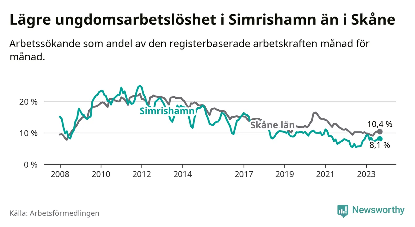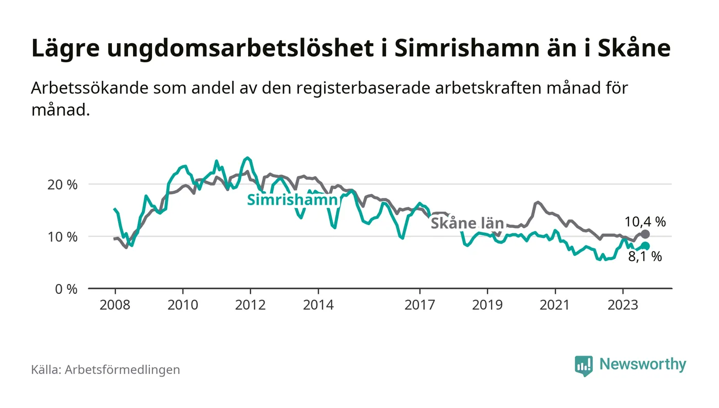 Precis som den totala arbetslösheten ligger ungdomsarbetslösheten i Simrishamn lägre än i Skåne som helhet. Skillnaden mellan kommunen och länet är 2,3 procentenheter.