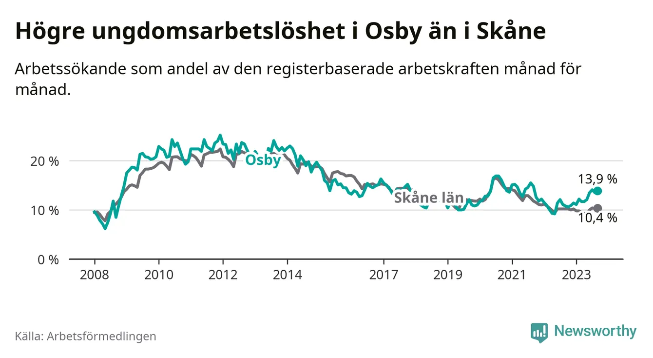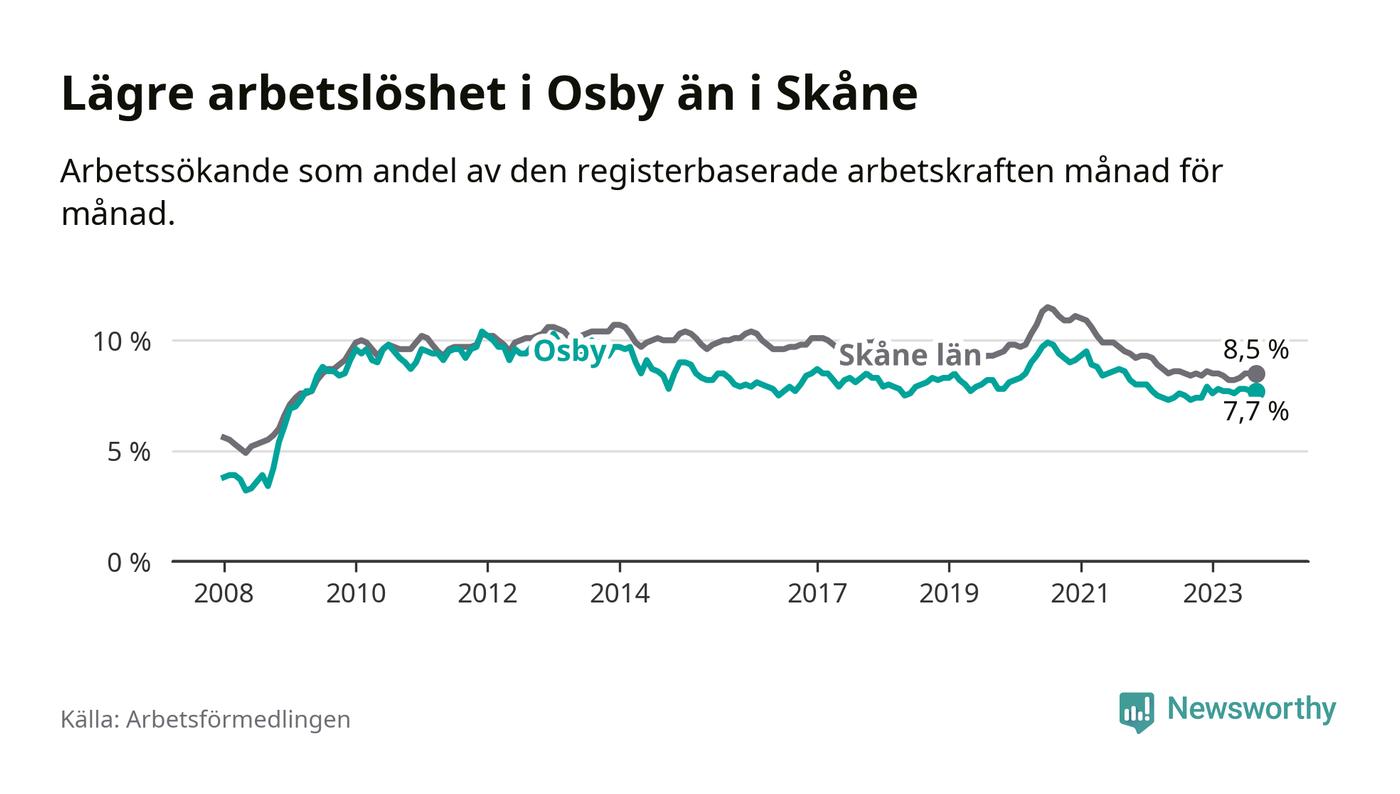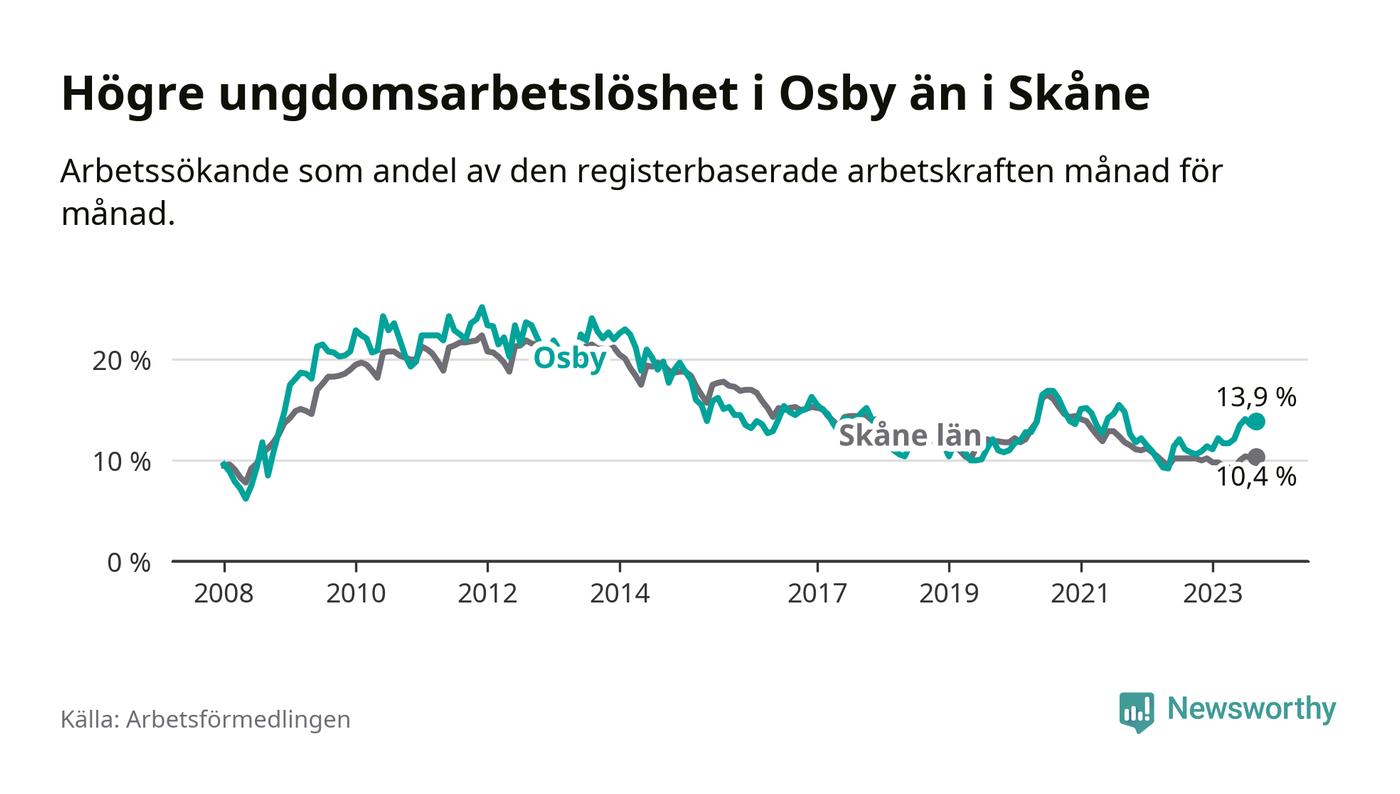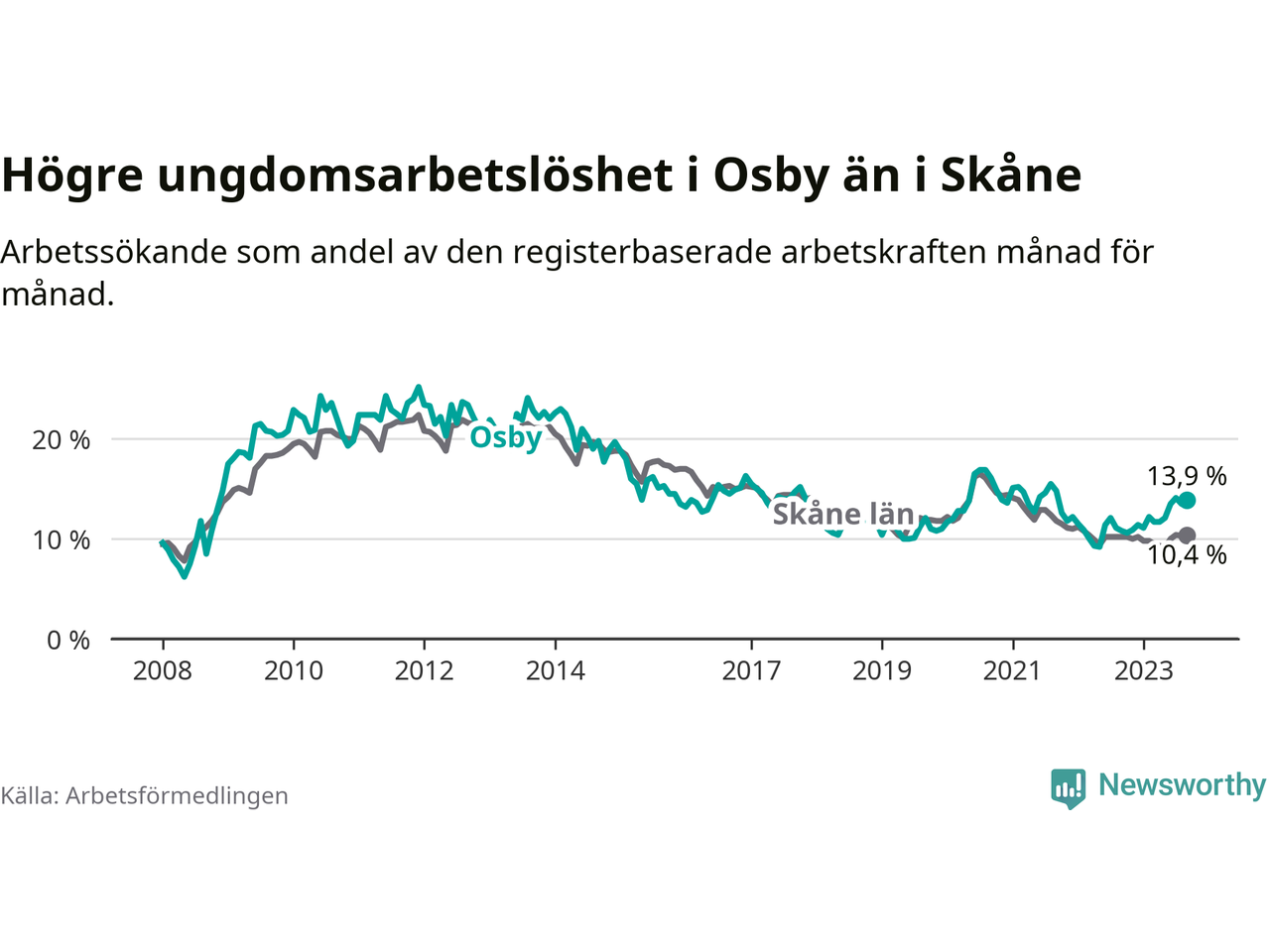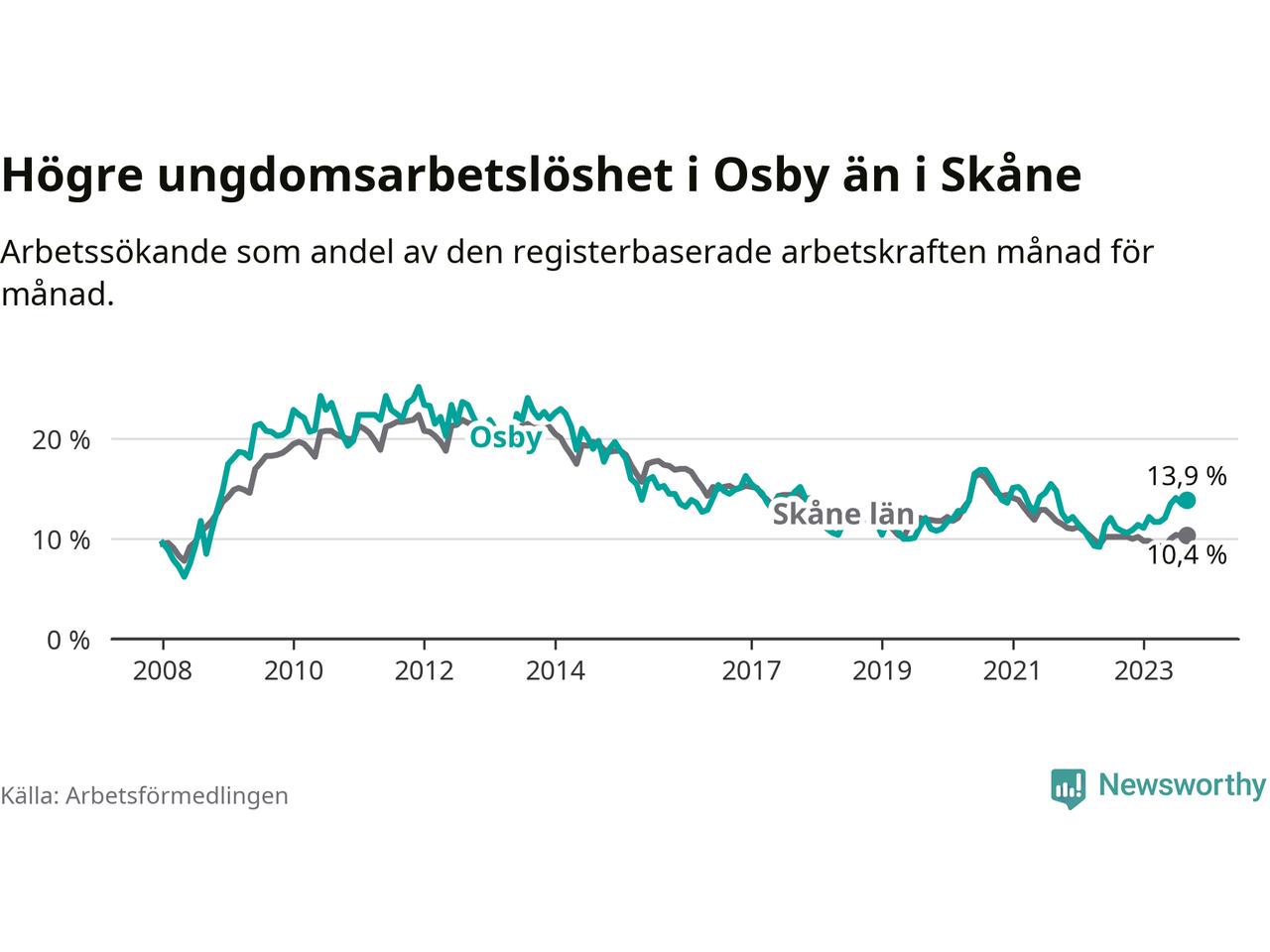 Medan Osby har lägre total arbetslöshet än Skåne, ligger ungdomsarbetslösheten 3,5 procentenheter högre i Osby.