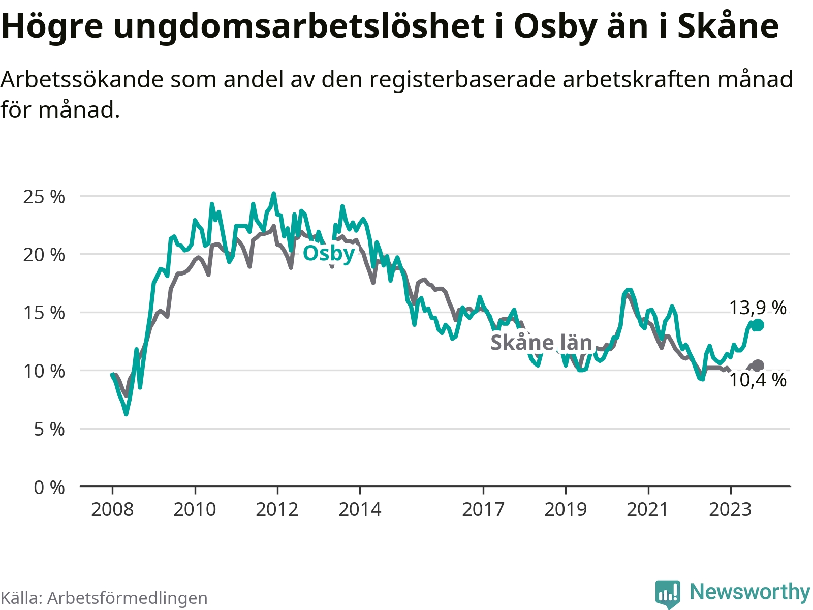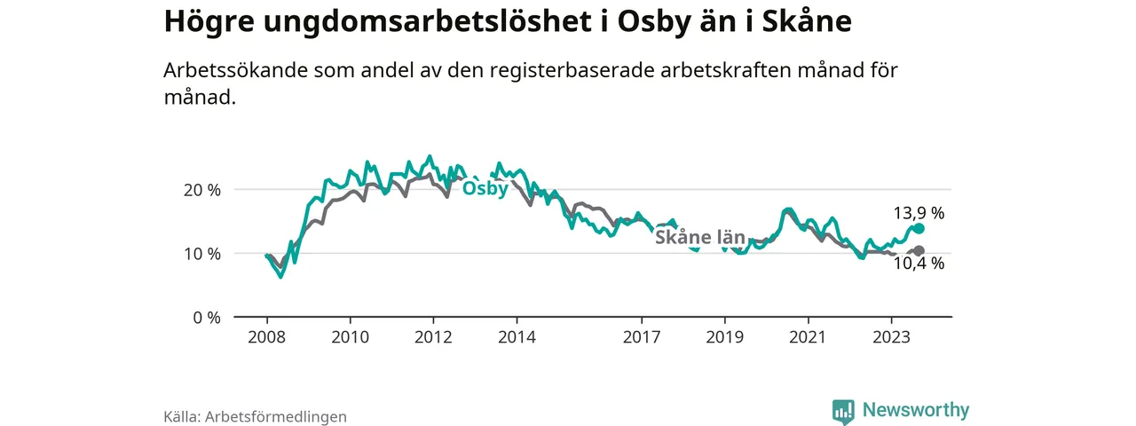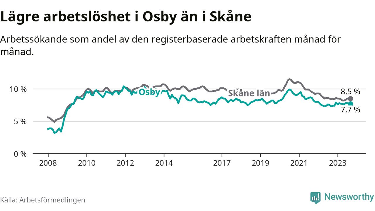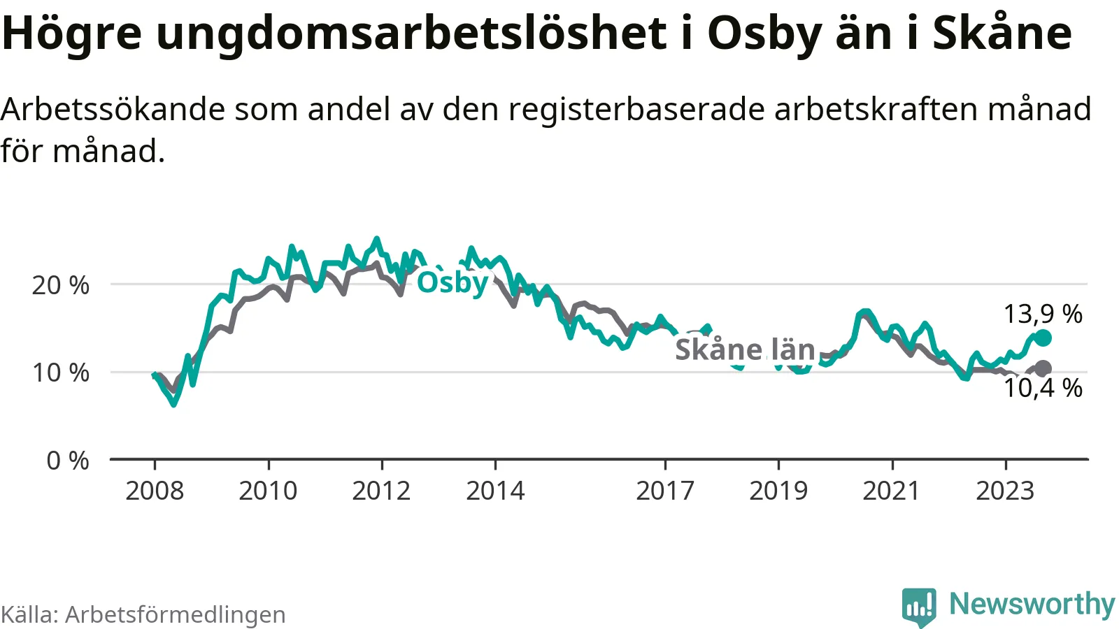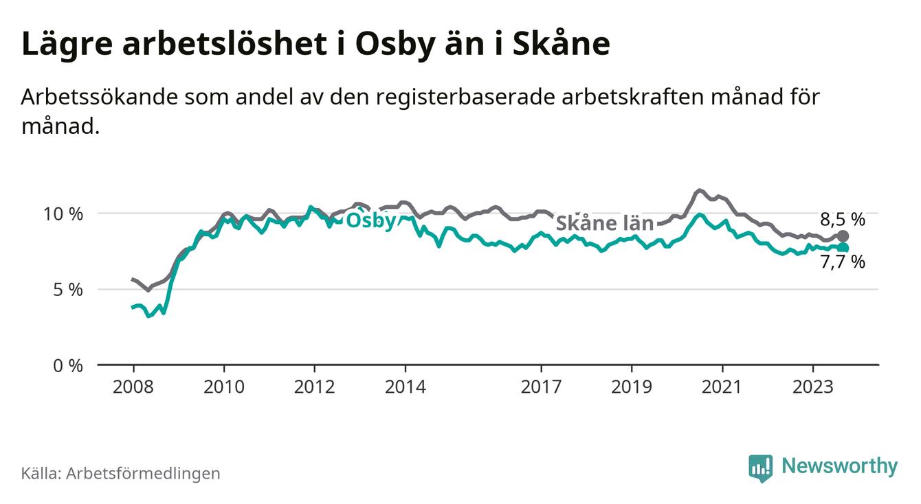 Medan Osby har lägre total arbetslöshet än Skåne, ligger ungdomsarbetslösheten 3,5 procentenheter högre i Osby.