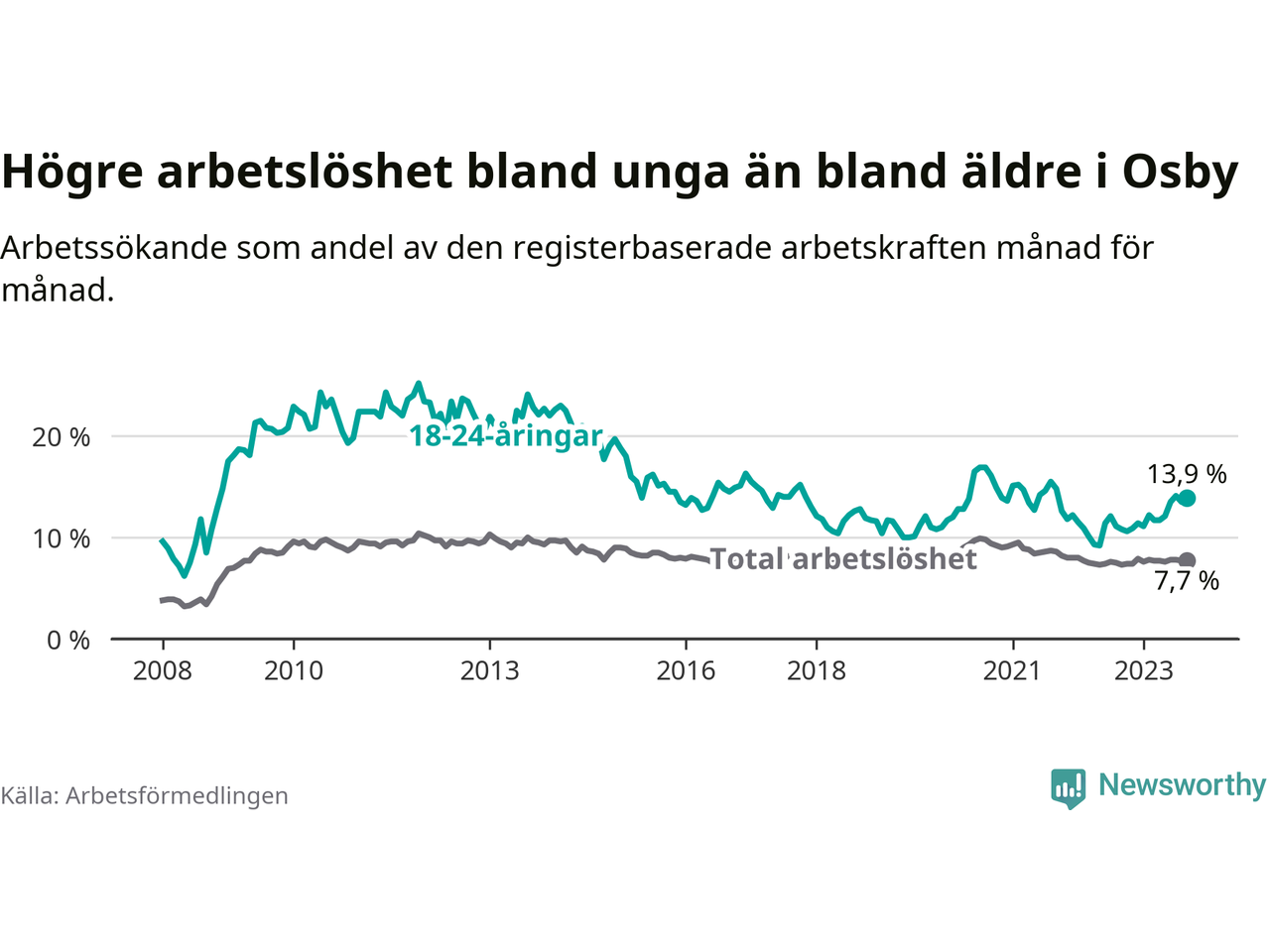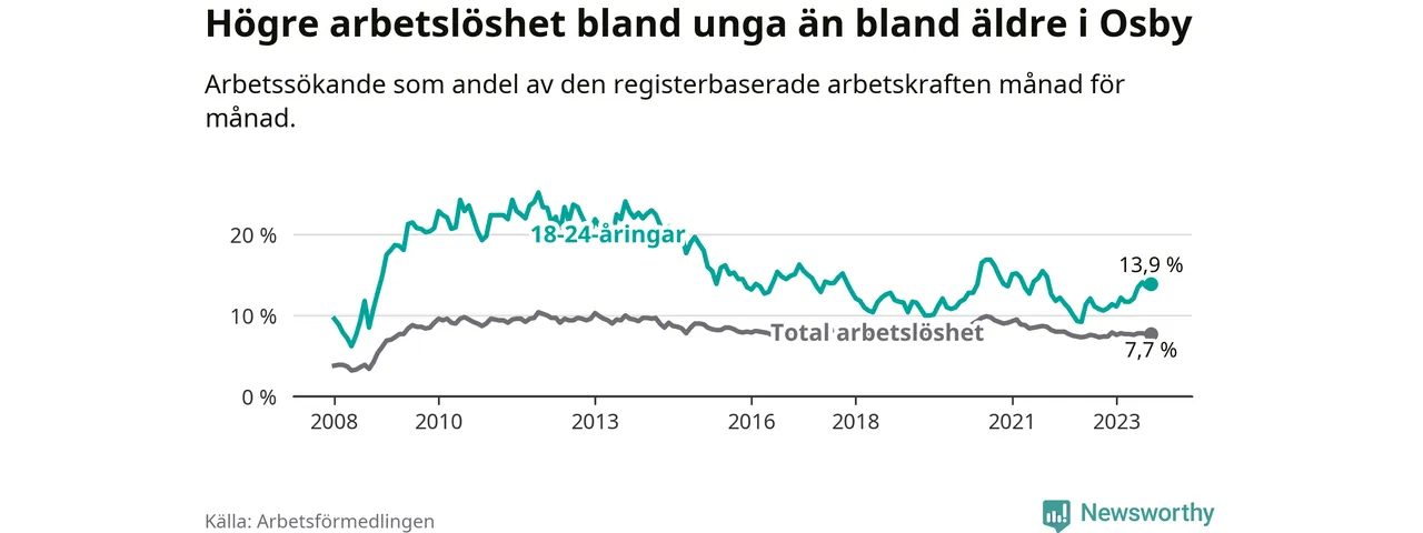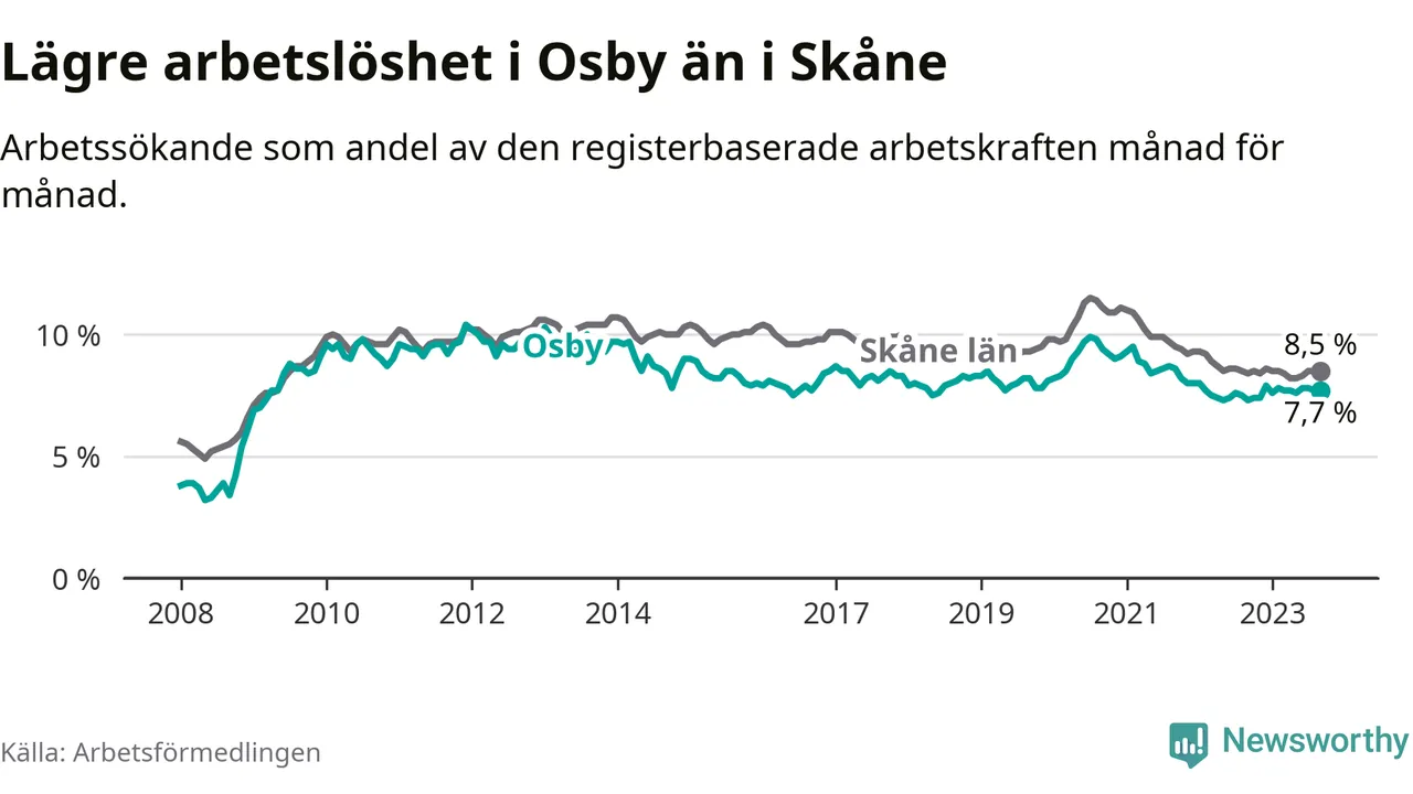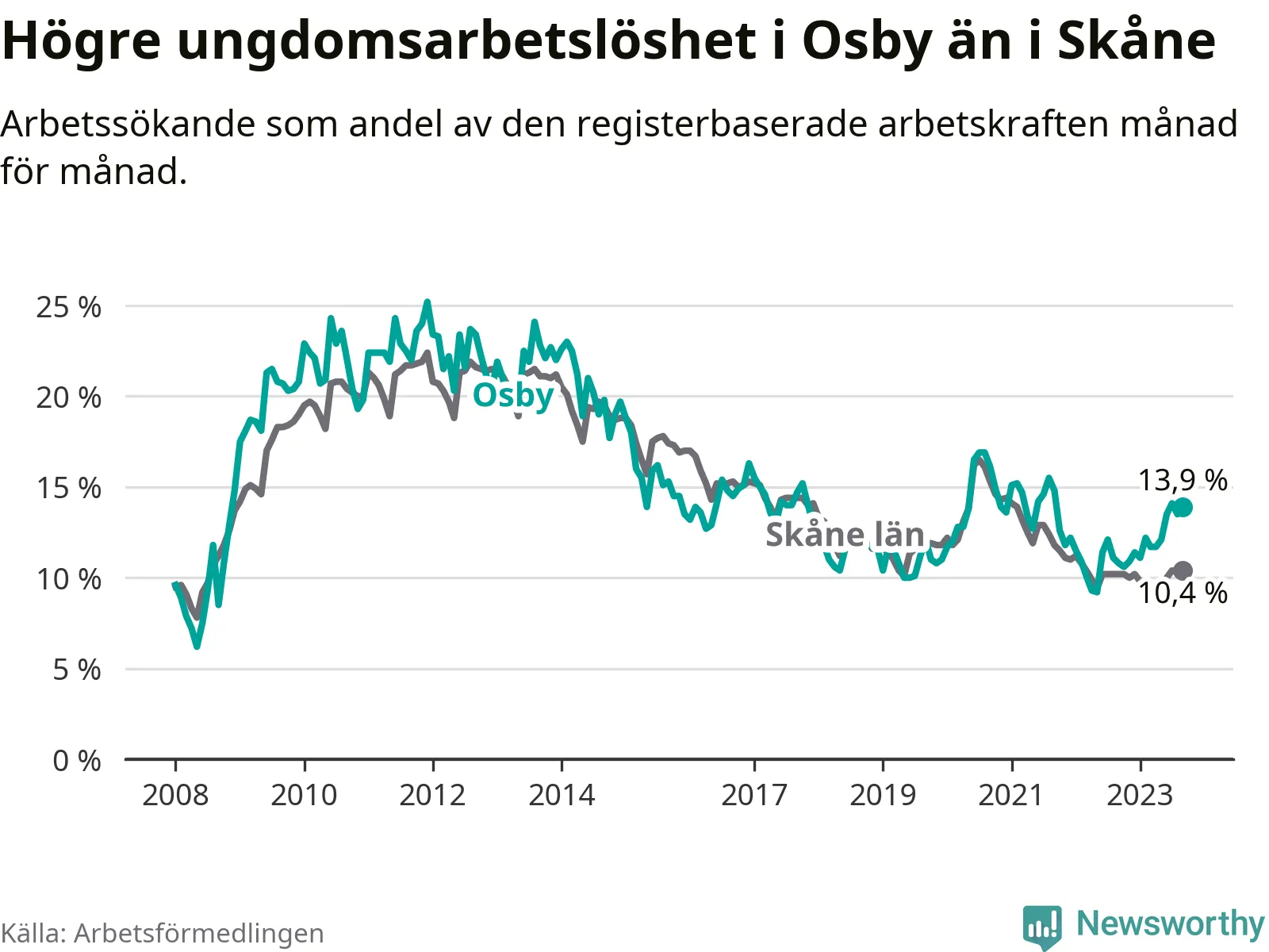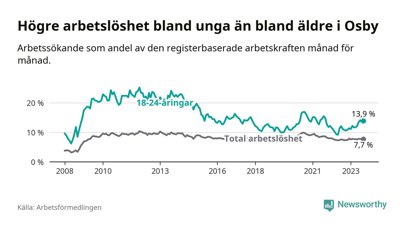 Medan Osby har lägre total arbetslöshet än Skåne, ligger ungdomsarbetslösheten 3,5 procentenheter högre i Osby.