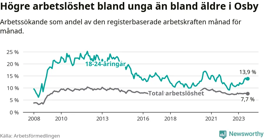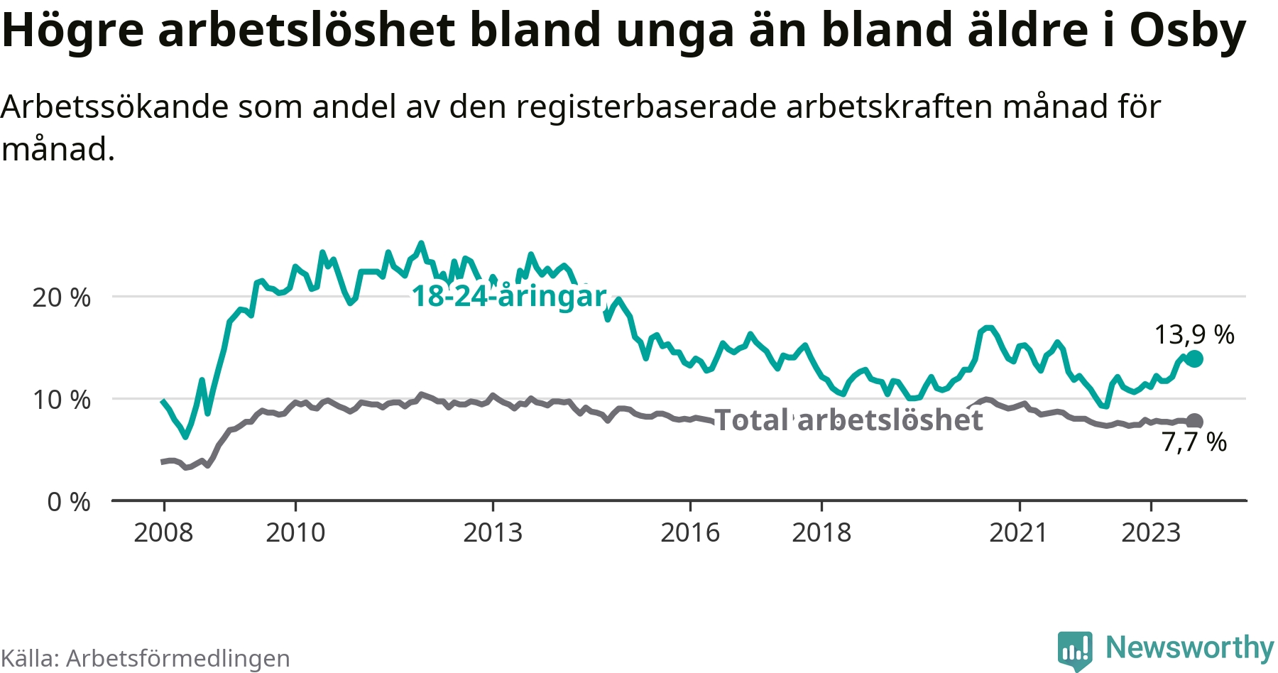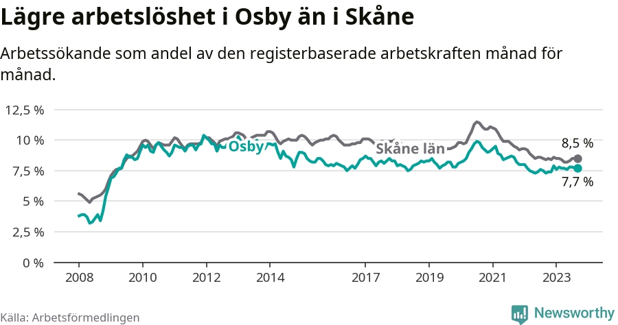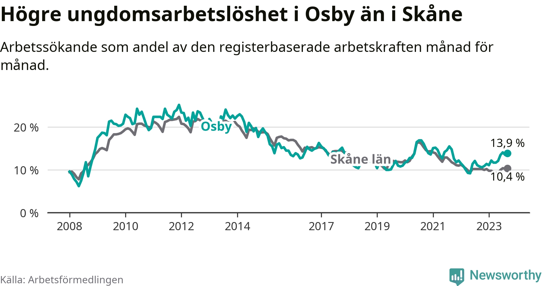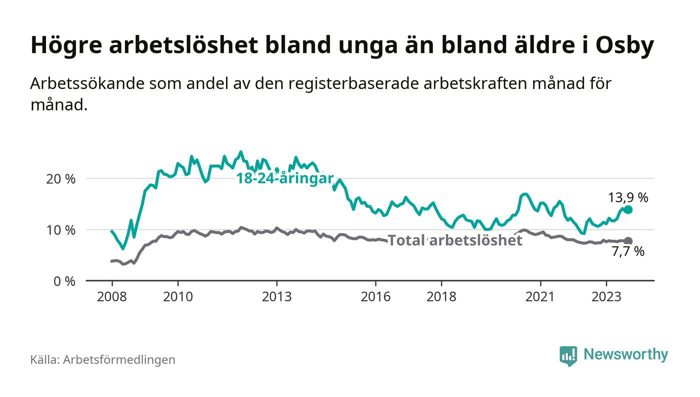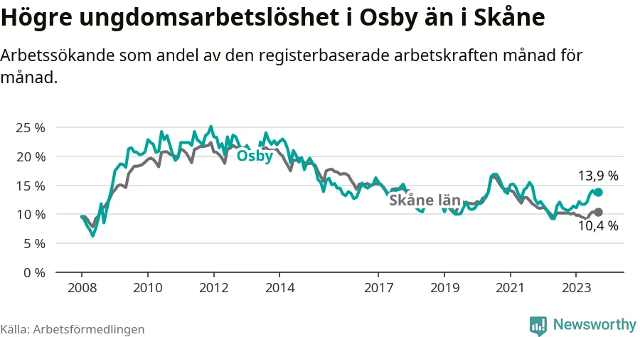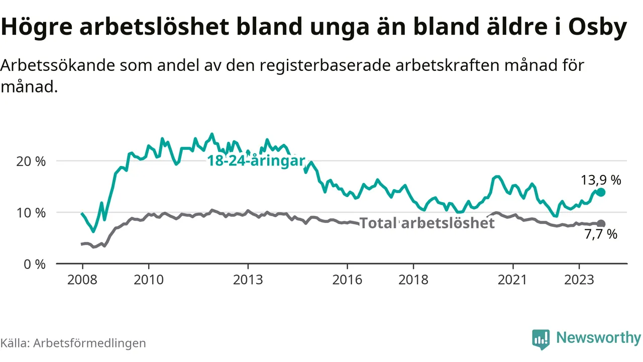 Medan Osby har lägre total arbetslöshet än Skåne, ligger ungdomsarbetslösheten 3,5 procentenheter högre i Osby.