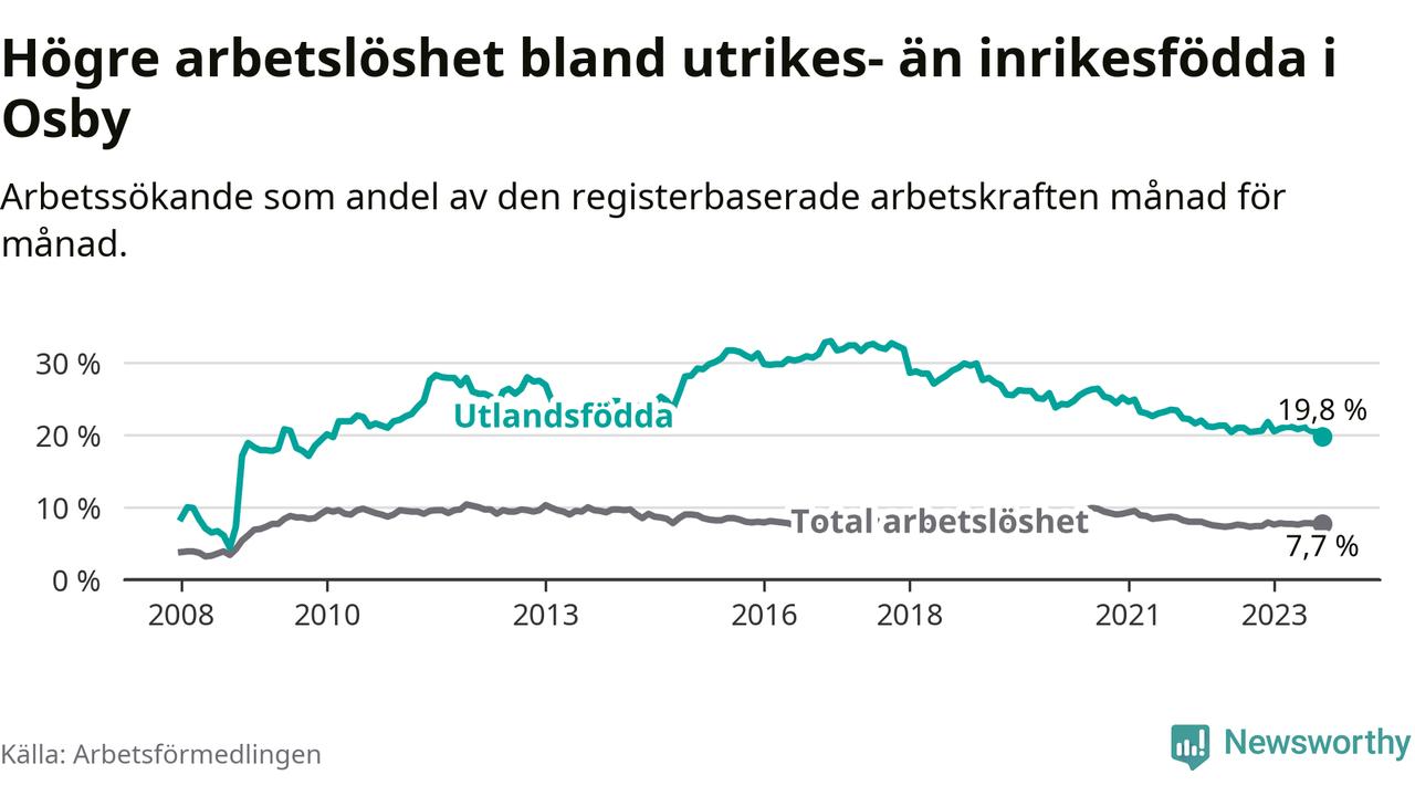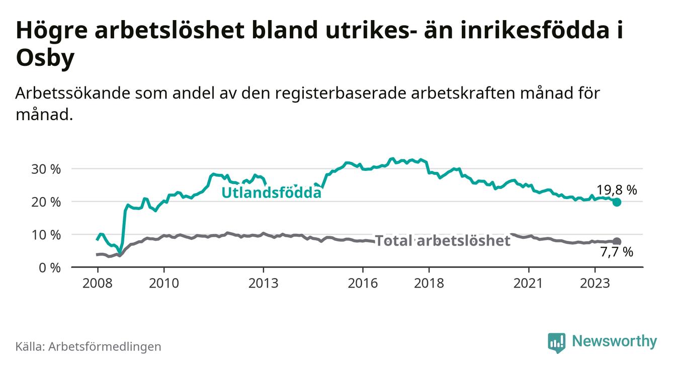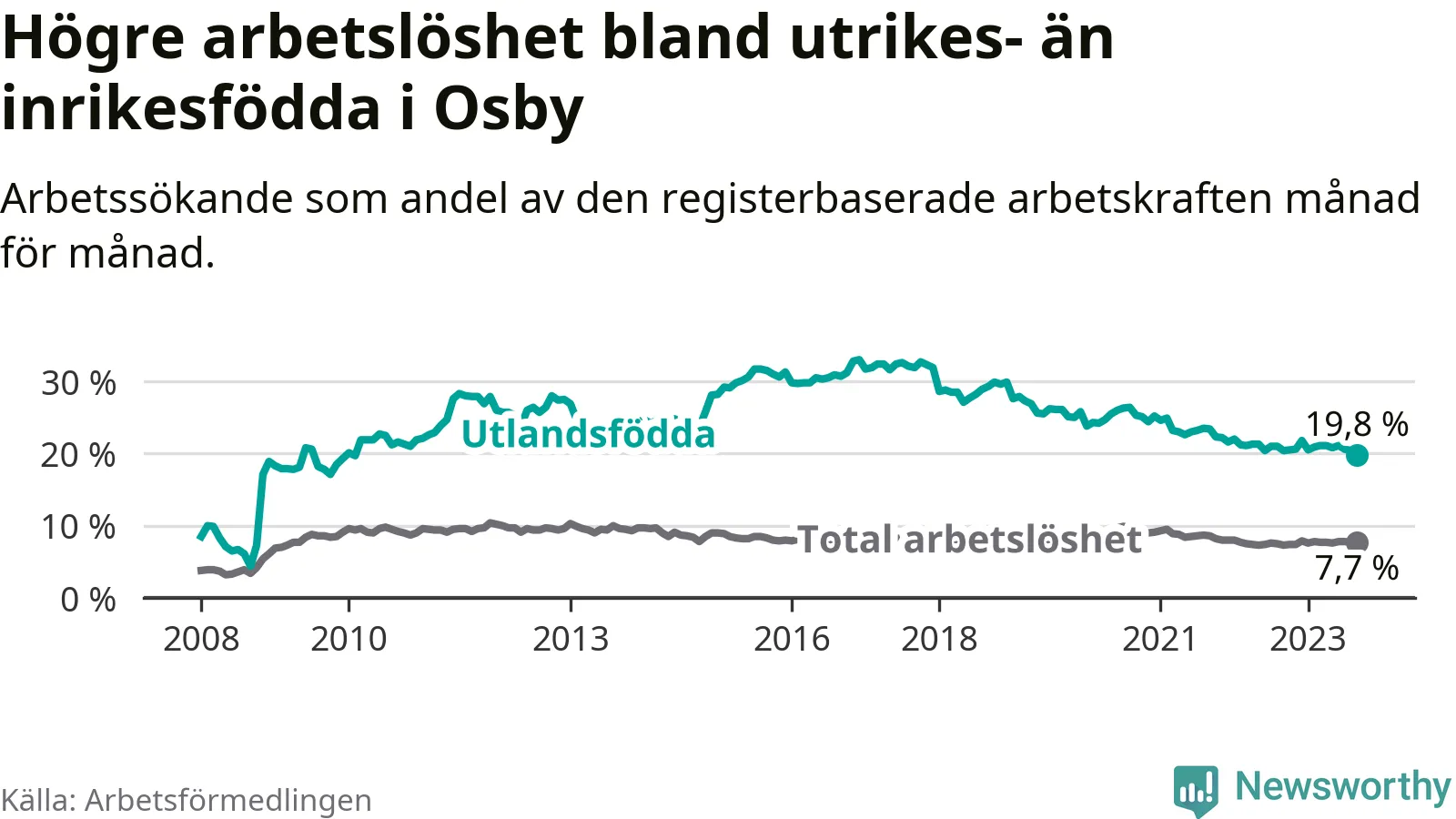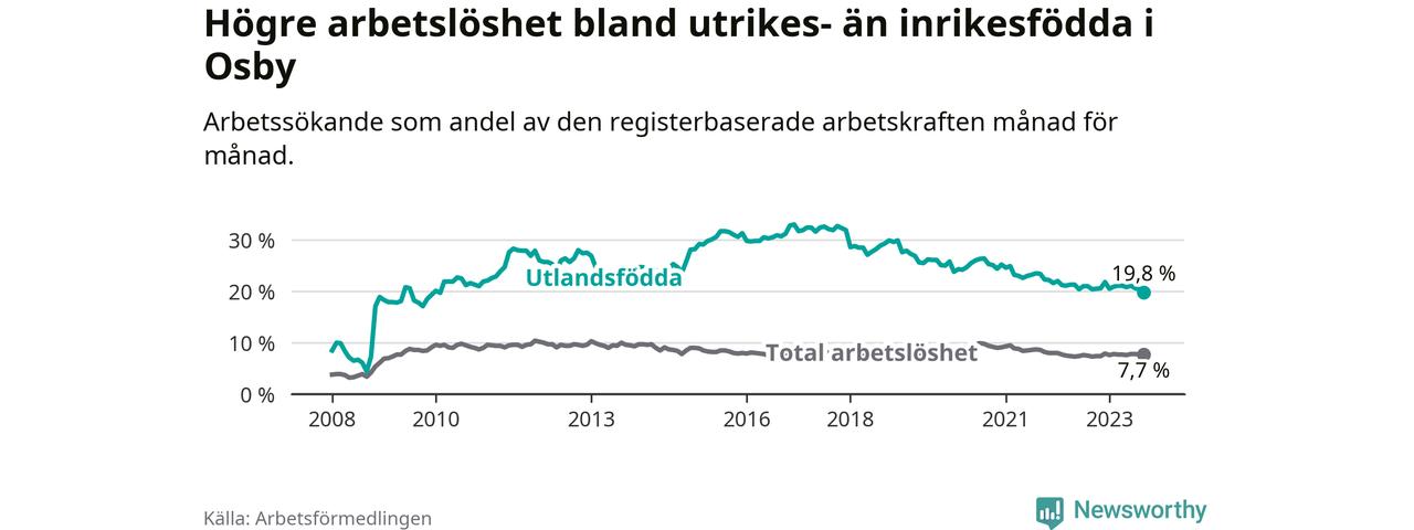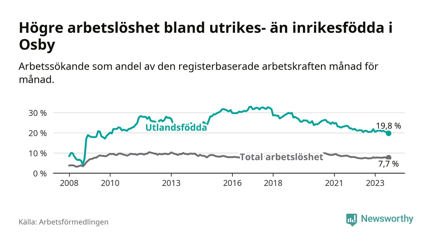 Skillnaden i arbetslöshet mellan utrikesfödda och hela befolkningen är 12,1 procentenheter i Osby. Det är en mindre skillnad än för ett år sedan (−1,0 procentenheter).