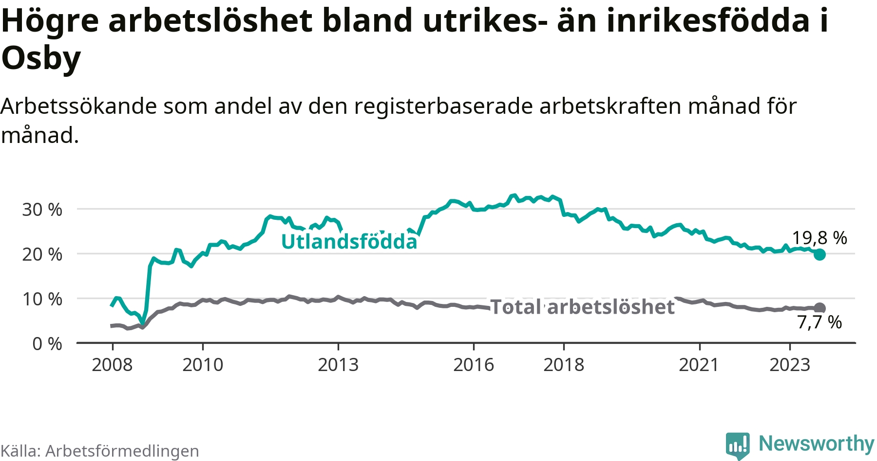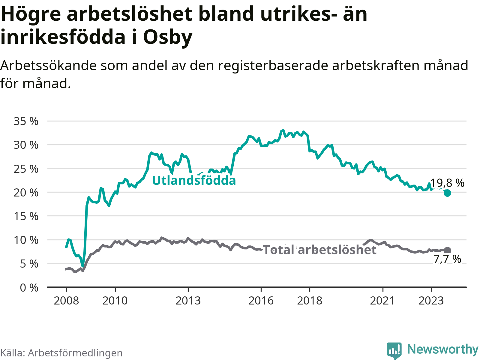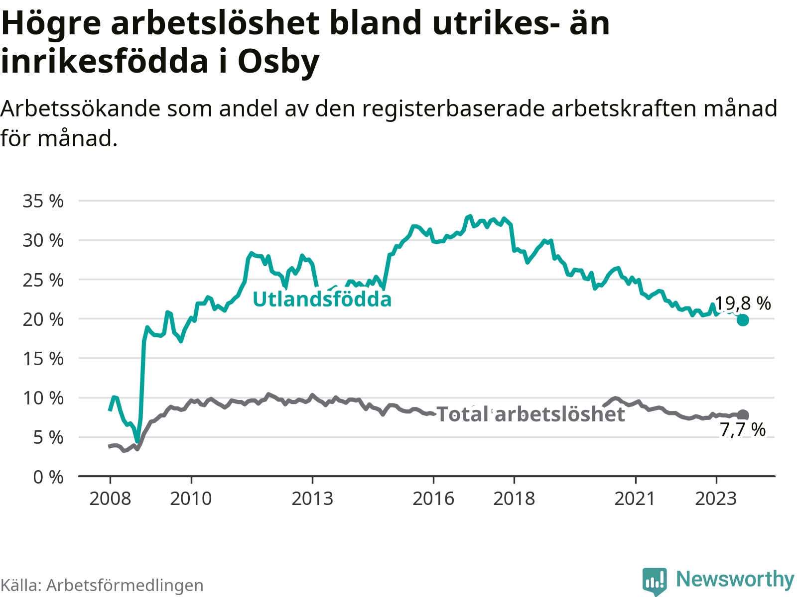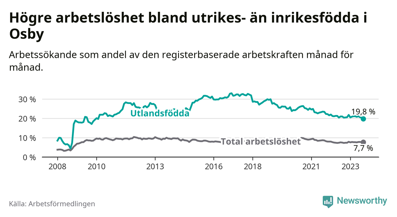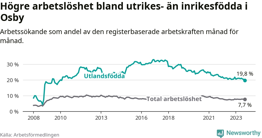 Skillnaden i arbetslöshet mellan utrikesfödda och hela befolkningen är 12,1 procentenheter i Osby. Det är en mindre skillnad än för ett år sedan (−1,0 procentenheter).