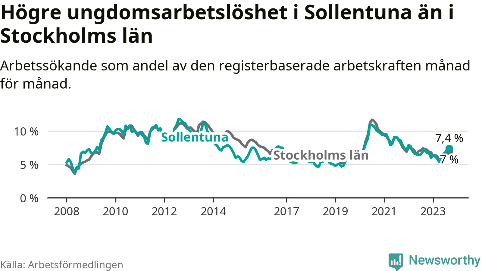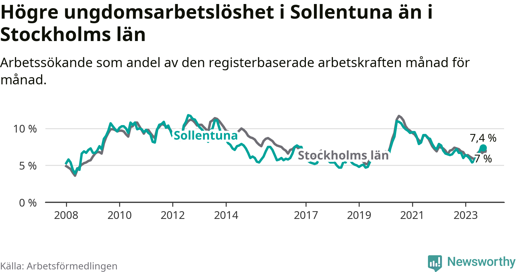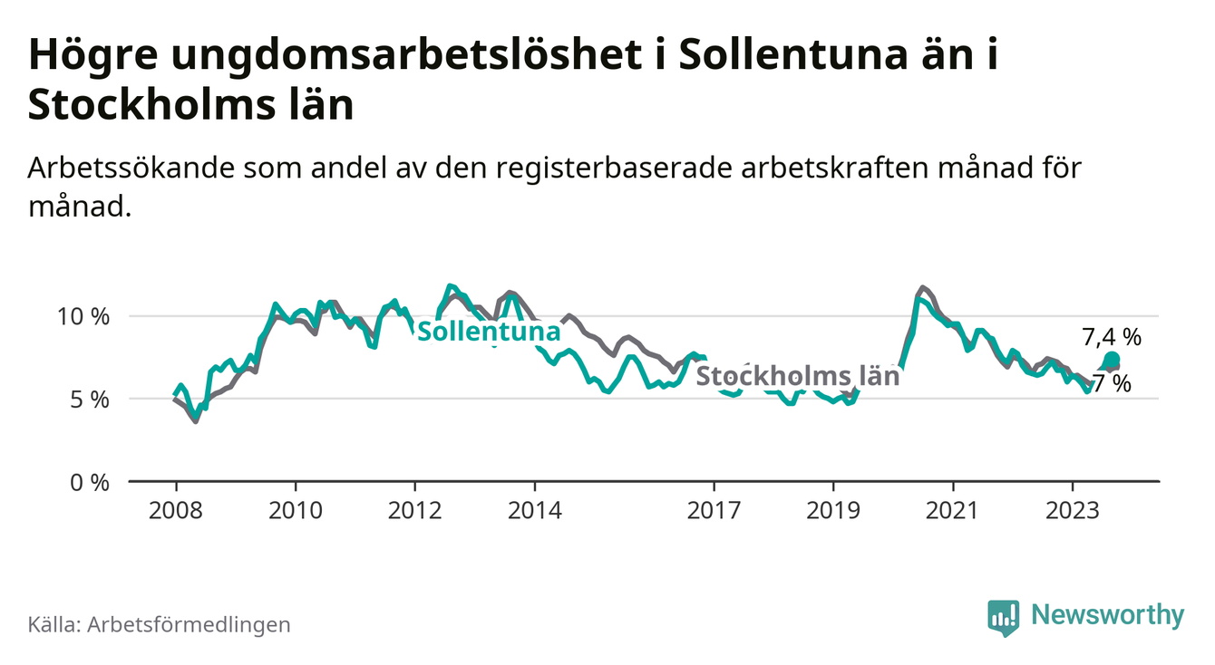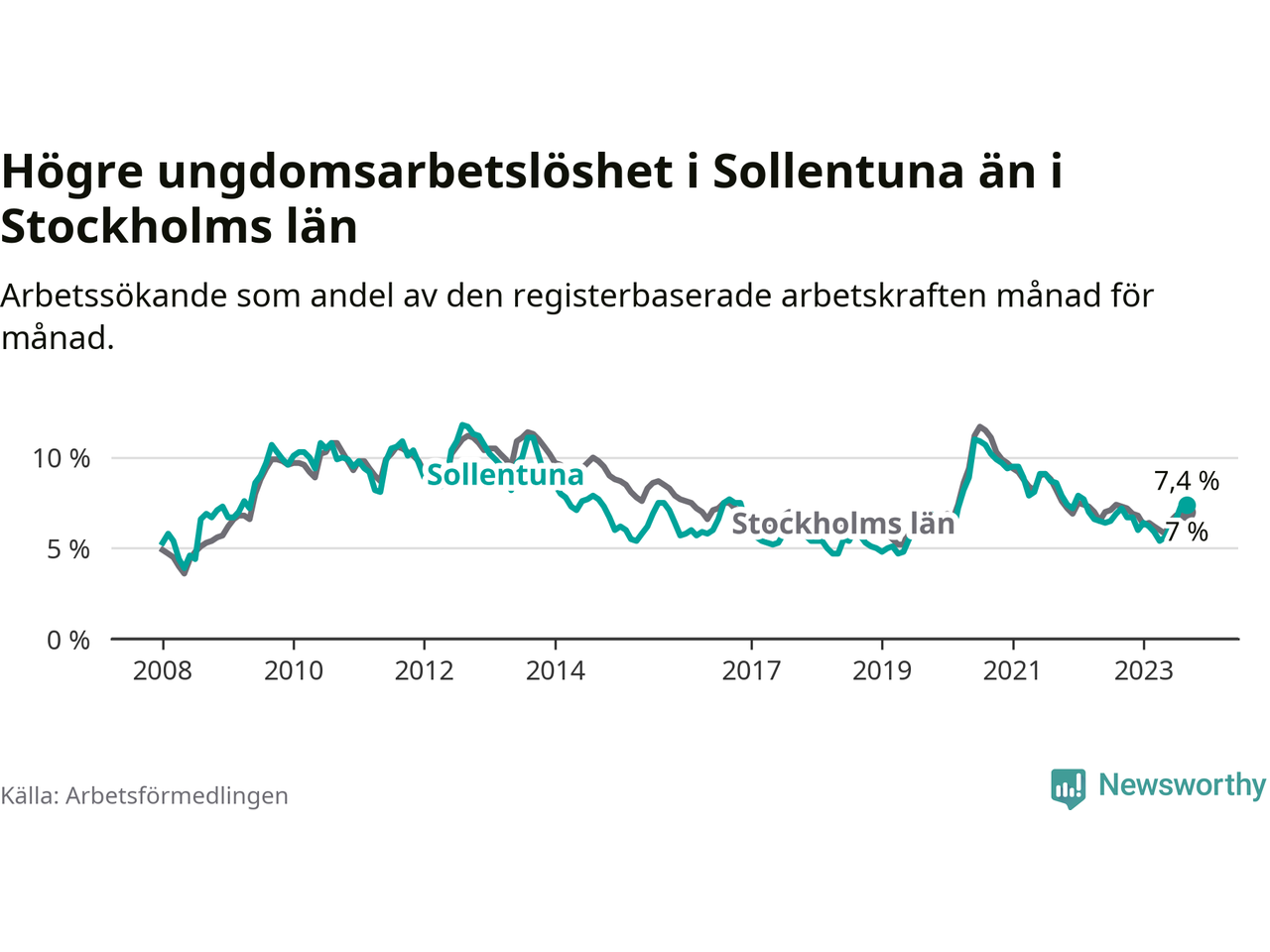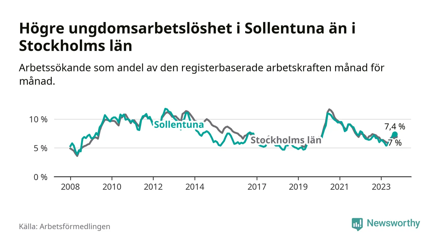 Medan Sollentuna har lägre total arbetslöshet än Stockholms län, ligger ungdomsarbetslösheten 0,4 procentenheter högre i Sollentuna.