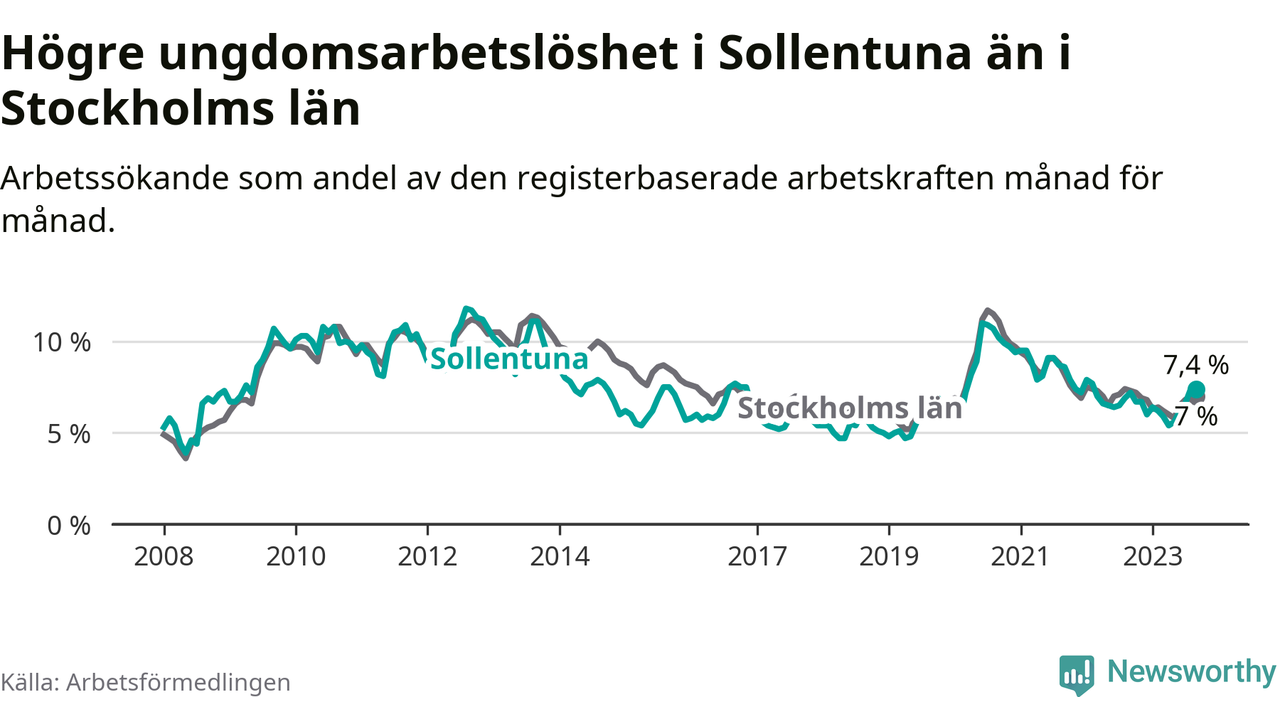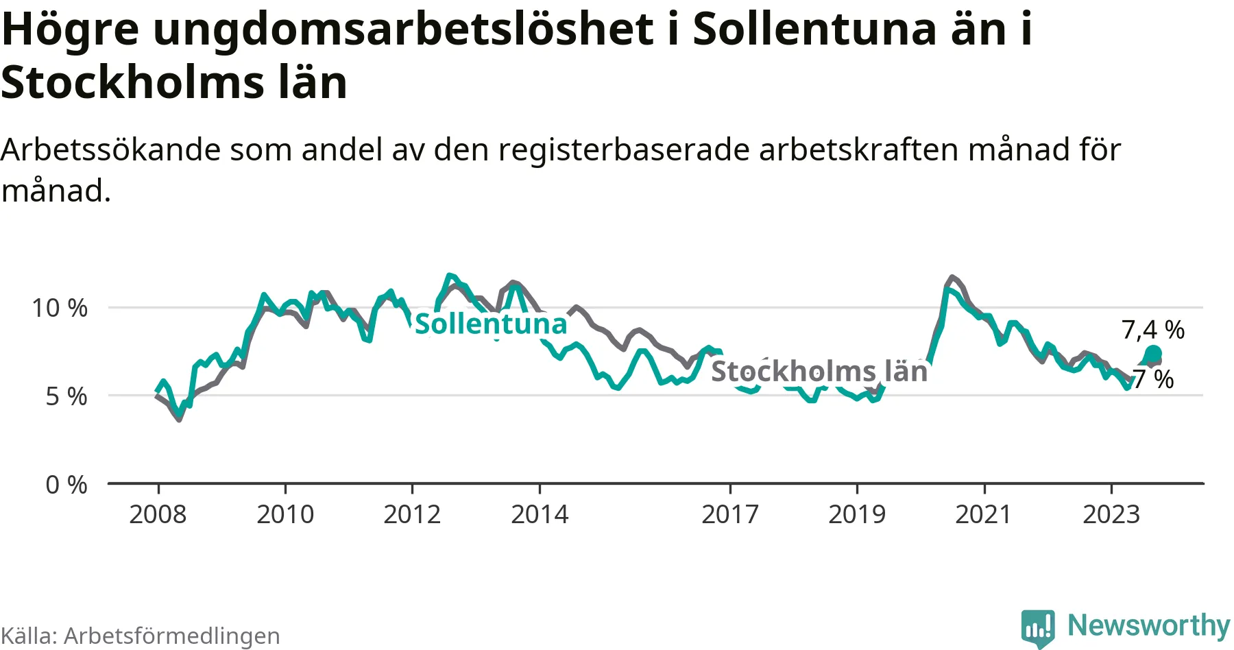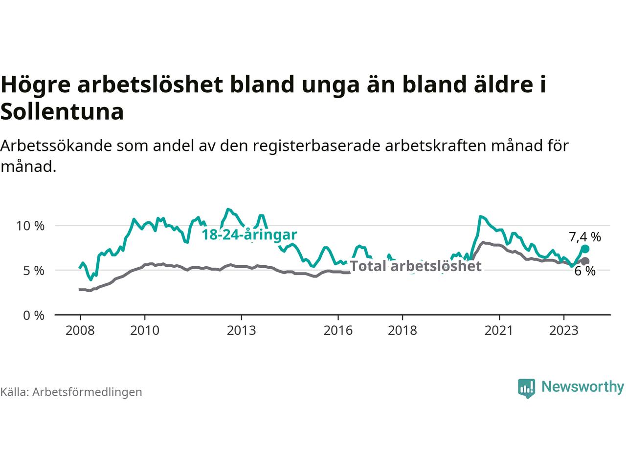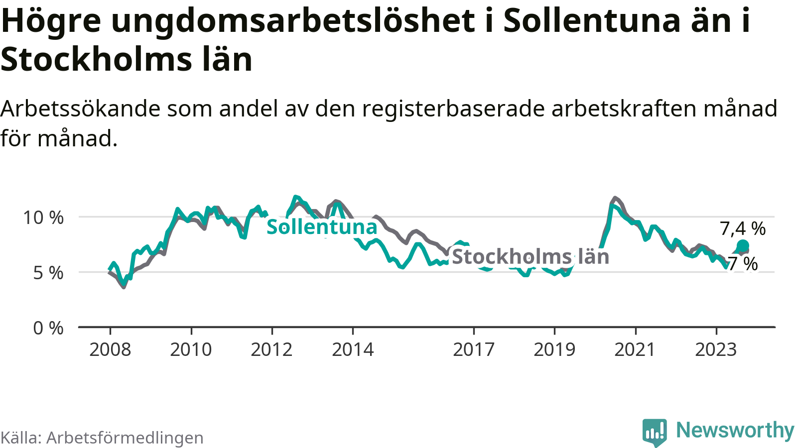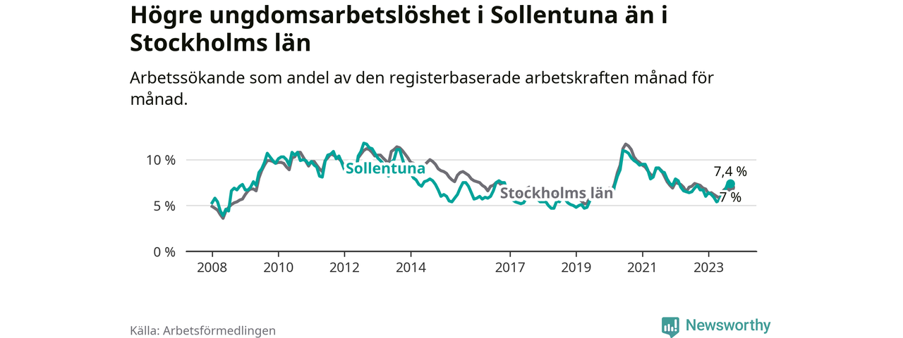 Medan Sollentuna har lägre total arbetslöshet än Stockholms län, ligger ungdomsarbetslösheten 0,4 procentenheter högre i Sollentuna.