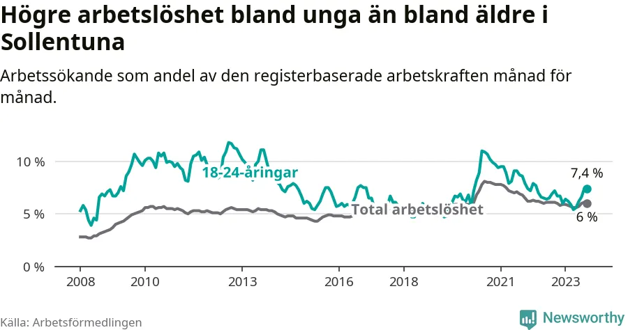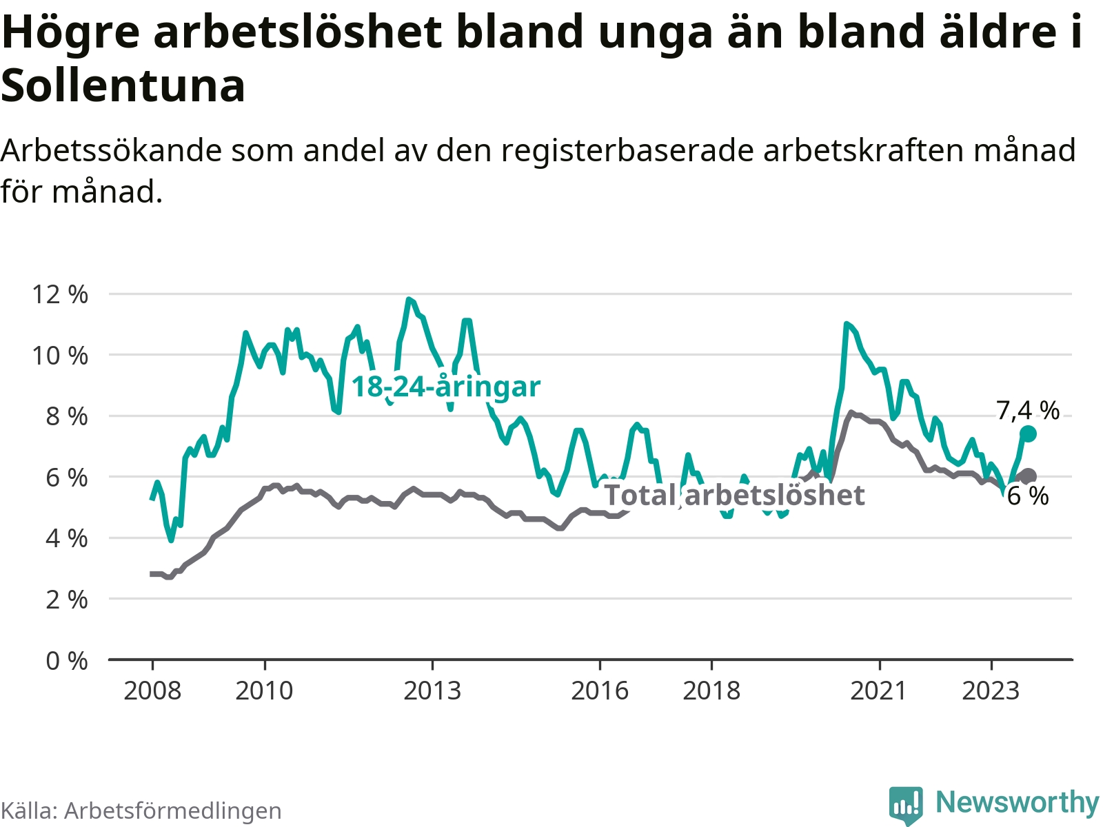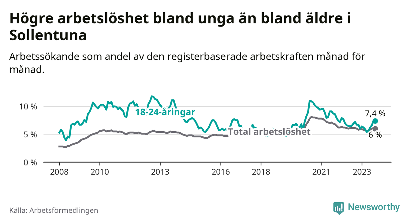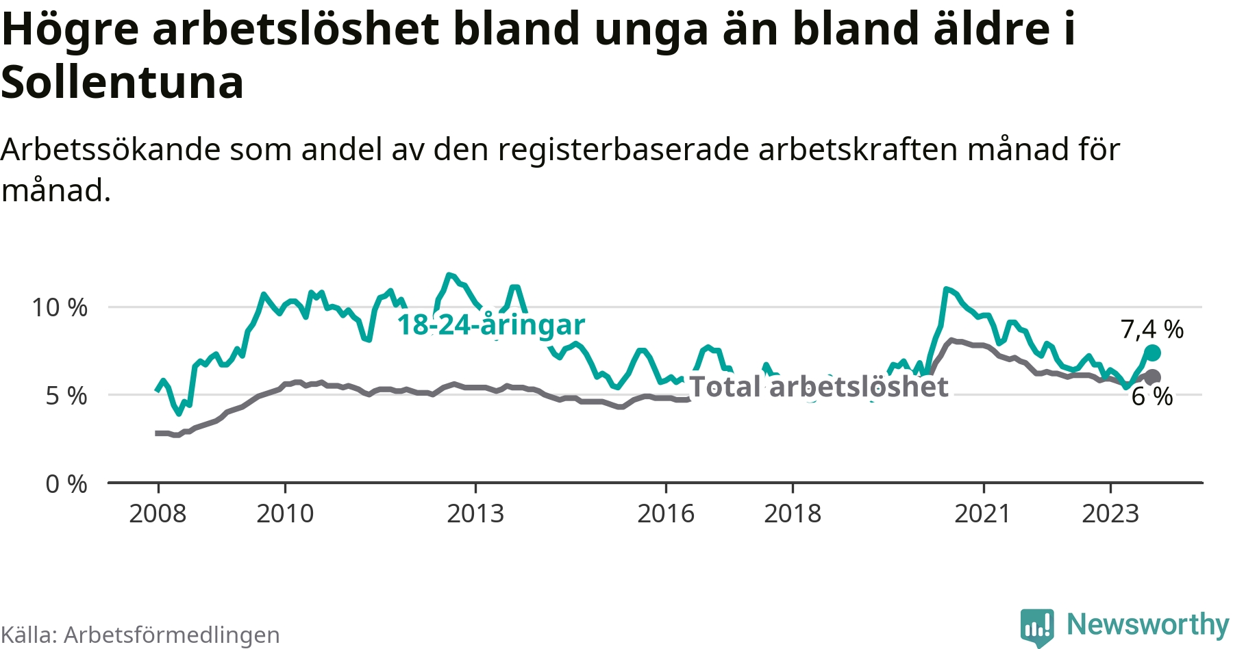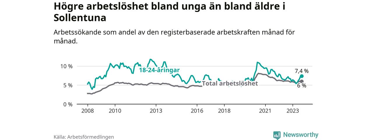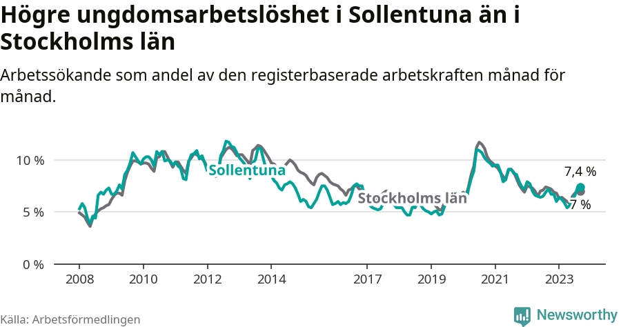 Medan Sollentuna har lägre total arbetslöshet än Stockholms län, ligger ungdomsarbetslösheten 0,4 procentenheter högre i Sollentuna.