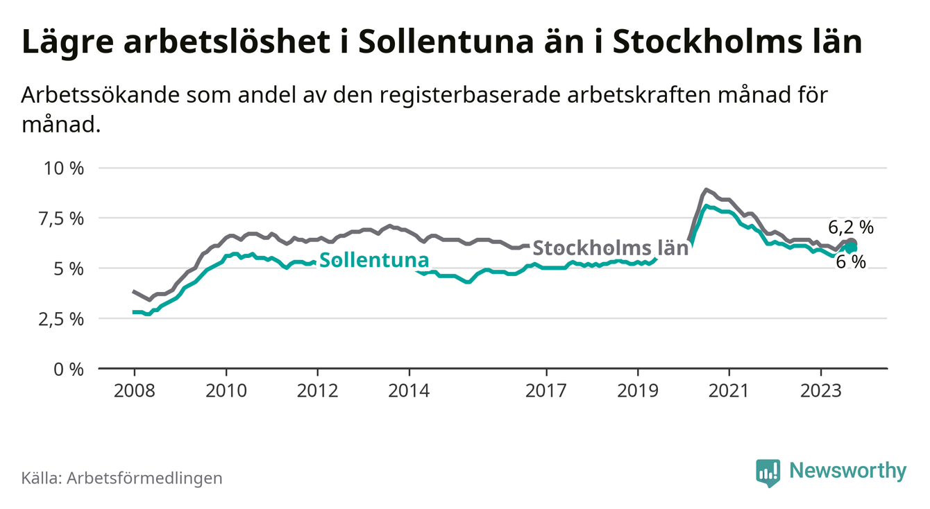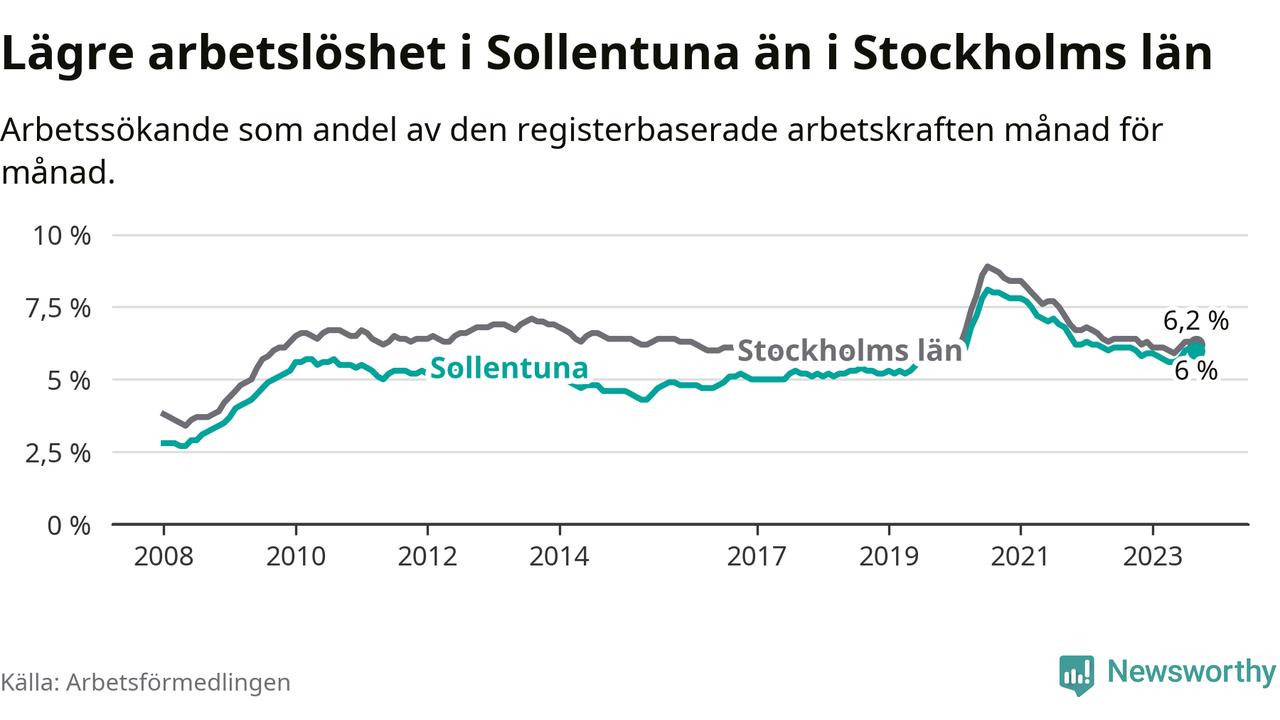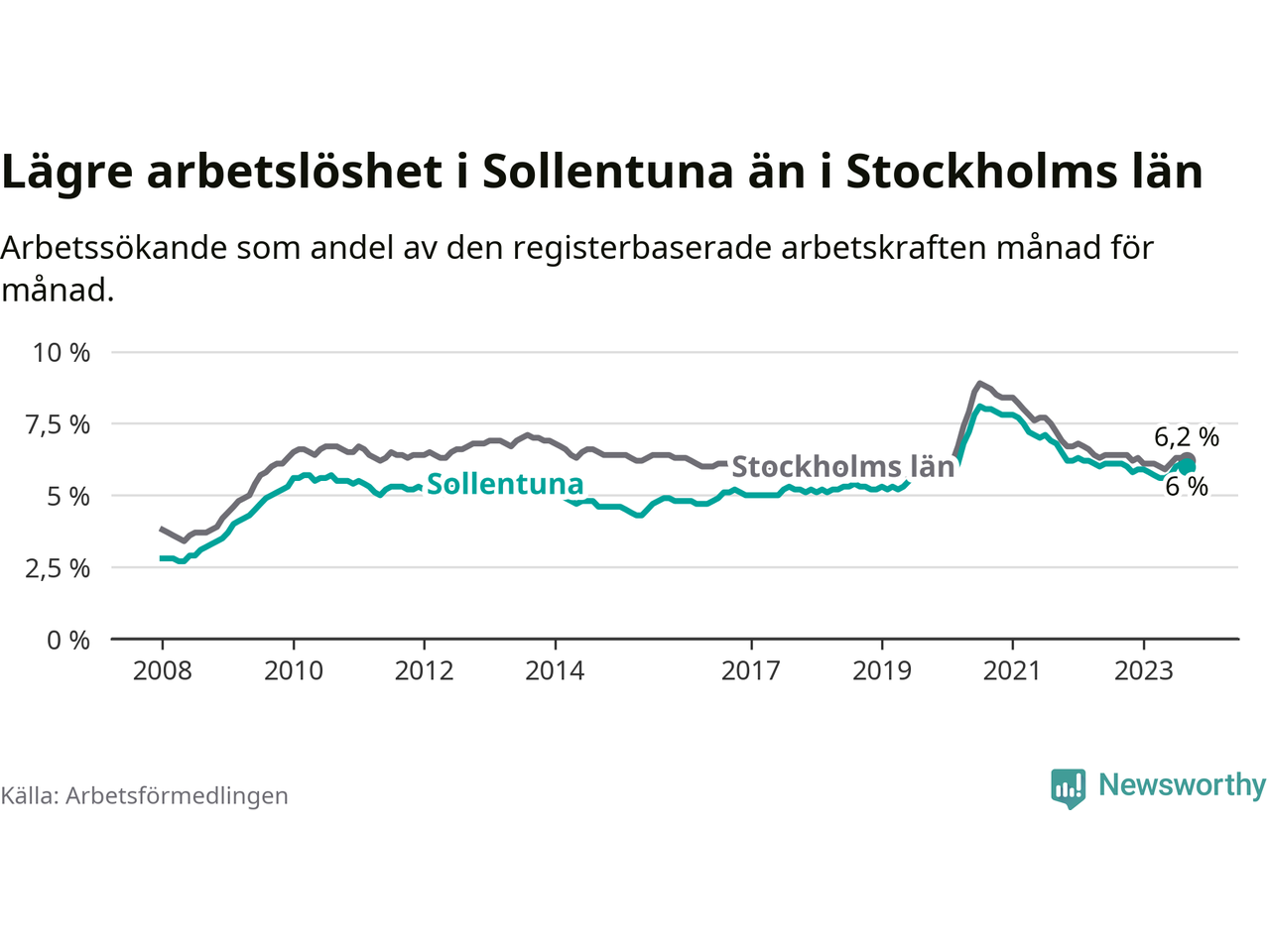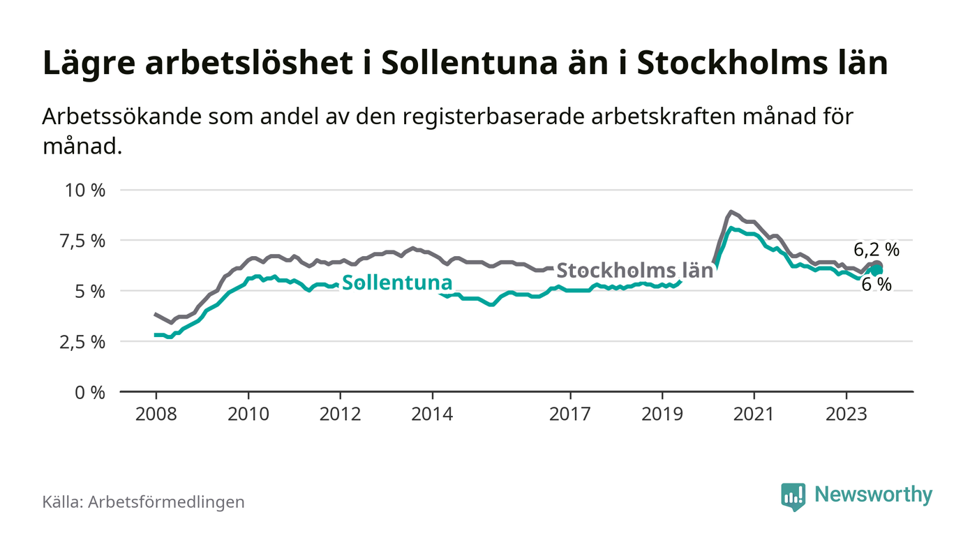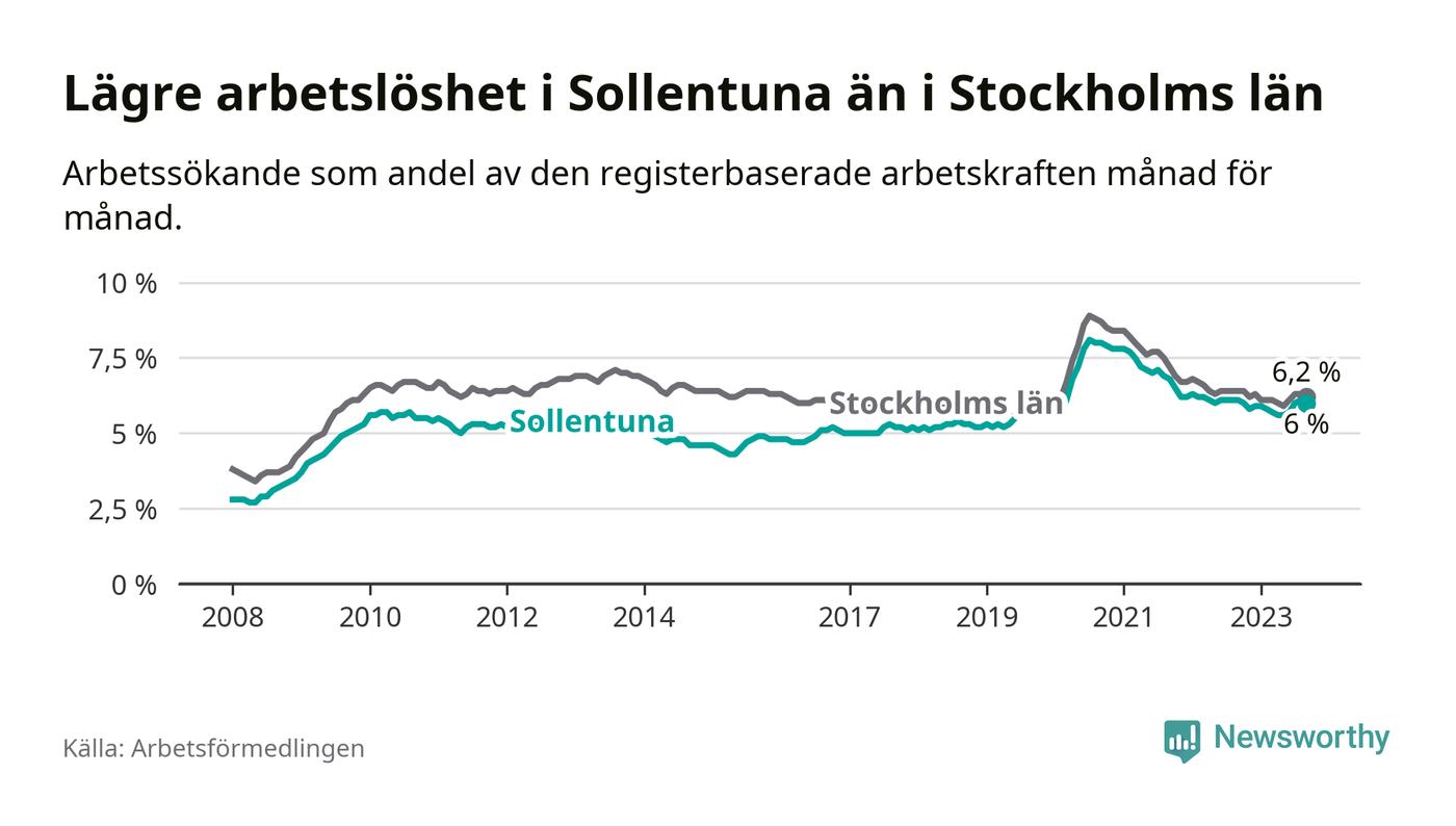 Sollentuna hade redan tidigare lägre arbetslöshet än snittet i hela Stockholms län och nu växer klyftan (6,0 procent i kommunen, jämfört med 6,2 procent i hela länet). Vaxholm har den lägsta arbetslösheten i länet (3,1 procent), medan Botkyrka har den högsta (10,5 procent). För att Sollentuna skulle komma ner i samma arbetslöshetsnivå som Vaxholm skulle 1 109 personer behöva sysselsättas.