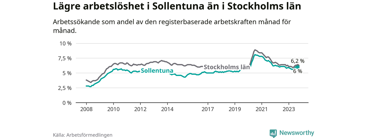 Under september månad rapporterade Sollentuna kommun en total arbetslöshet på 6,0 procent. Det är en minskning jämfört med samma tidpunkt i fjol (−0,1 procentenheter). Även i Stockholms län sjunker arbetslösheten .