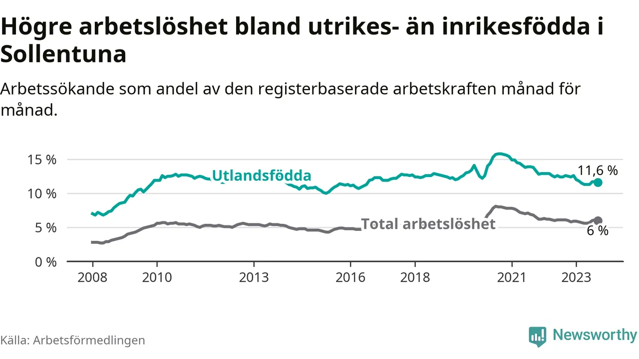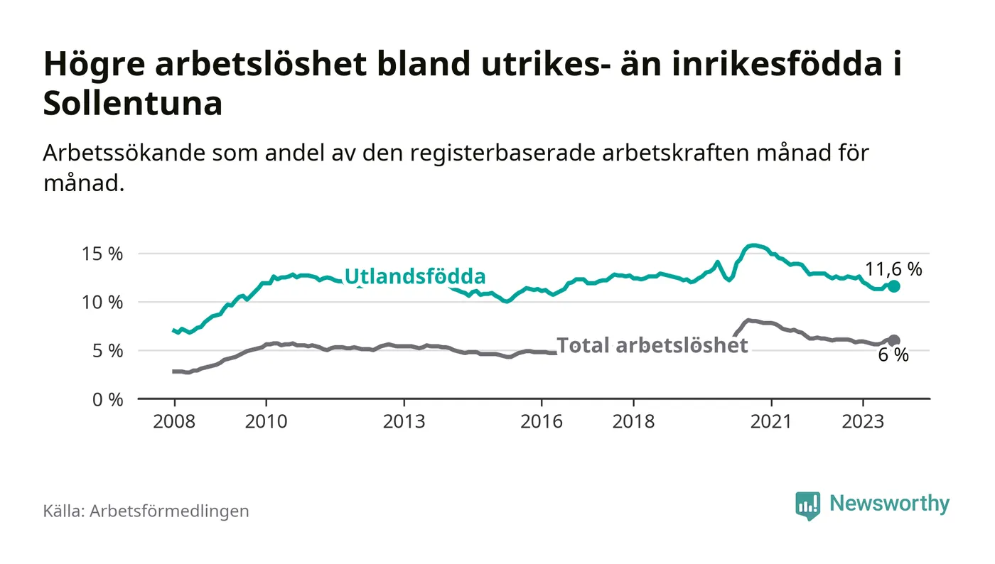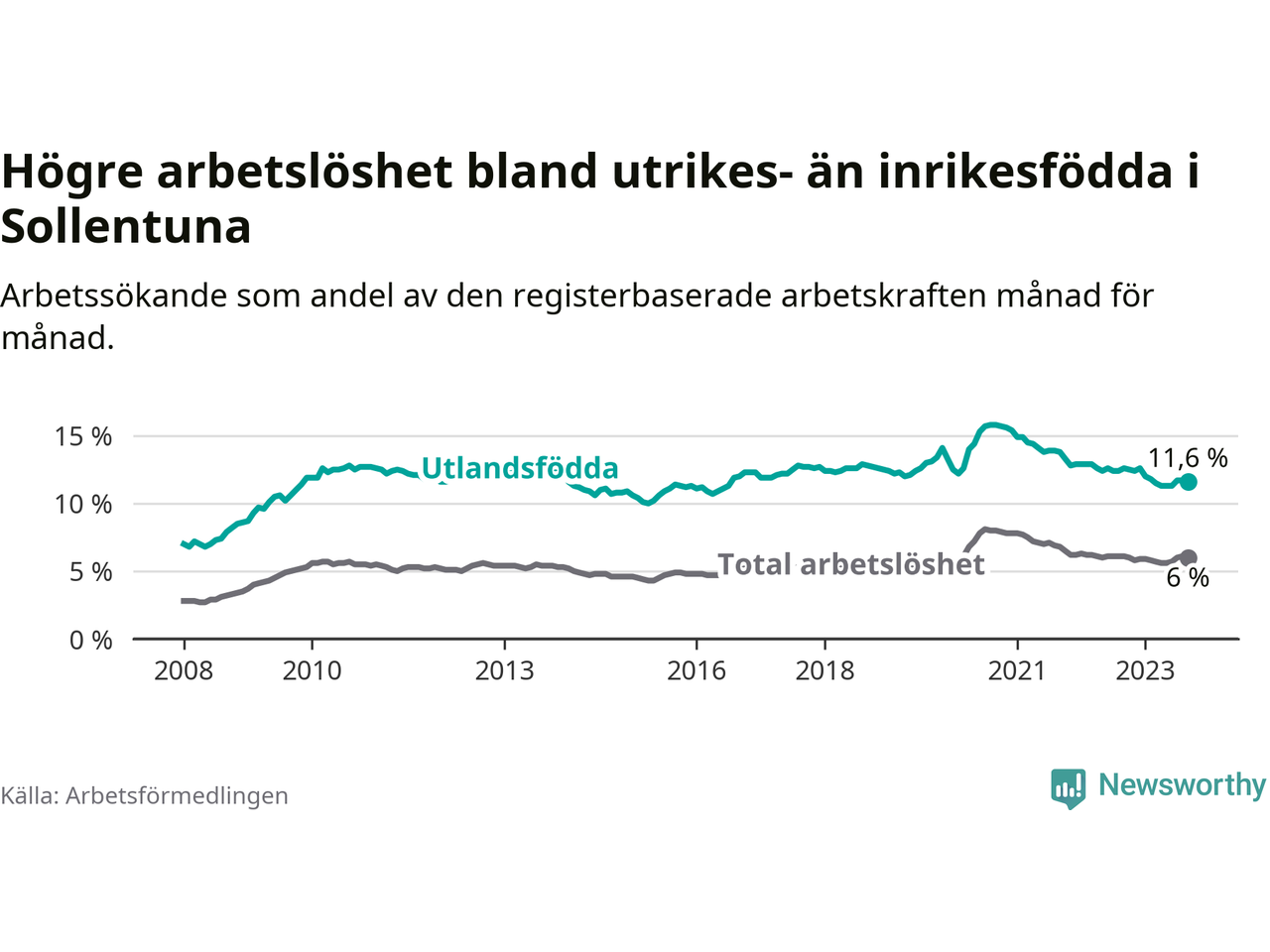 Skillnaden i arbetslöshet mellan utrikesfödda och hela befolkningen är 5,6 procentenheter i Sollentuna. Det är en mindre skillnad än för ett år sedan (−0,9 procentenheter).