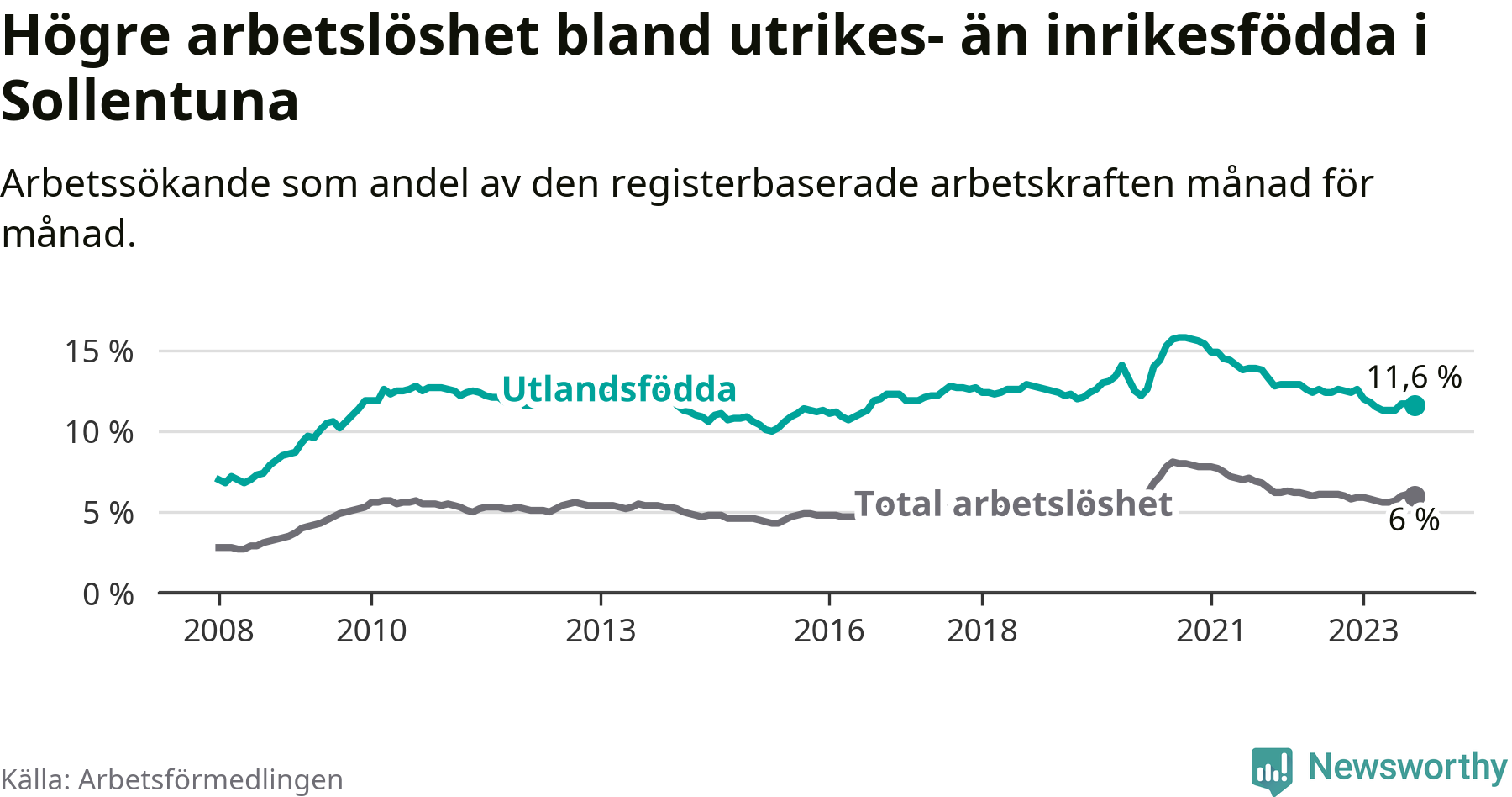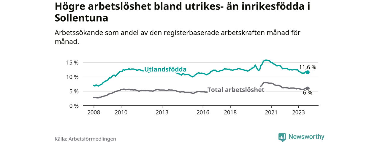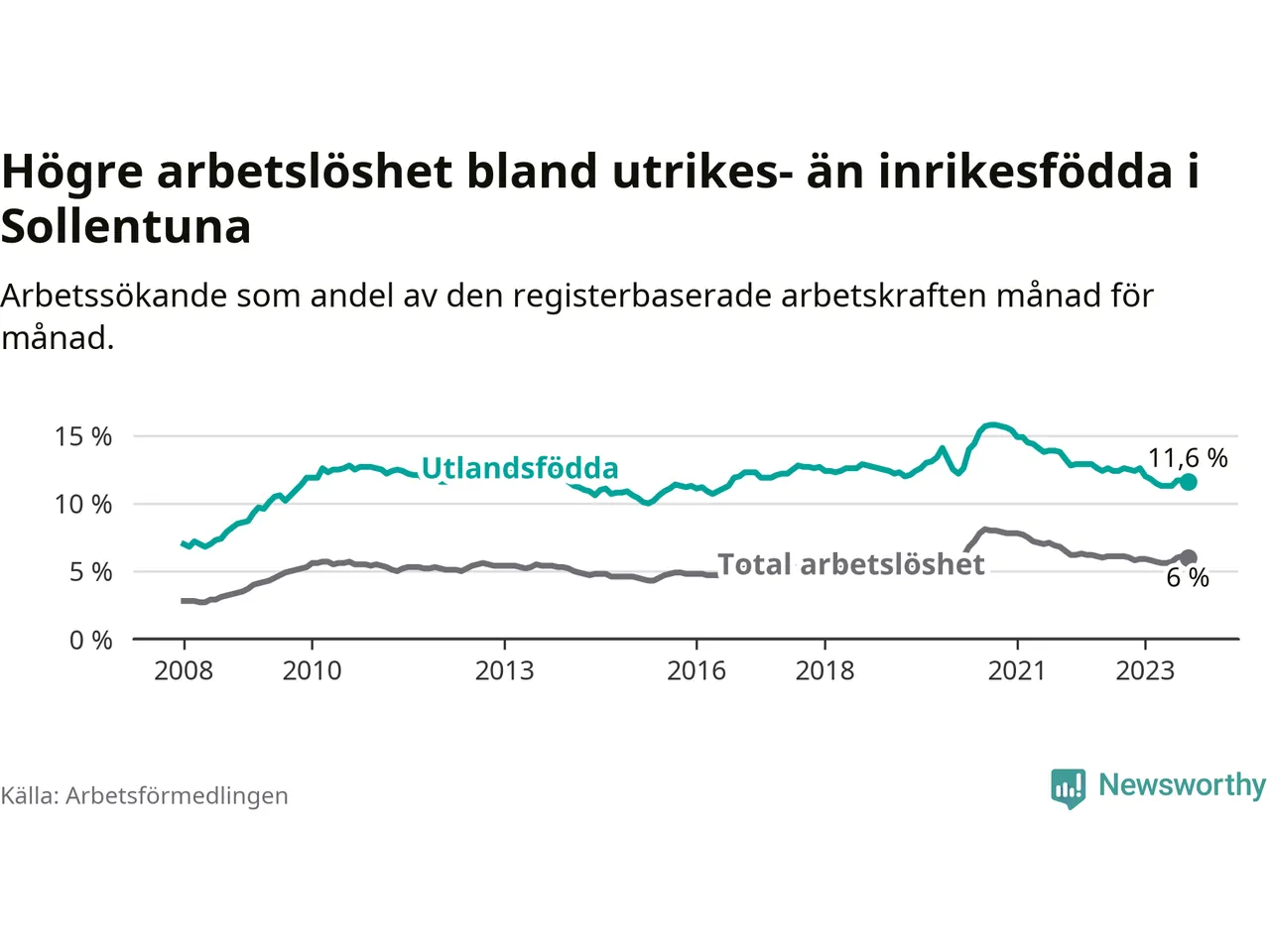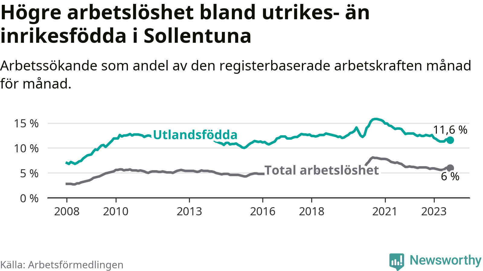 Skillnaden i arbetslöshet mellan utrikesfödda och hela befolkningen är 5,6 procentenheter i Sollentuna. Det är en mindre skillnad än för ett år sedan (−0,9 procentenheter).