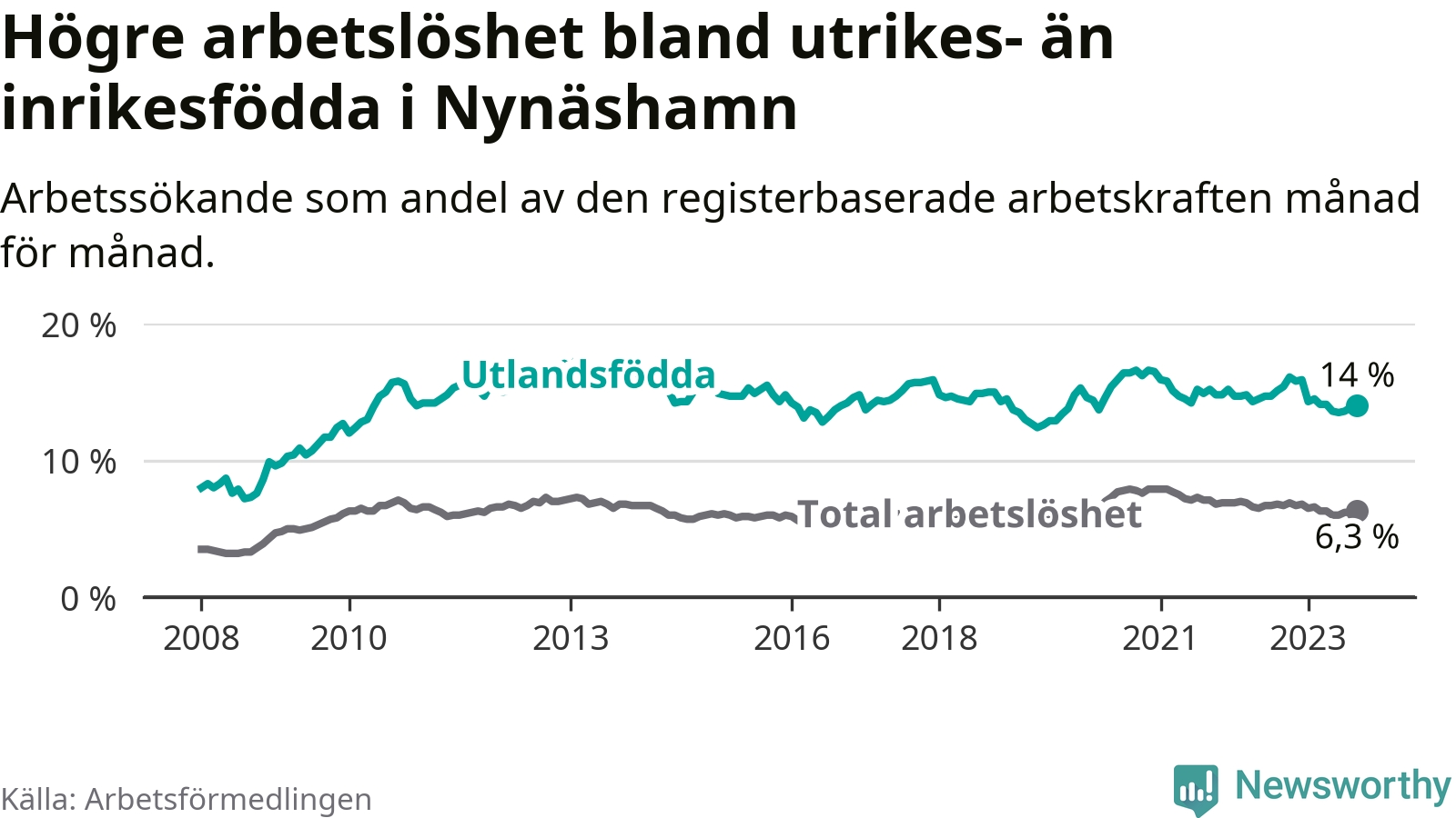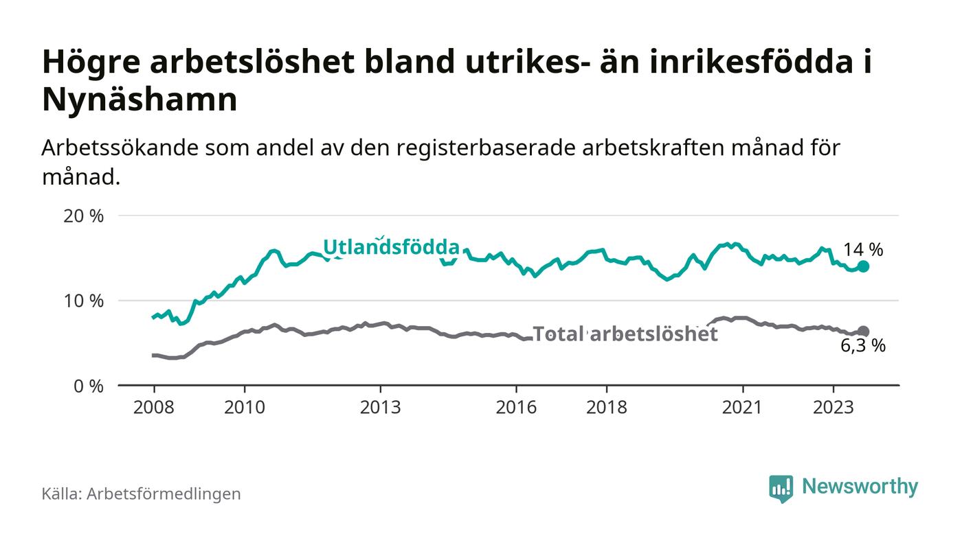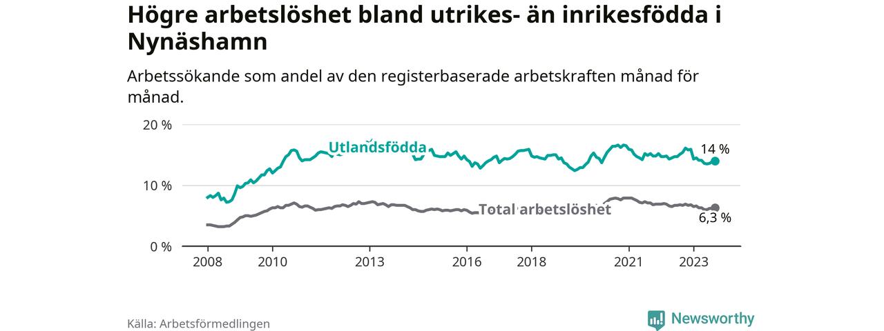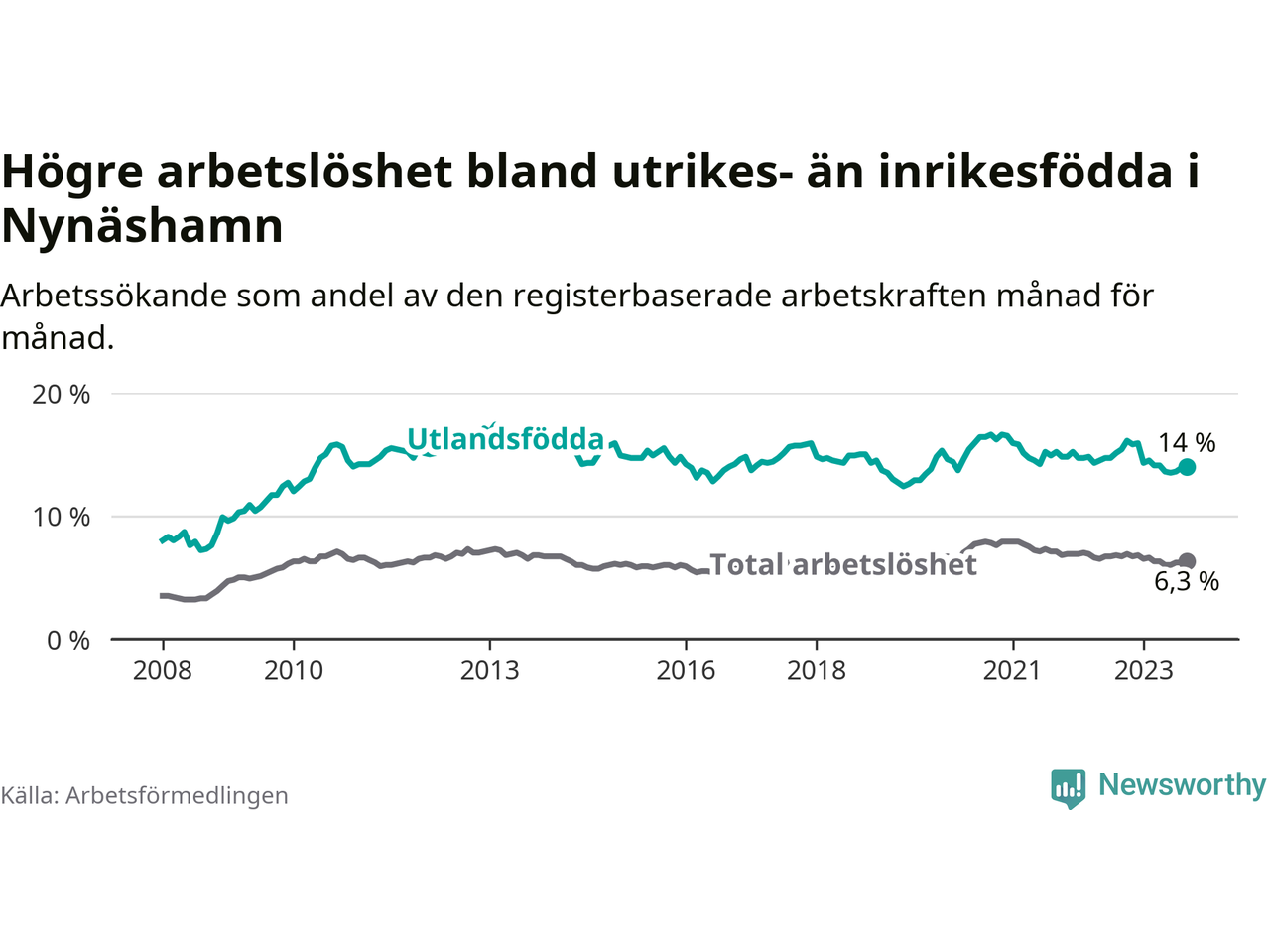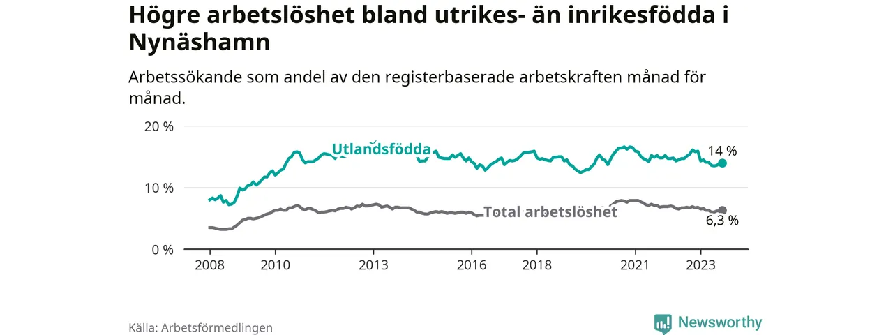 Den senaste månadsstatistiken från Arbetsförmedlingen visar på en nedgång i arbetslöshet bland utlandsfödda i Nynäshamns kommun med 1,4 procentenheter. Arbetslösheten bland invånare födda i ett annat land låg i september på 14,0 procent.