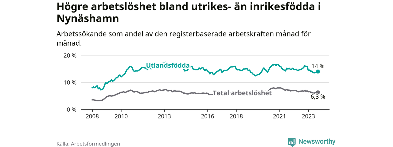 Skillnaden i arbetslöshet mellan utrikesfödda och hela befolkningen är 7,7 procentenheter i Nynäshamn. Det är en mindre skillnad än för ett år sedan (−1,0 procentenheter).