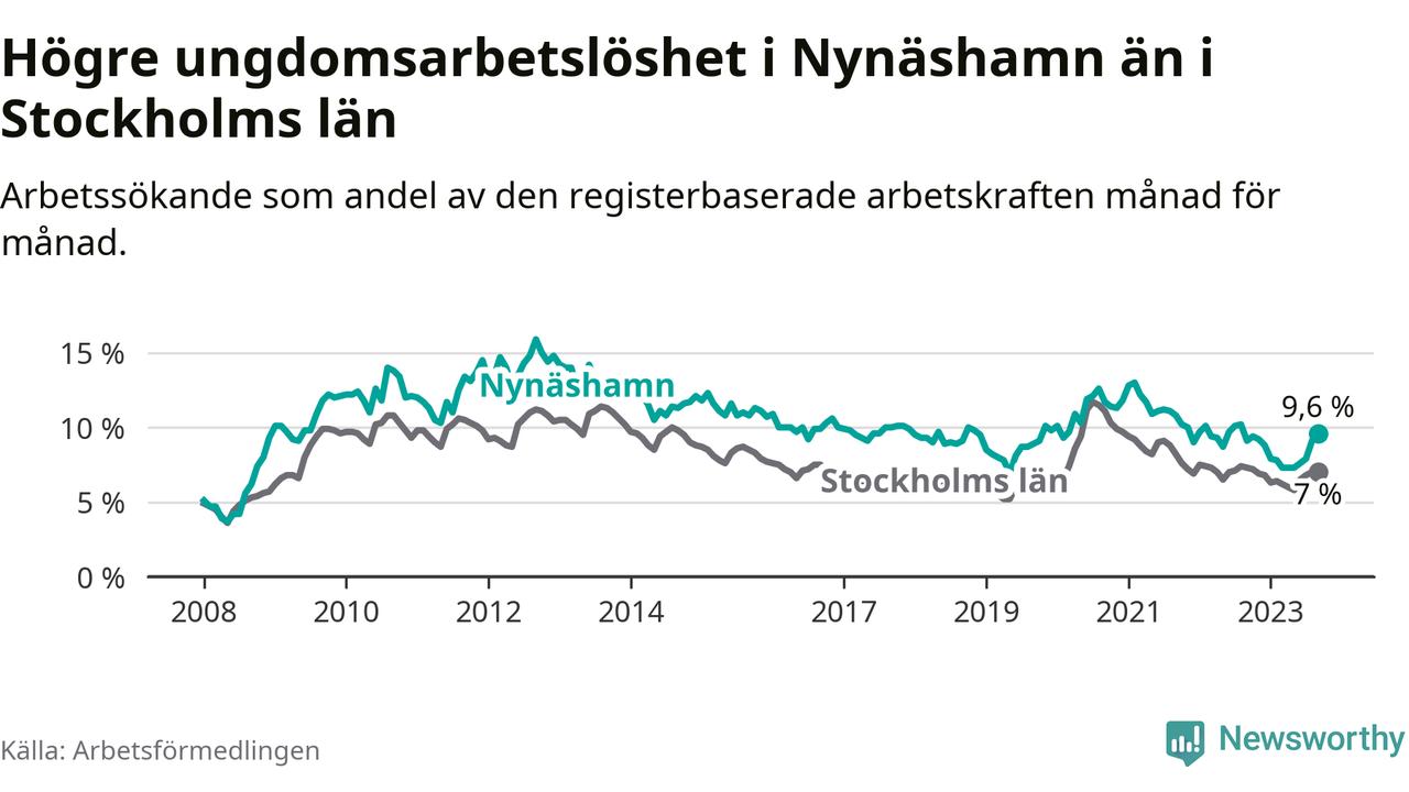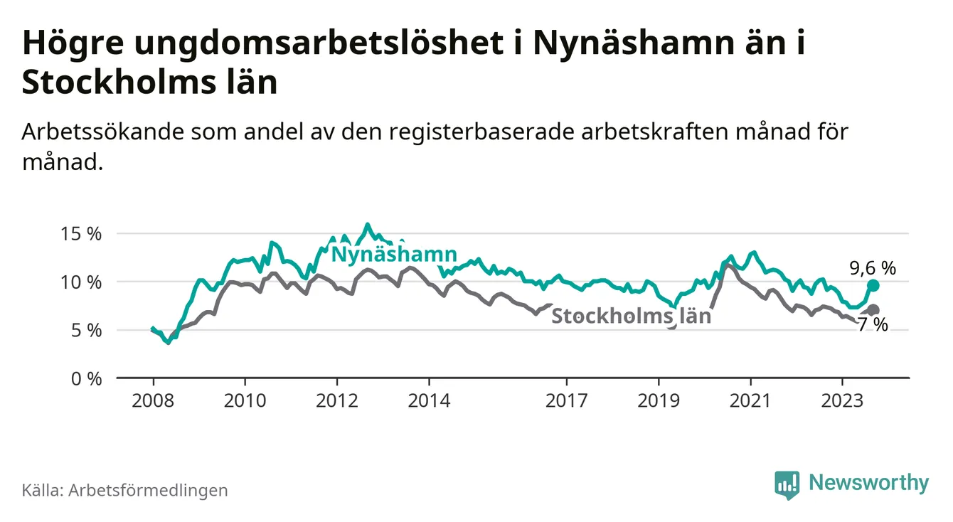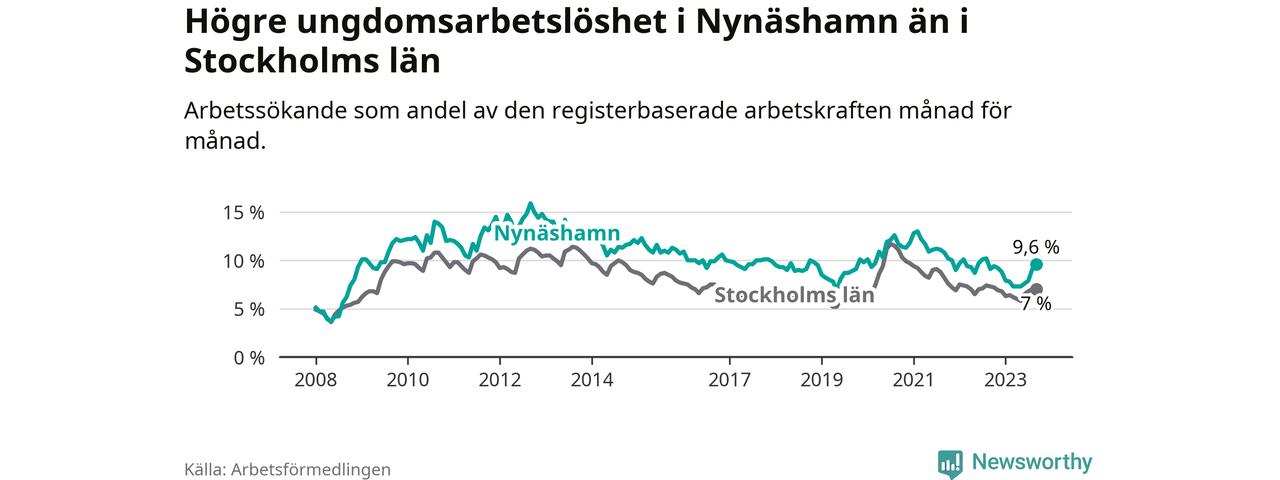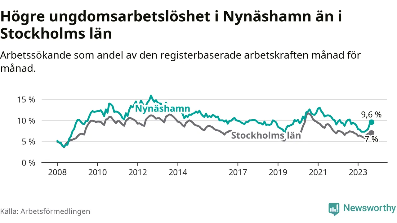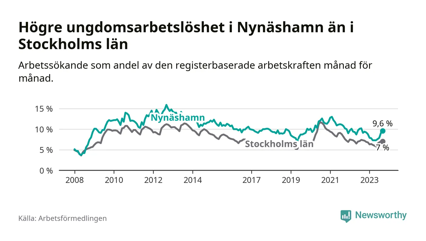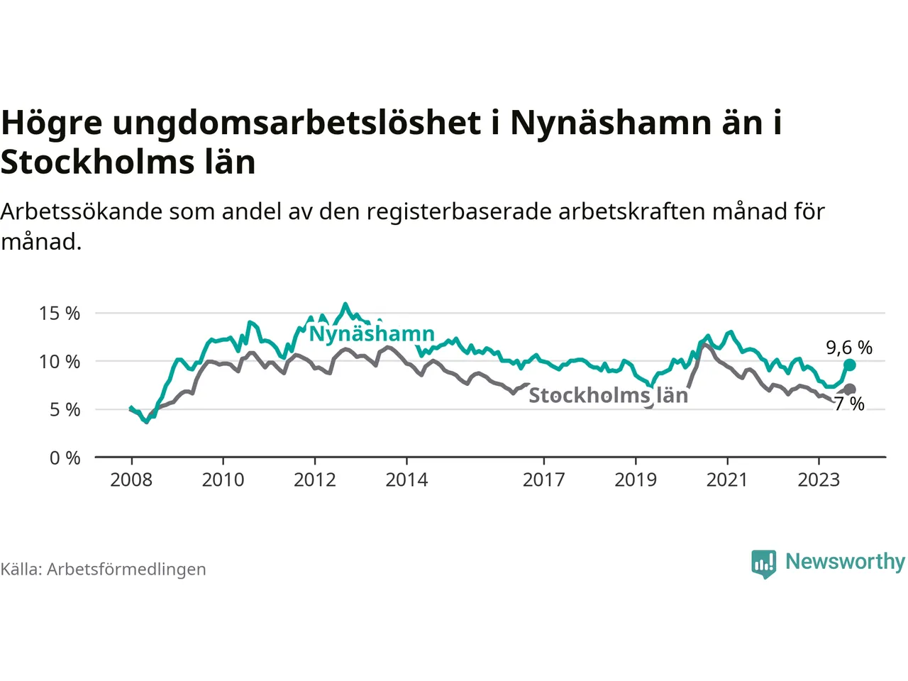 Medan Nynäshamn har ungefär samma total arbetslöshet som Stockholms län, ligger ungdomsarbetslösheten 2,6 procentenheter högre i Nynäshamn.
