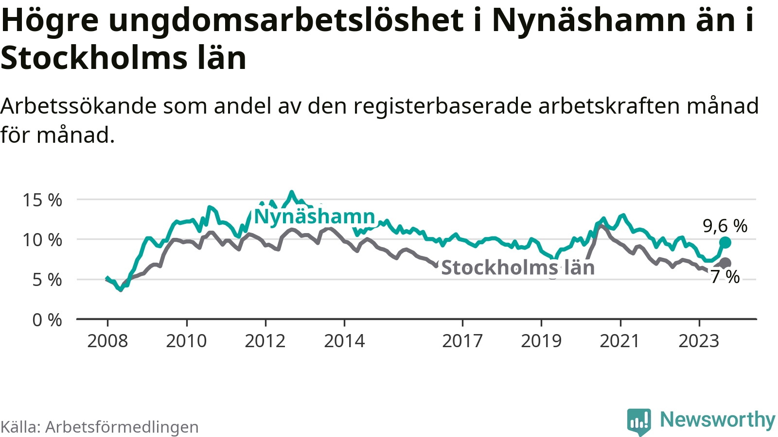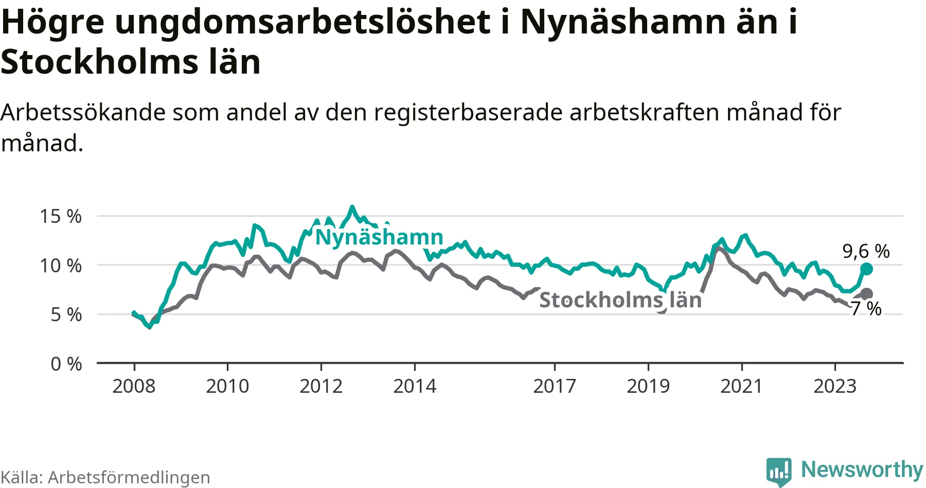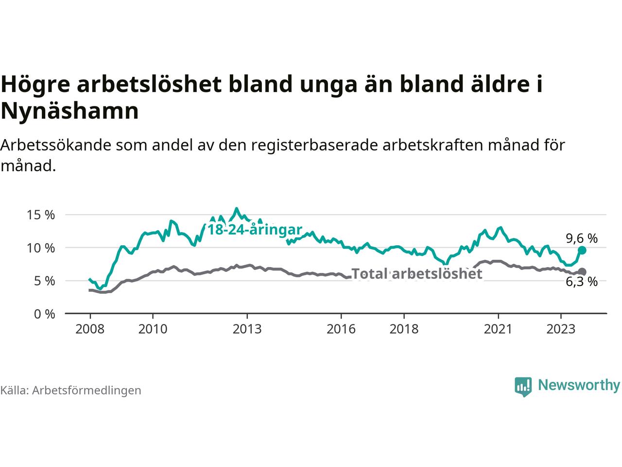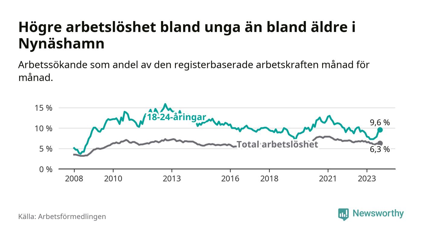 Medan Nynäshamn har ungefär samma total arbetslöshet som Stockholms län, ligger ungdomsarbetslösheten 2,6 procentenheter högre i Nynäshamn.
