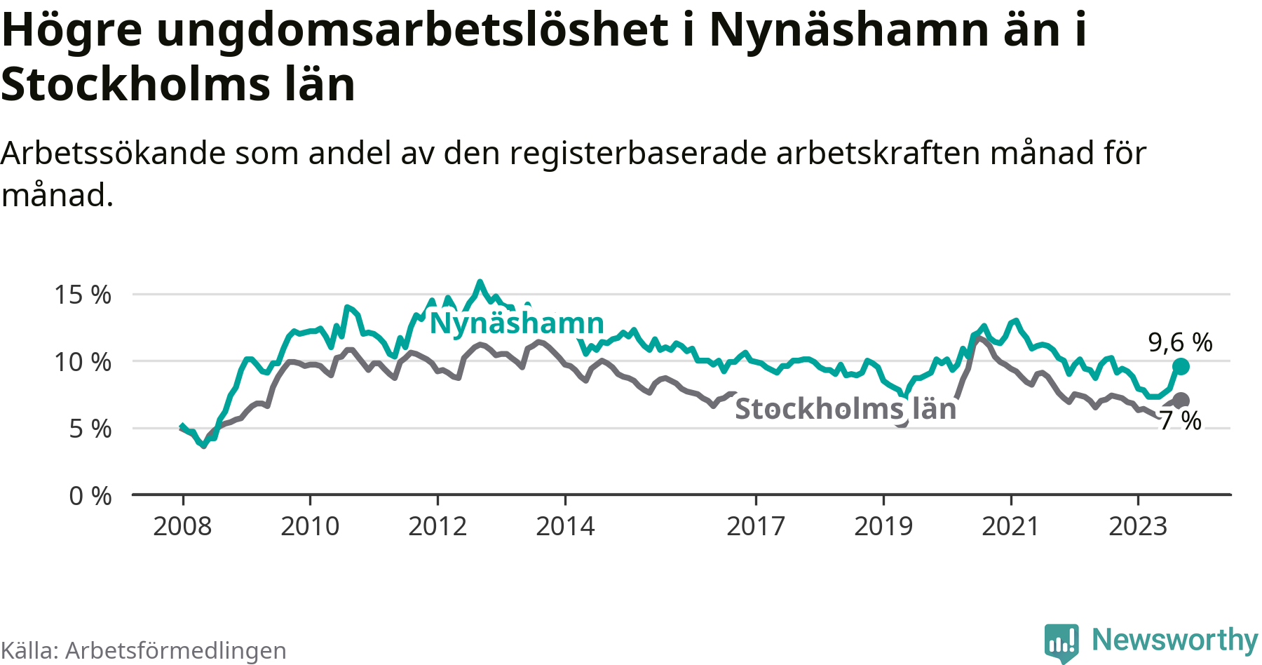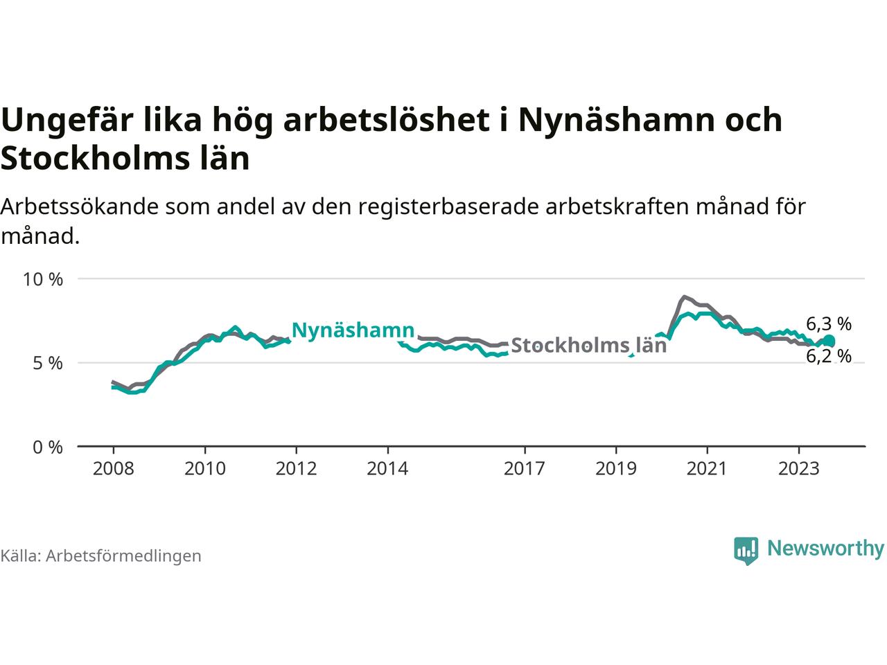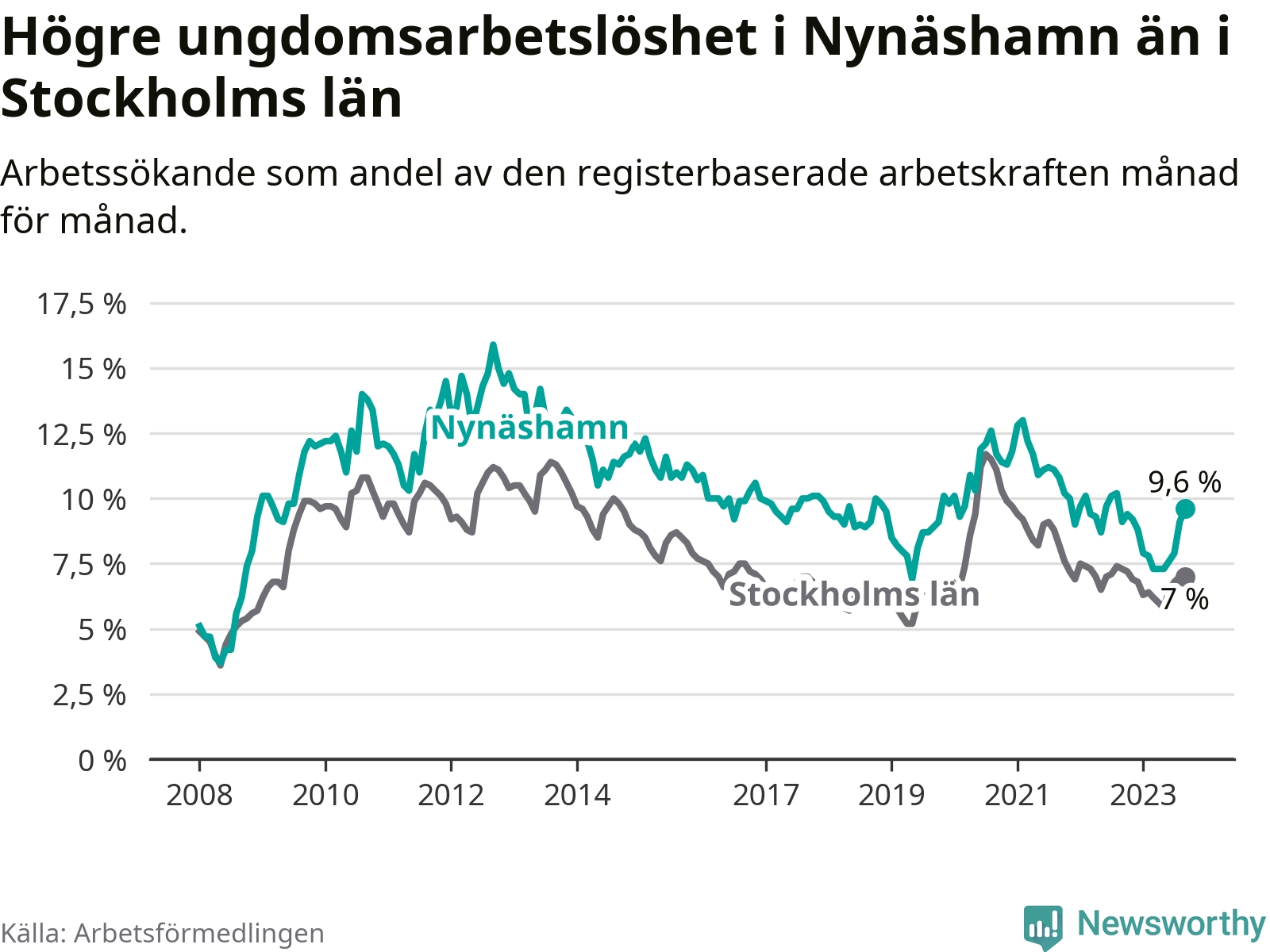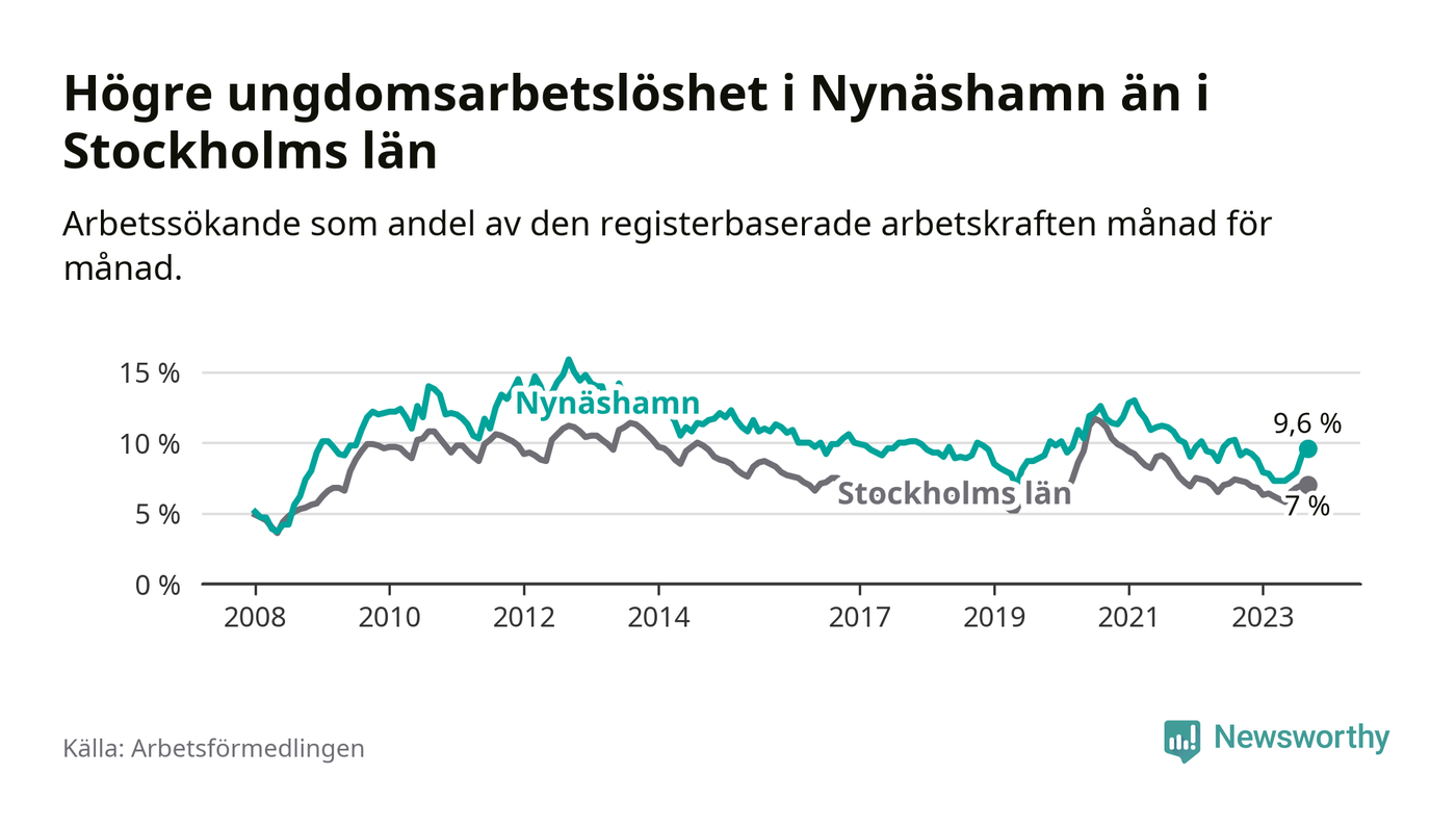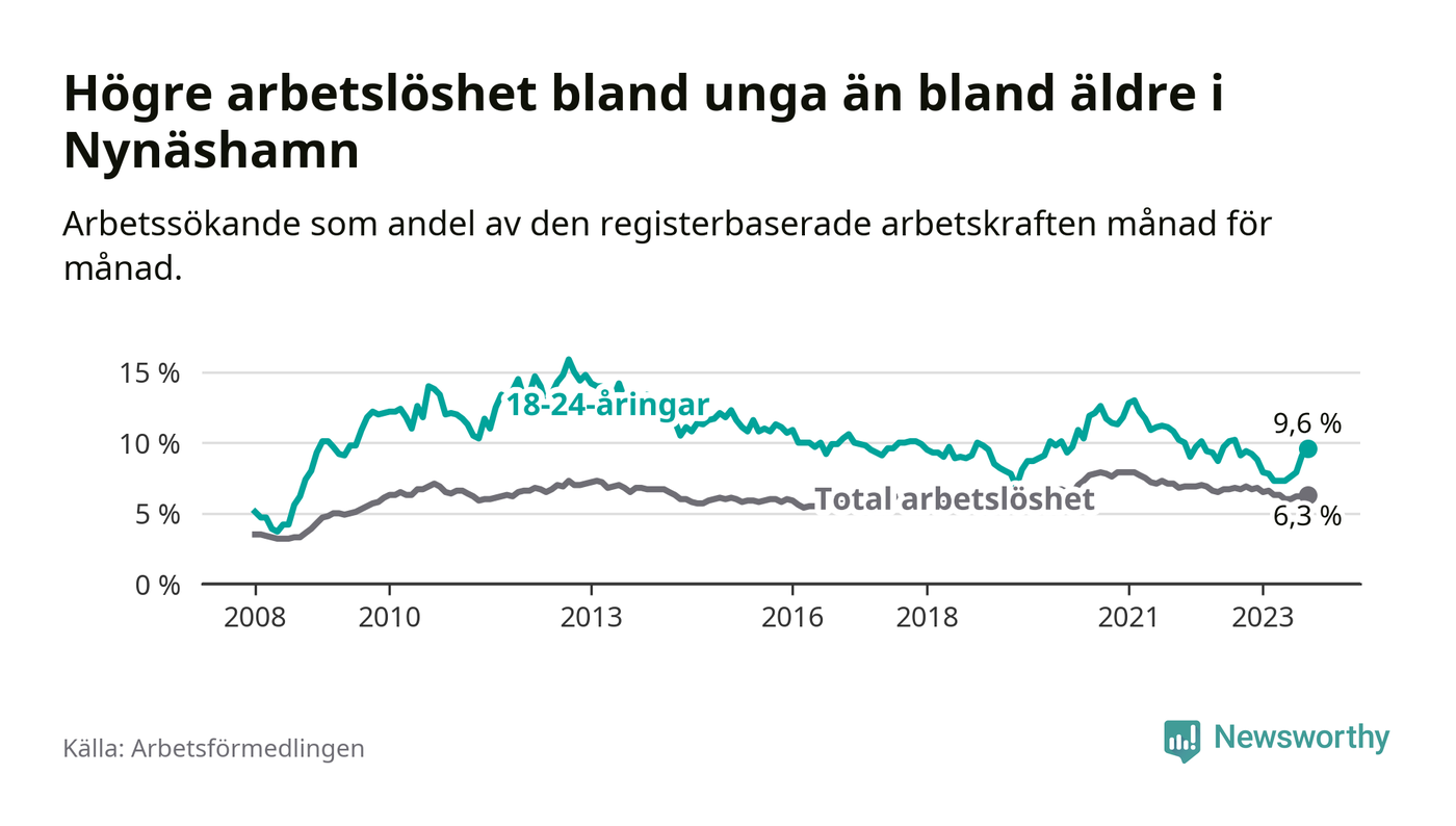 Medan Nynäshamn har ungefär samma total arbetslöshet som Stockholms län, ligger ungdomsarbetslösheten 2,6 procentenheter högre i Nynäshamn.