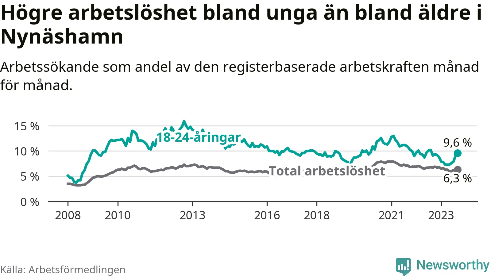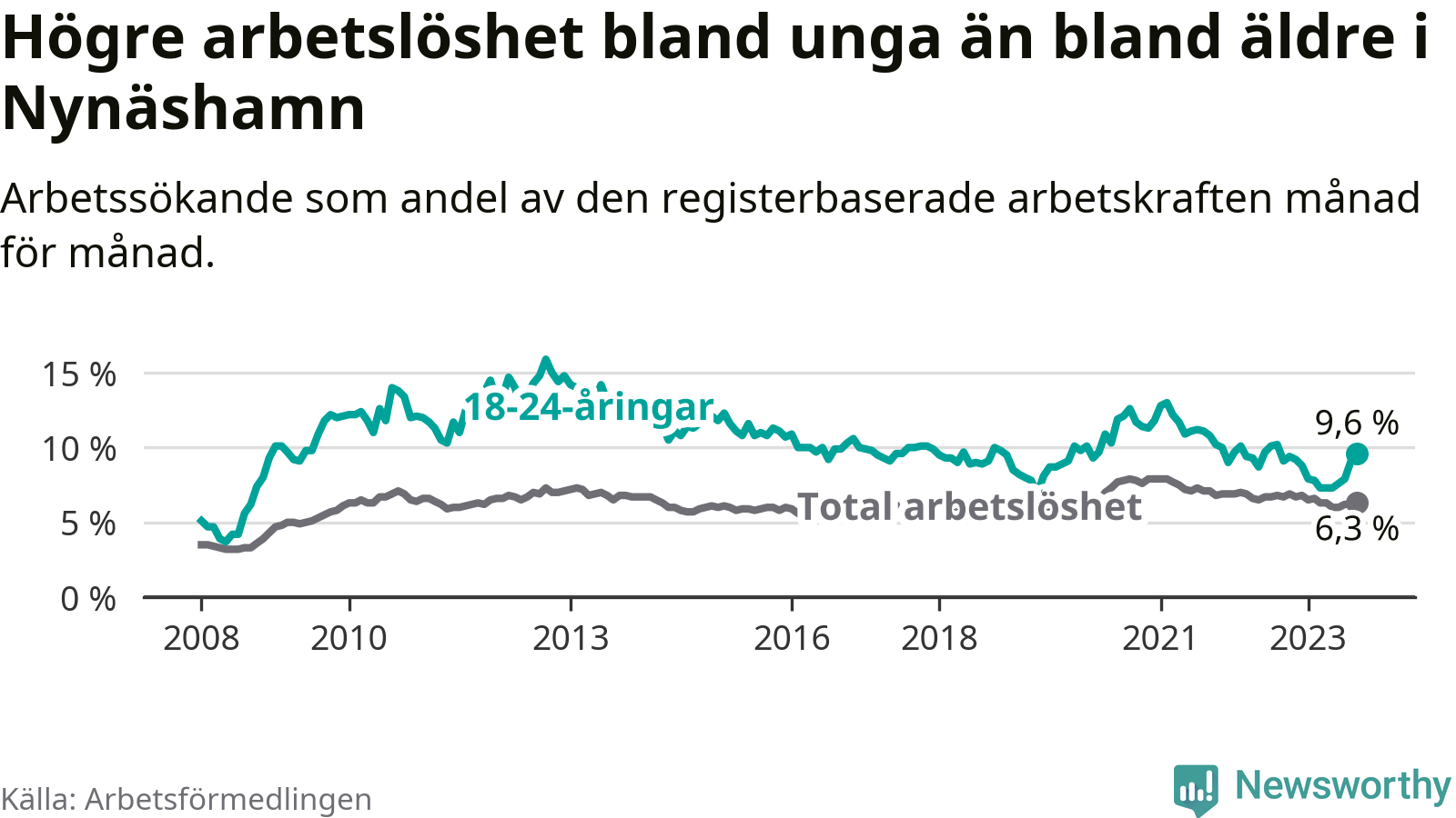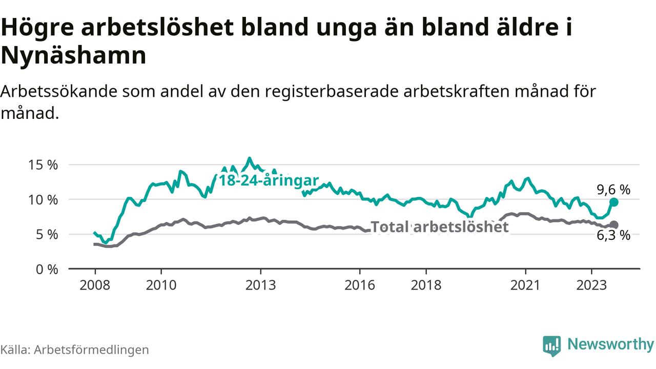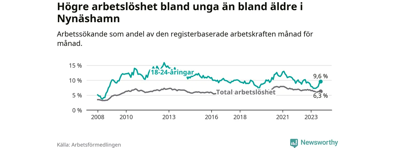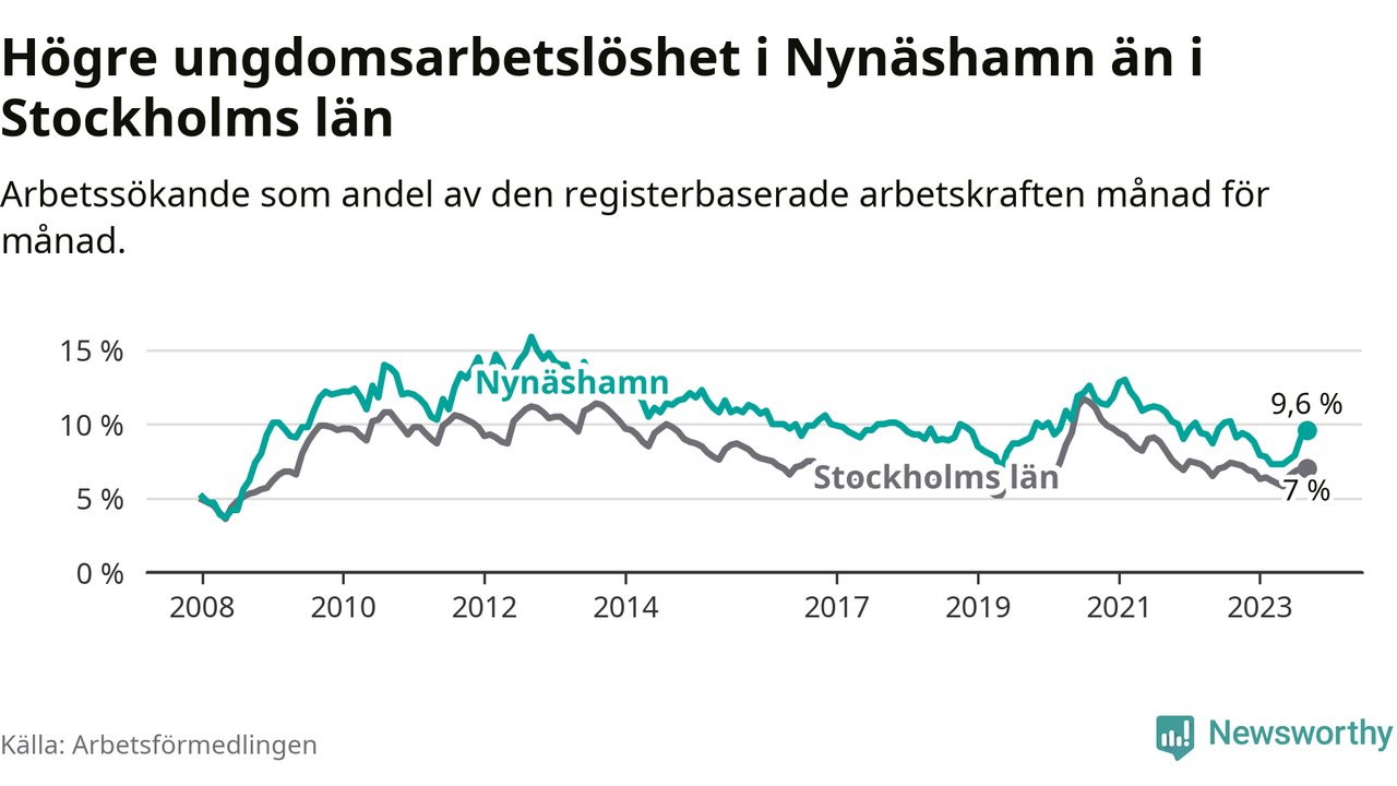 Medan Nynäshamn har ungefär samma total arbetslöshet som Stockholms län, ligger ungdomsarbetslösheten 2,6 procentenheter högre i Nynäshamn.