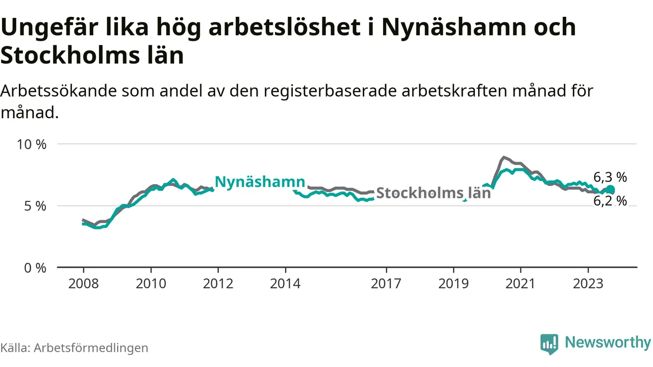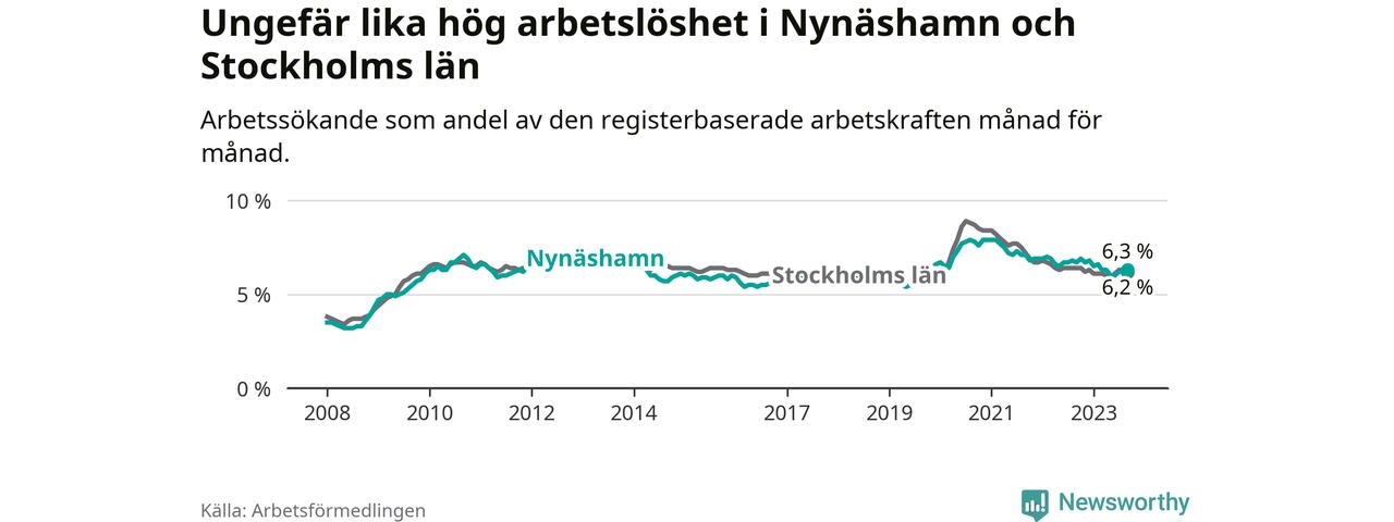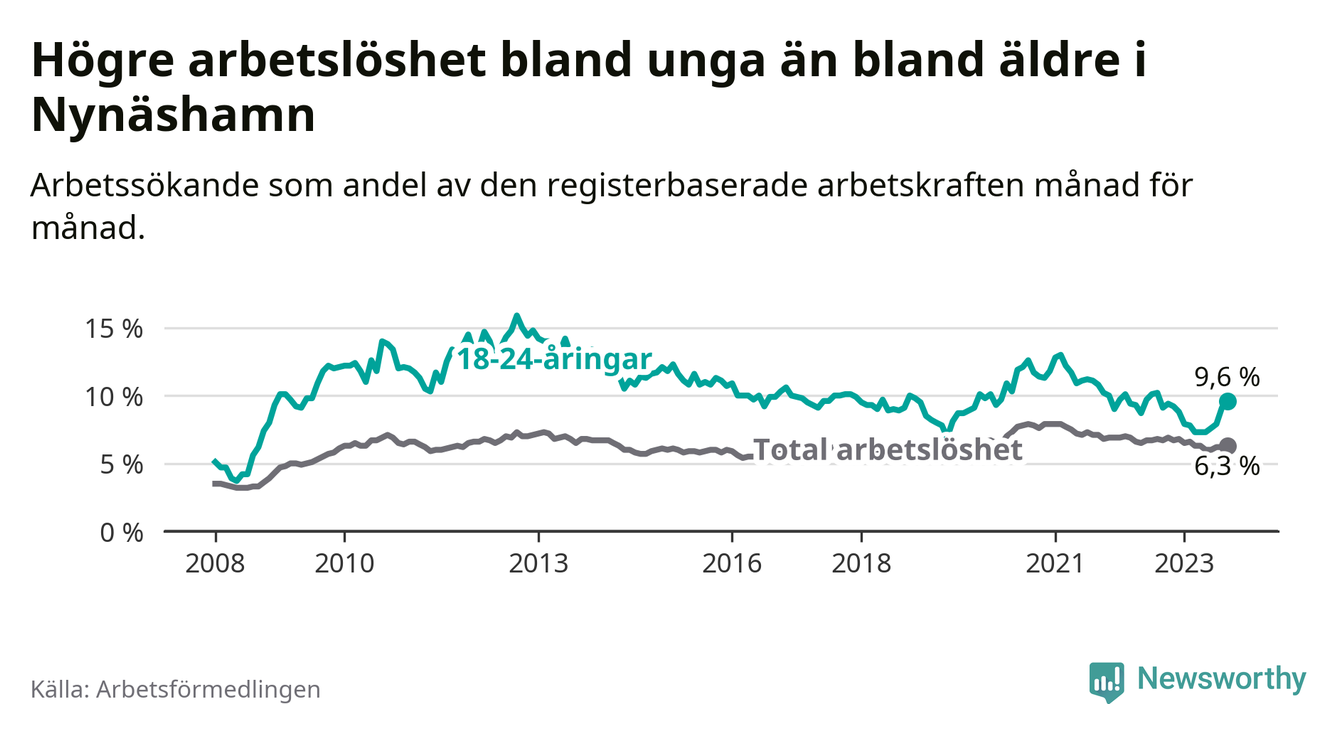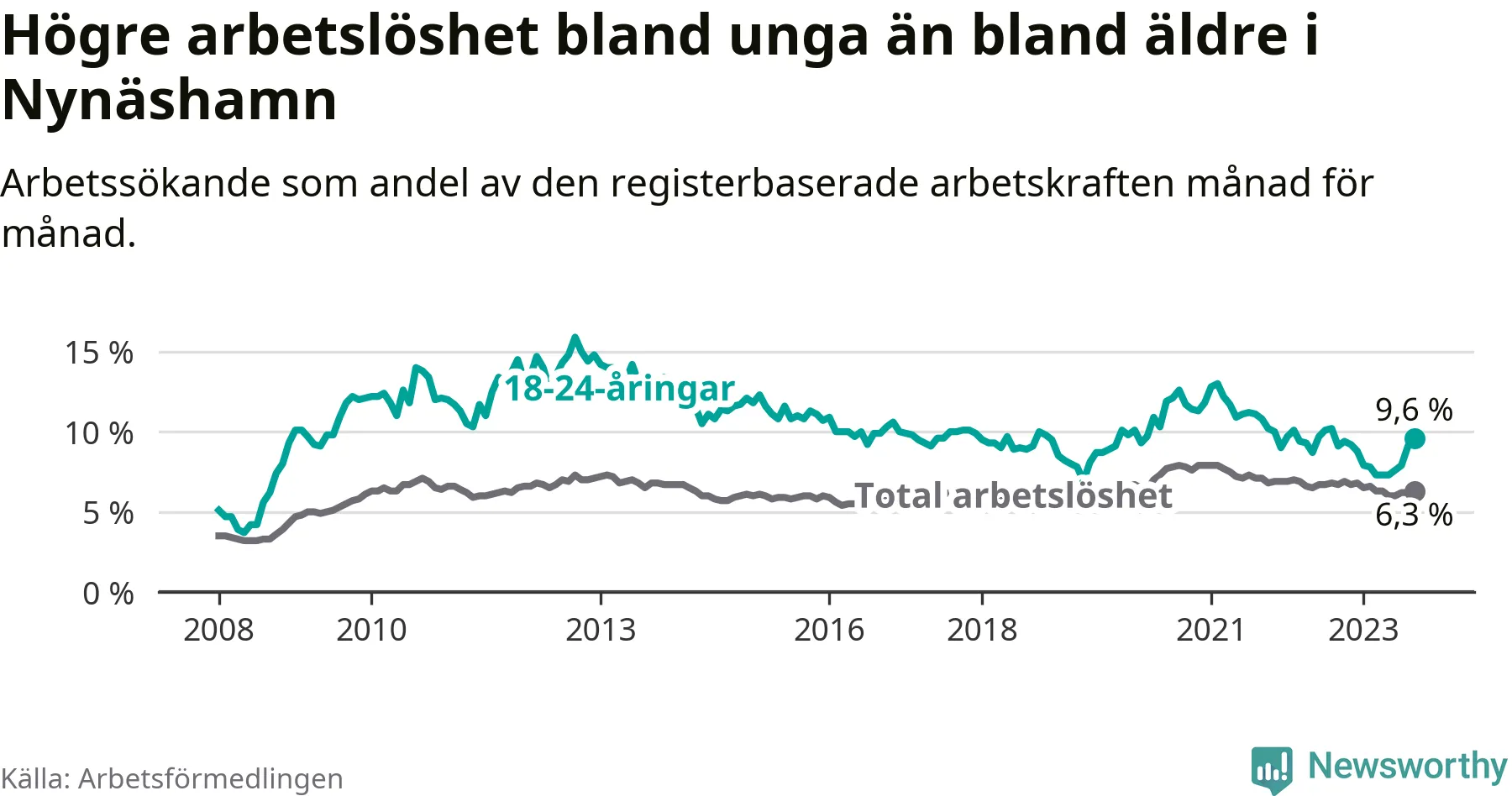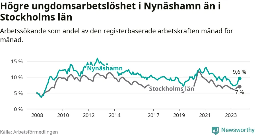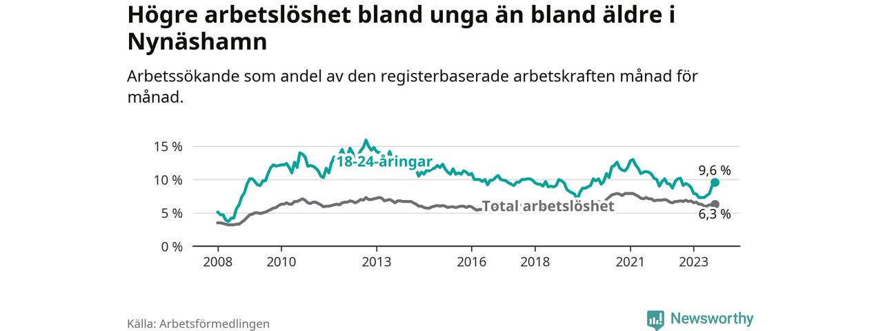 Medan Nynäshamn har ungefär samma total arbetslöshet som Stockholms län, ligger ungdomsarbetslösheten 2,6 procentenheter högre i Nynäshamn.