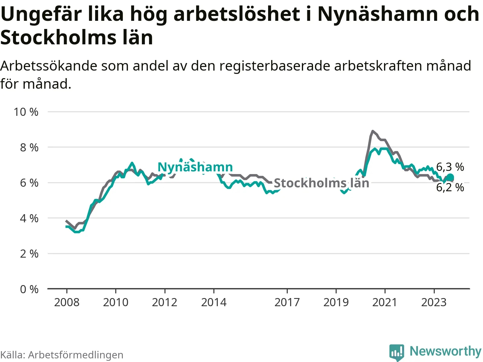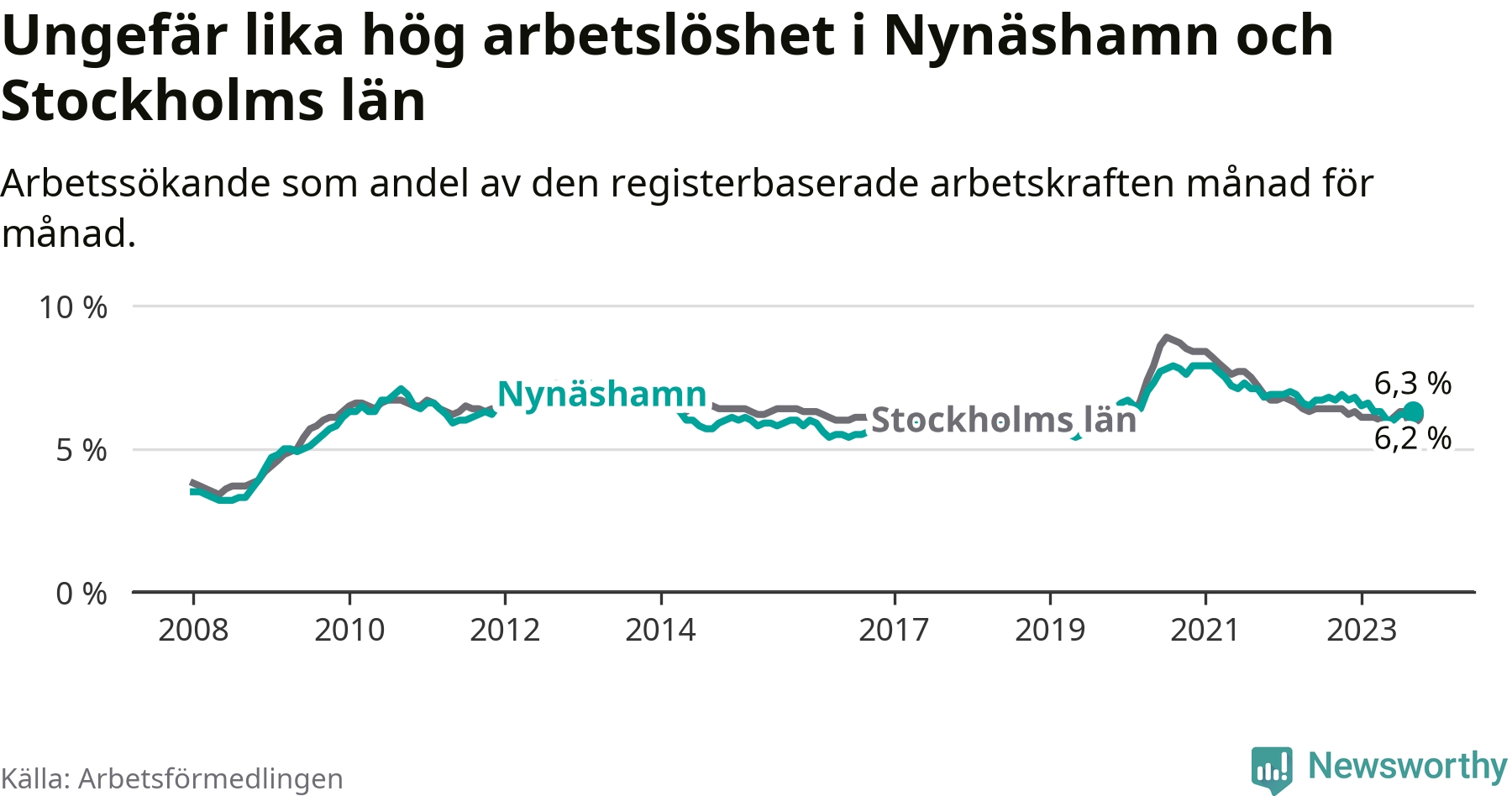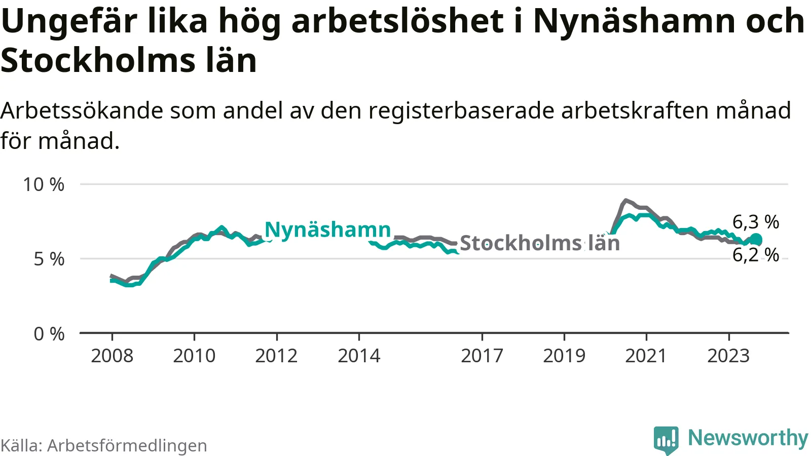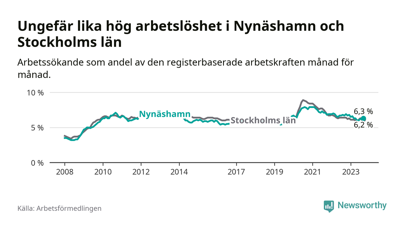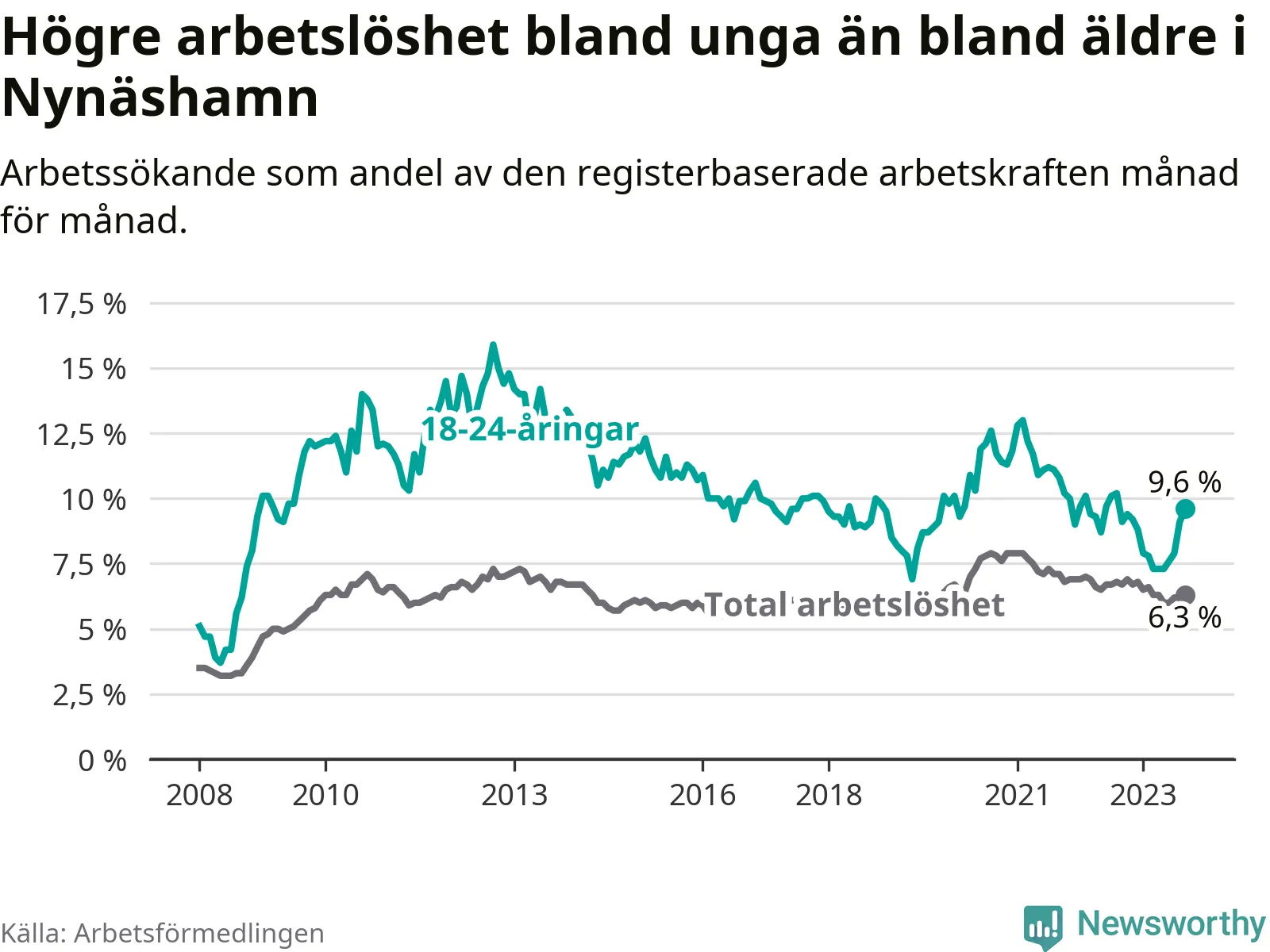 Medan Nynäshamn har ungefär samma total arbetslöshet som Stockholms län, ligger ungdomsarbetslösheten 2,6 procentenheter högre i Nynäshamn.