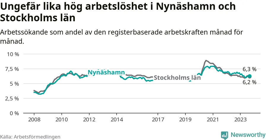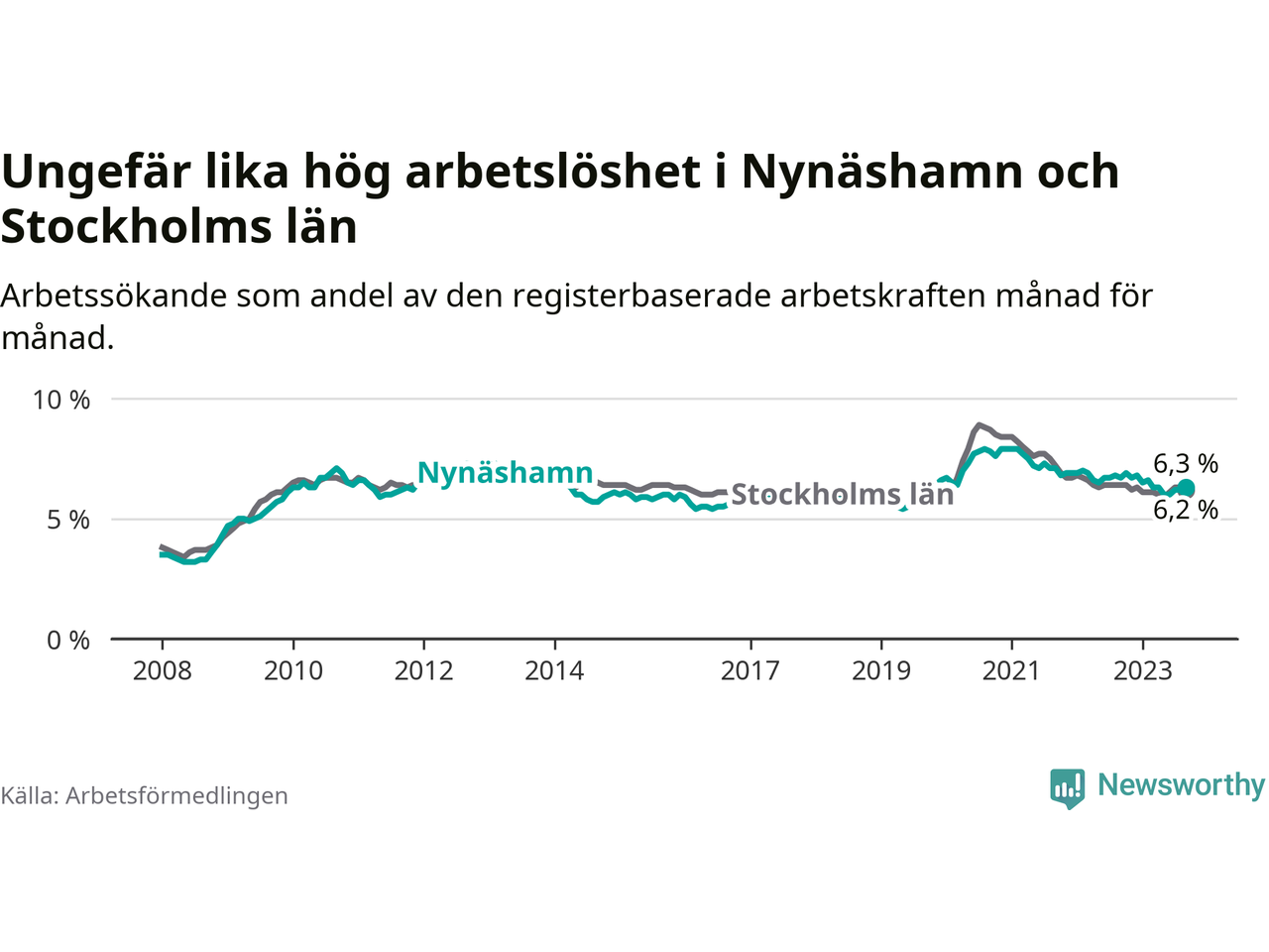 Under september månad rapporterade Nynäshamns kommun en total arbetslöshet på 6,3 procent. Det är en minskning jämfört med samma tidpunkt i fjol (−0,4 procentenheter). Även i Stockholms län sjunker arbetslösheten .