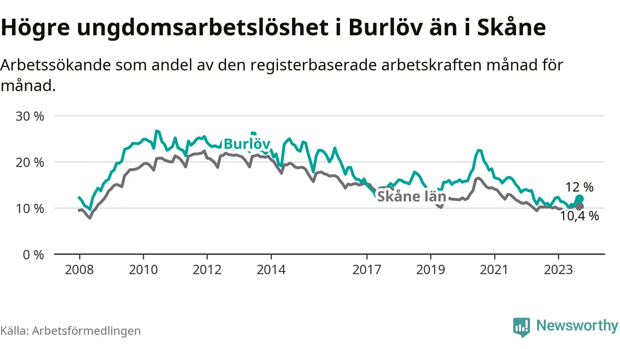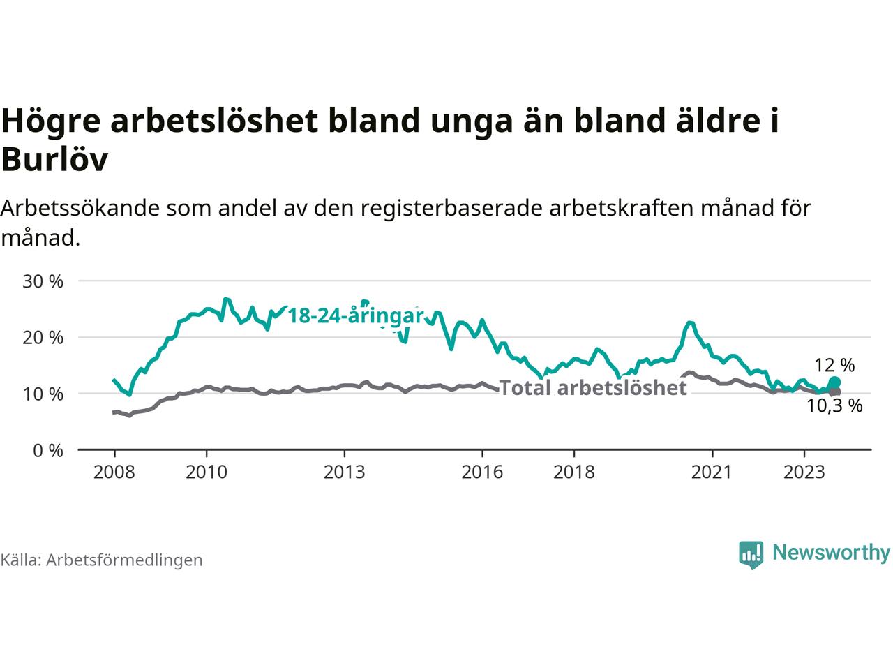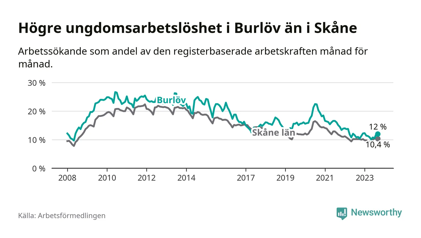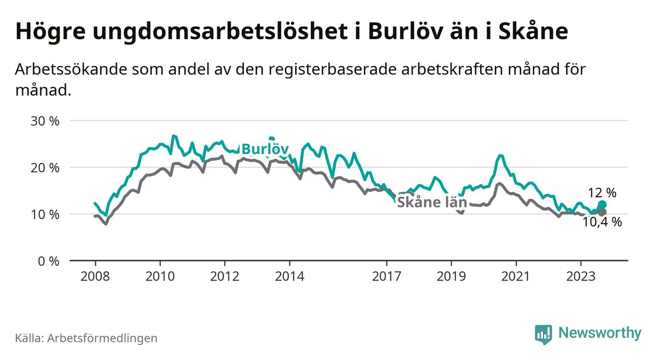Precis som den totala arbetslösheten ligger ungdomsarbetslösheten i Burlöv högre än i Skåne som helhet. Skillnaden mellan kommunen och länet är 1,6 procentenheter.