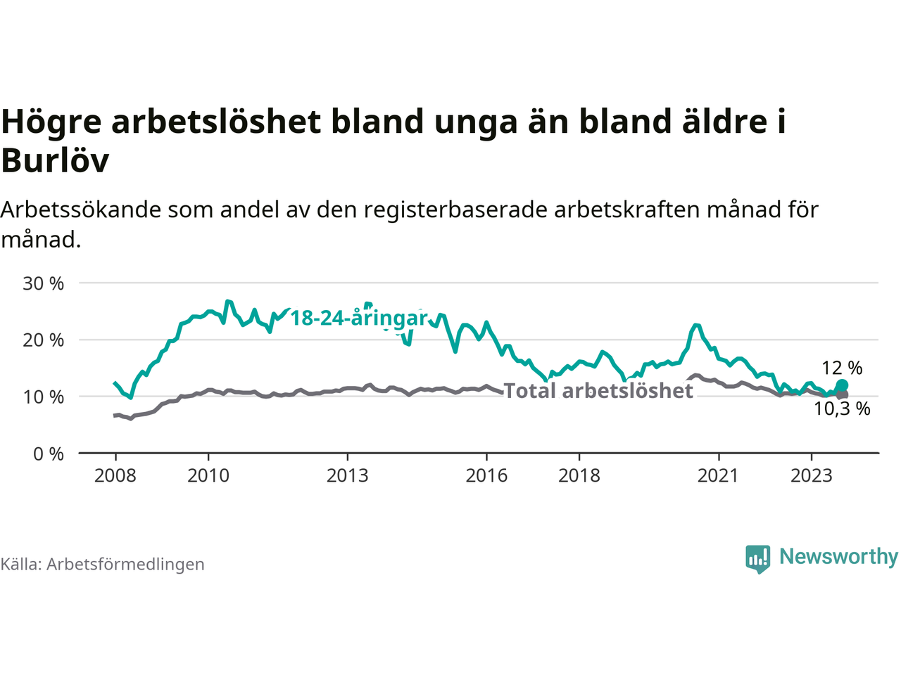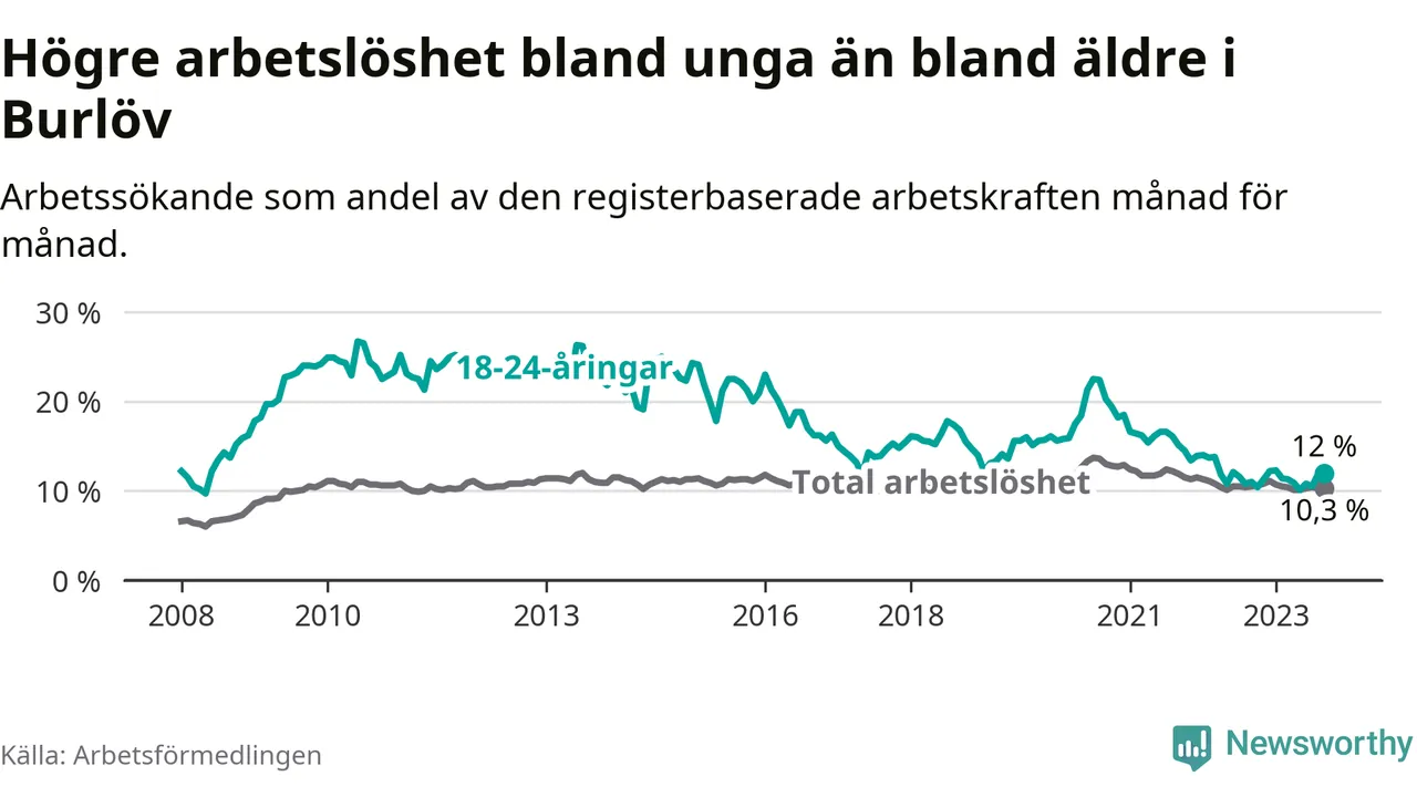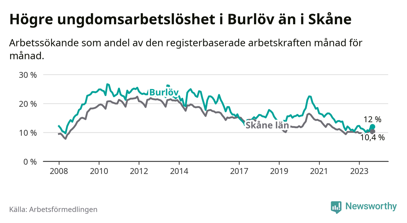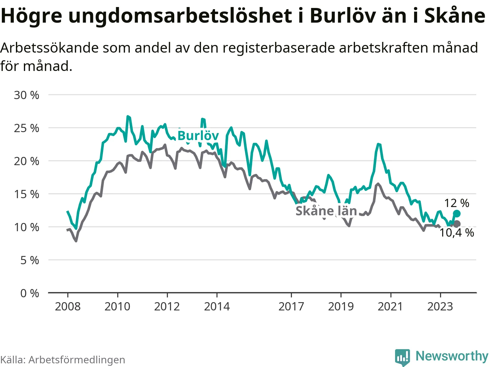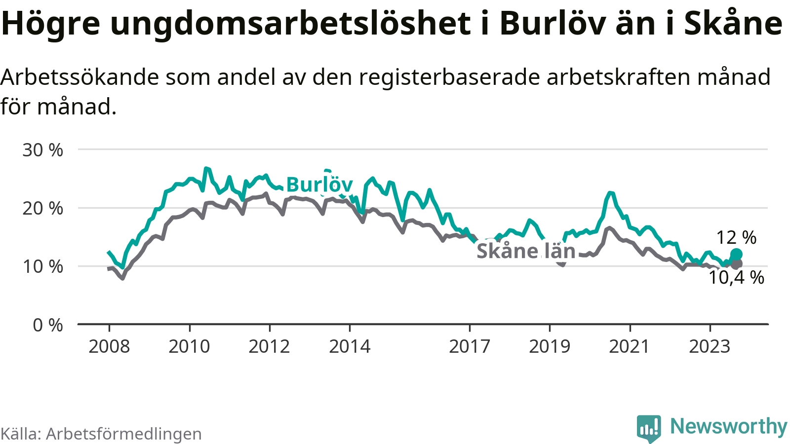 Precis som den totala arbetslösheten ligger ungdomsarbetslösheten i Burlöv högre än i Skåne som helhet. Skillnaden mellan kommunen och länet är 1,6 procentenheter.