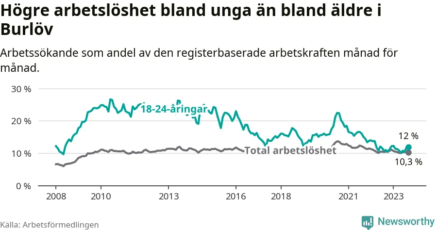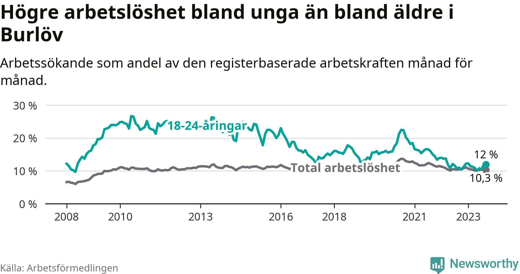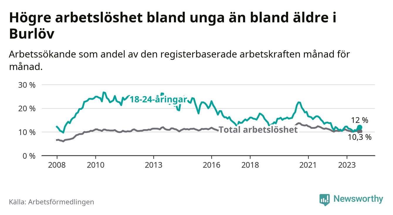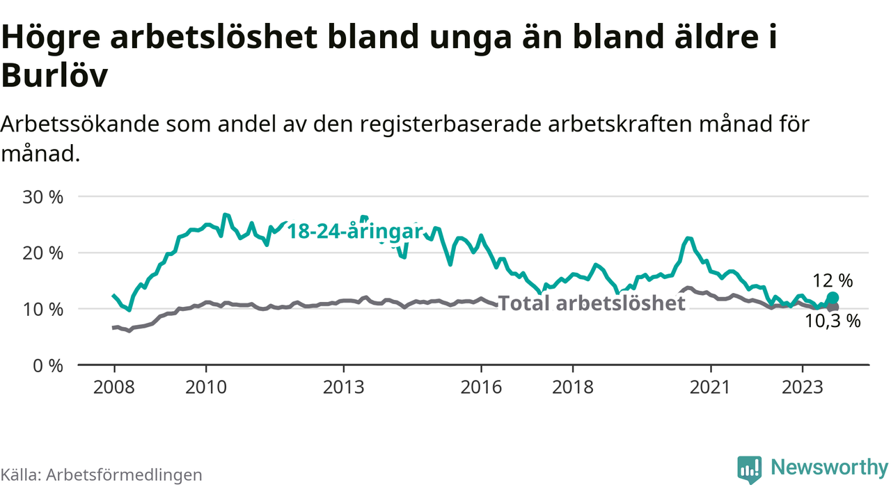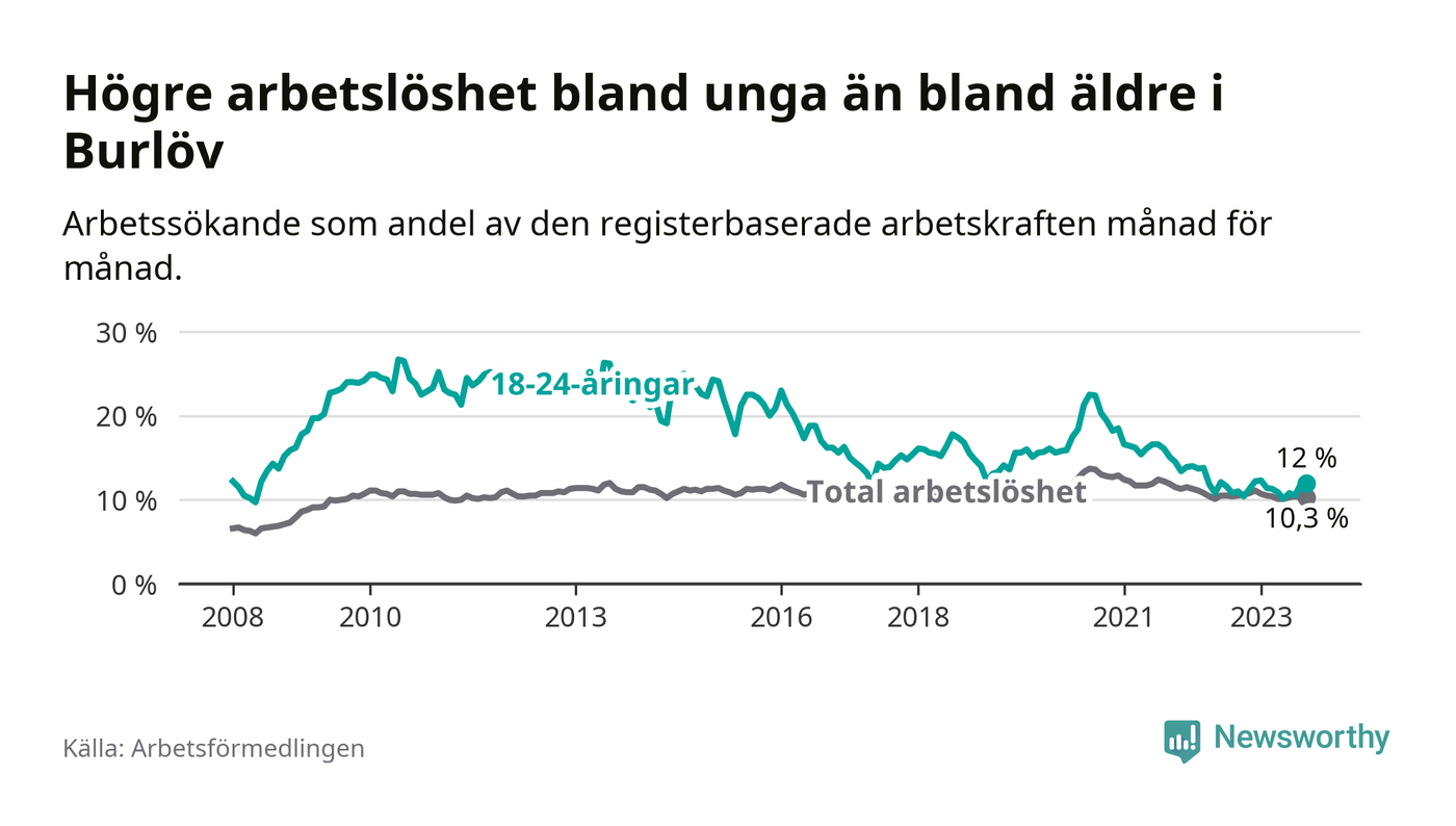 Precis som den totala arbetslösheten ligger ungdomsarbetslösheten i Burlöv högre än i Skåne som helhet. Skillnaden mellan kommunen och länet är 1,6 procentenheter.