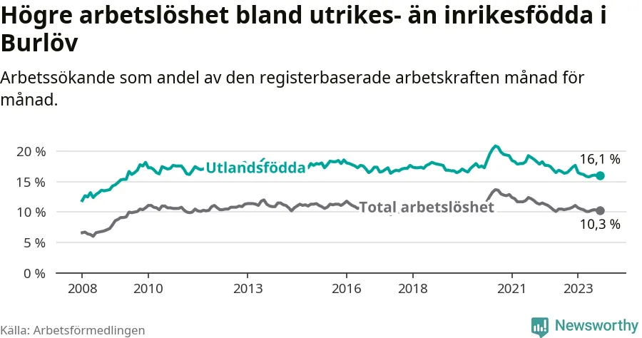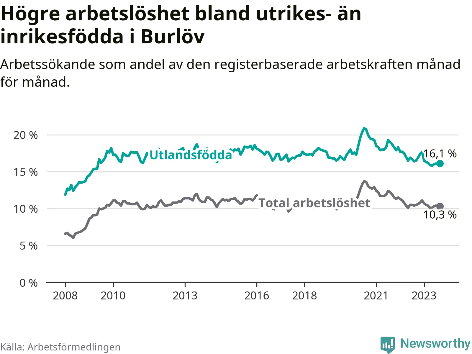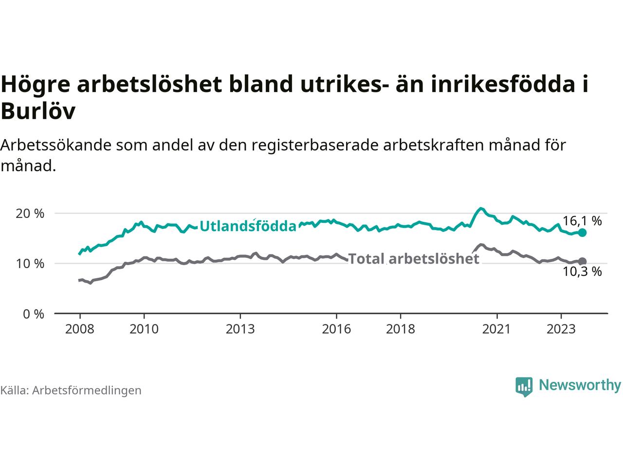 Arbetslösheten bland utlandsfödda var 16,1 procent i Burlöv under september månad, motsvarande 669 av 4 155 personer. Det är 0,4 procentenheter färre än vid samma tidpunkt i fjol (+37 om man räknar personer). Därmed har de utlandsföddas arbetslöshet varit lägre än vid samma tidpunkt i fjol i över två år i sträck. Sedan mars 2021 har arbetslösheten bland utlandsfödda minskat från 17,9 till 16,1 procent.