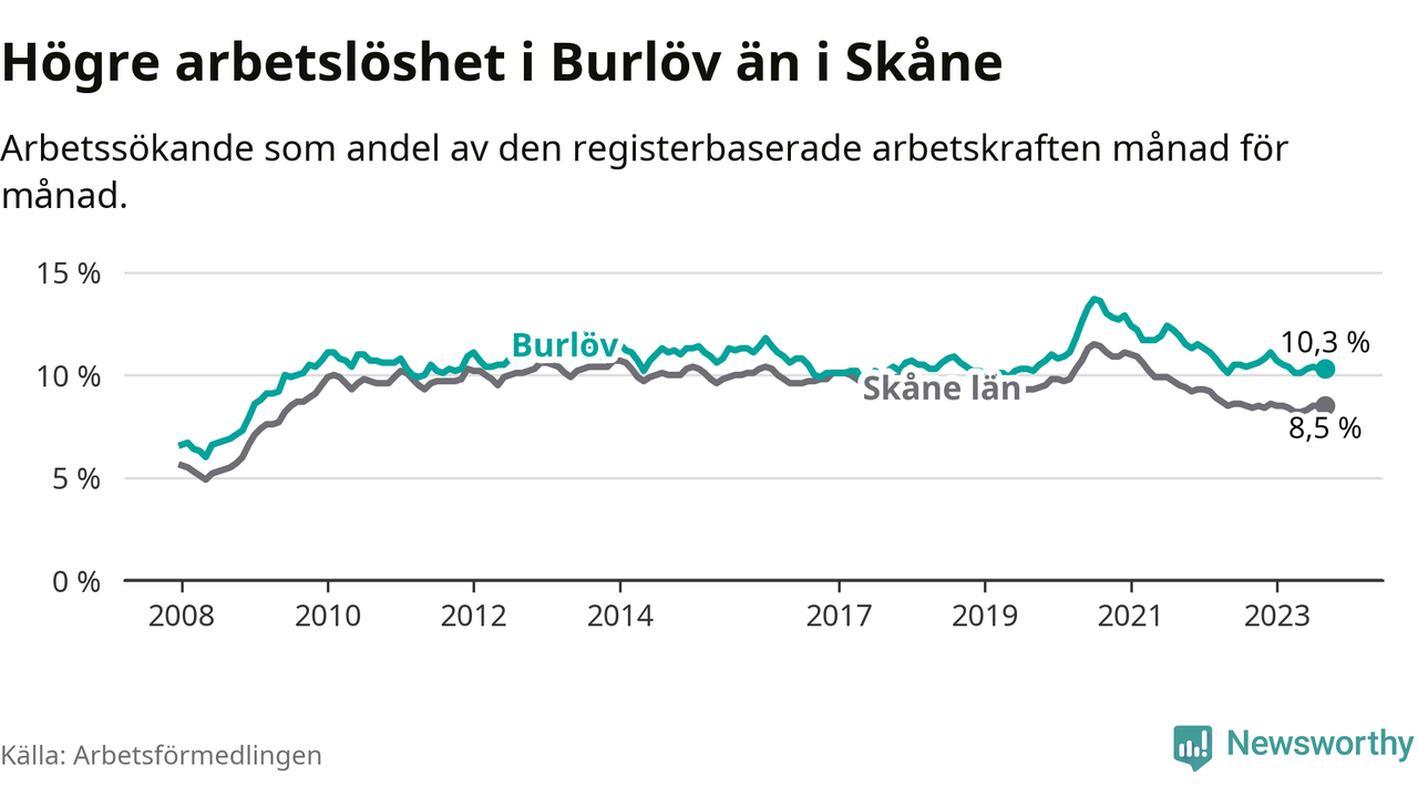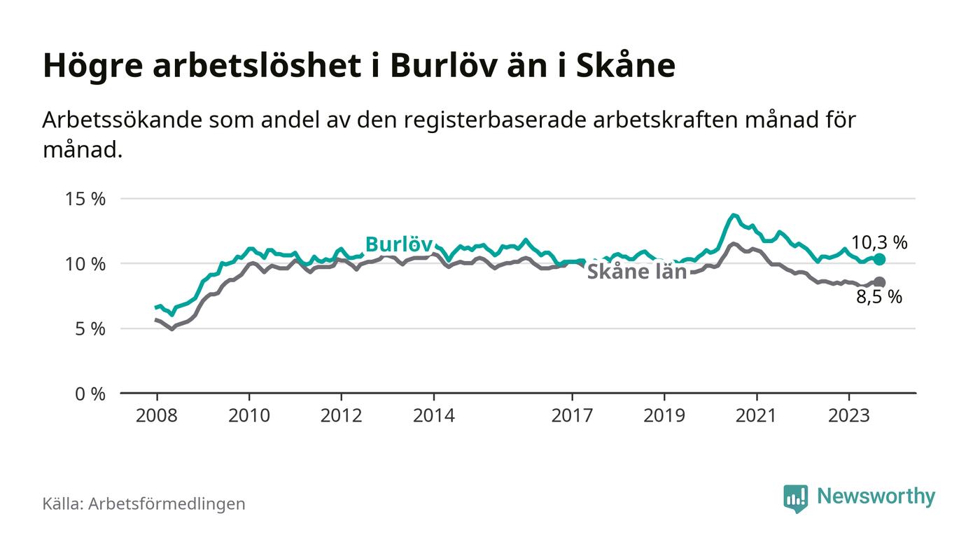 Malmö är den kommun som har högst arbetslöshet just nu (12,2 procent) i landet som helhet, medan Kiruna har den lägsta (2,2 procent). Burlövs arbetslöshet sticker ut som den sjunde högsta i hela landet.