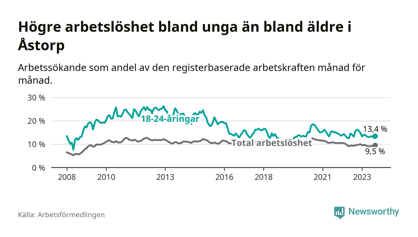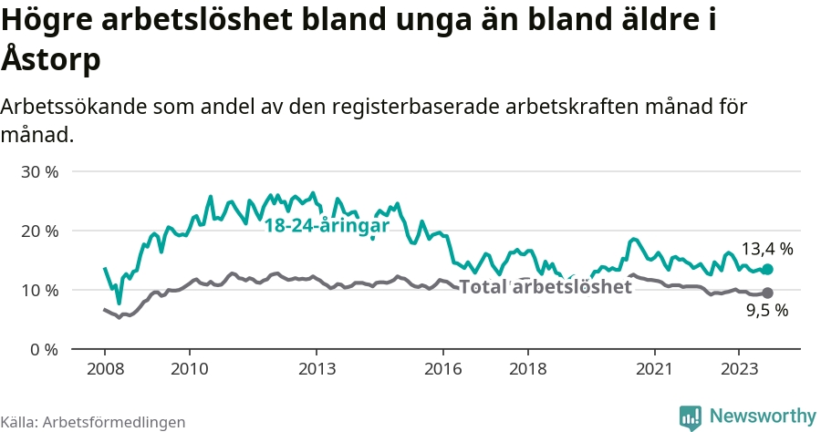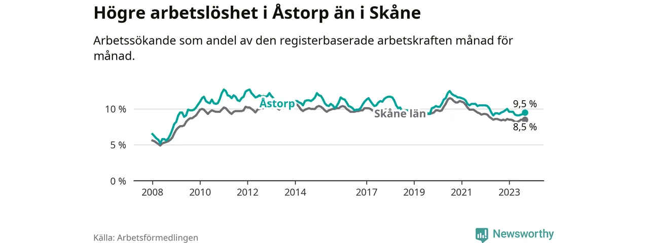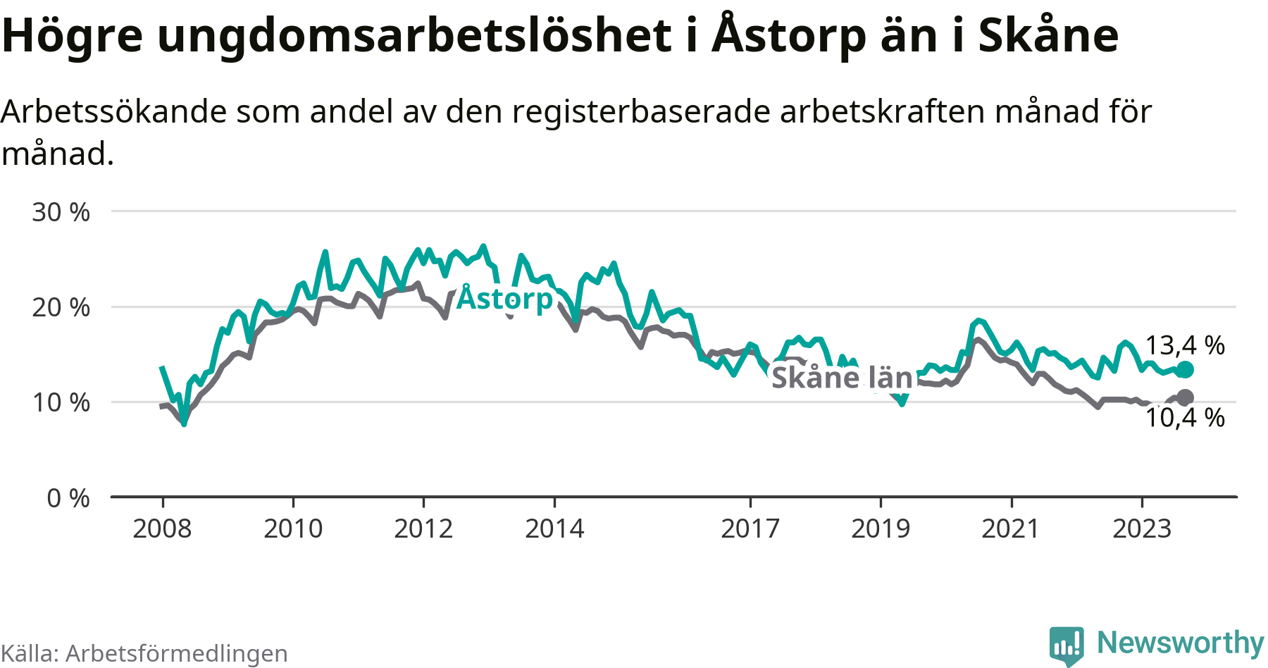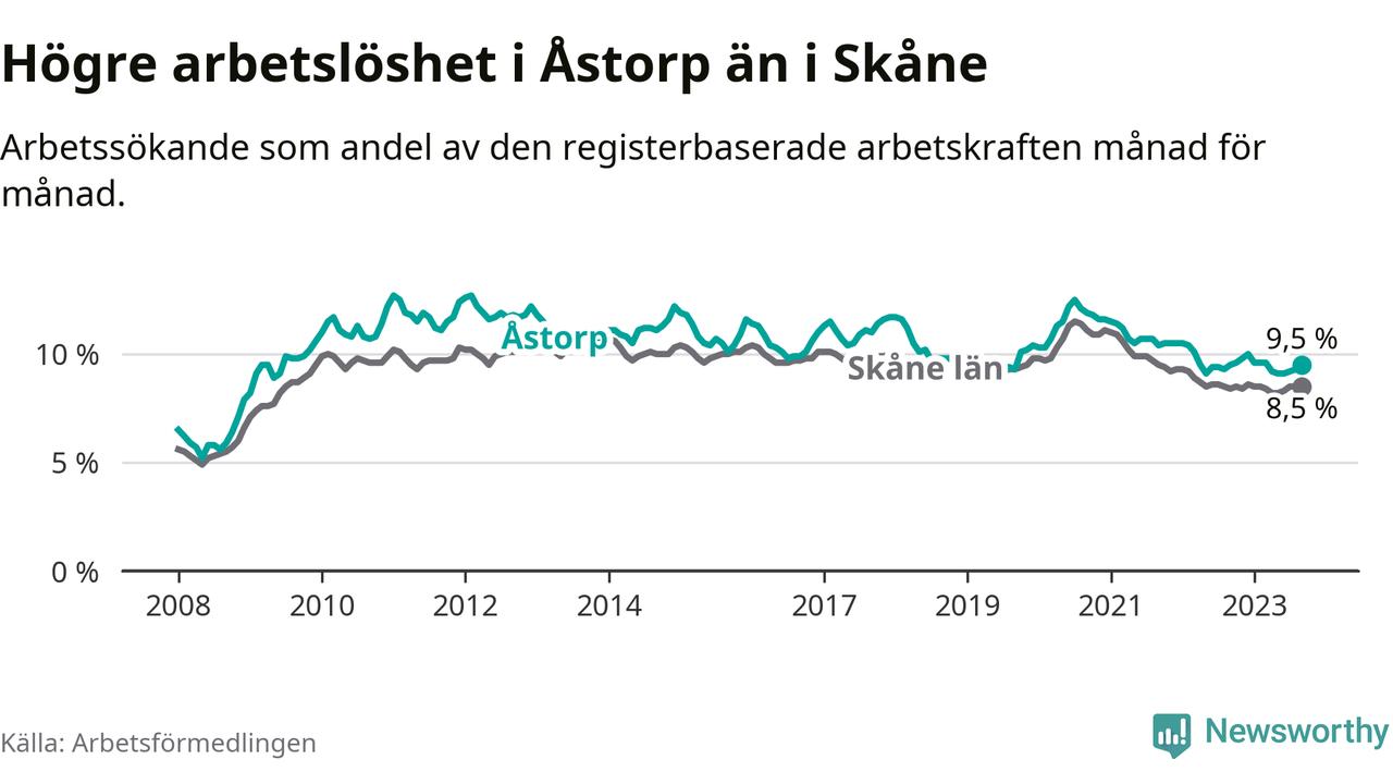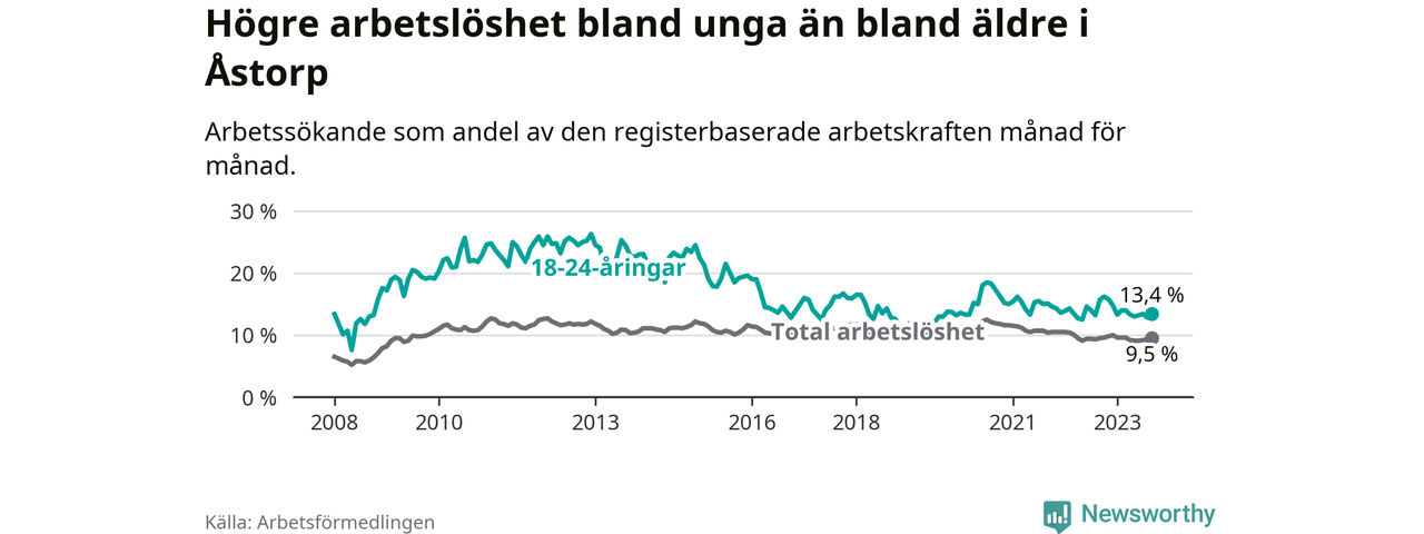 Precis som den totala arbetslösheten ligger ungdomsarbetslösheten i Åstorp högre än i Skåne som helhet. Skillnaden mellan kommunen och länet är 3,0 procentenheter.