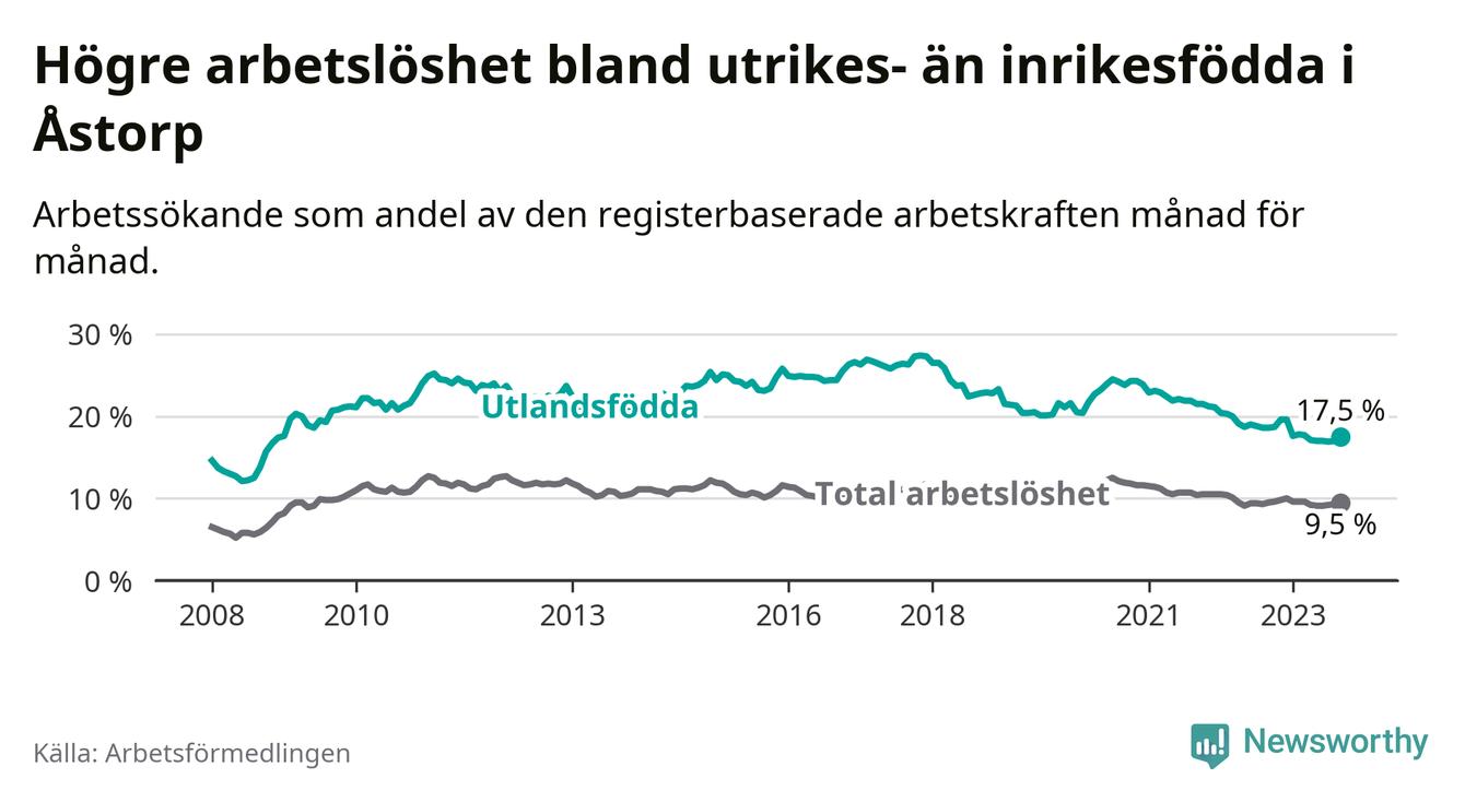 Skillnaden i arbetslöshet mellan utrikesfödda och hela befolkningen är 8,0 procentenheter i Åstorp. Det är en mindre skillnad än för ett år sedan (−1,1 procentenheter).