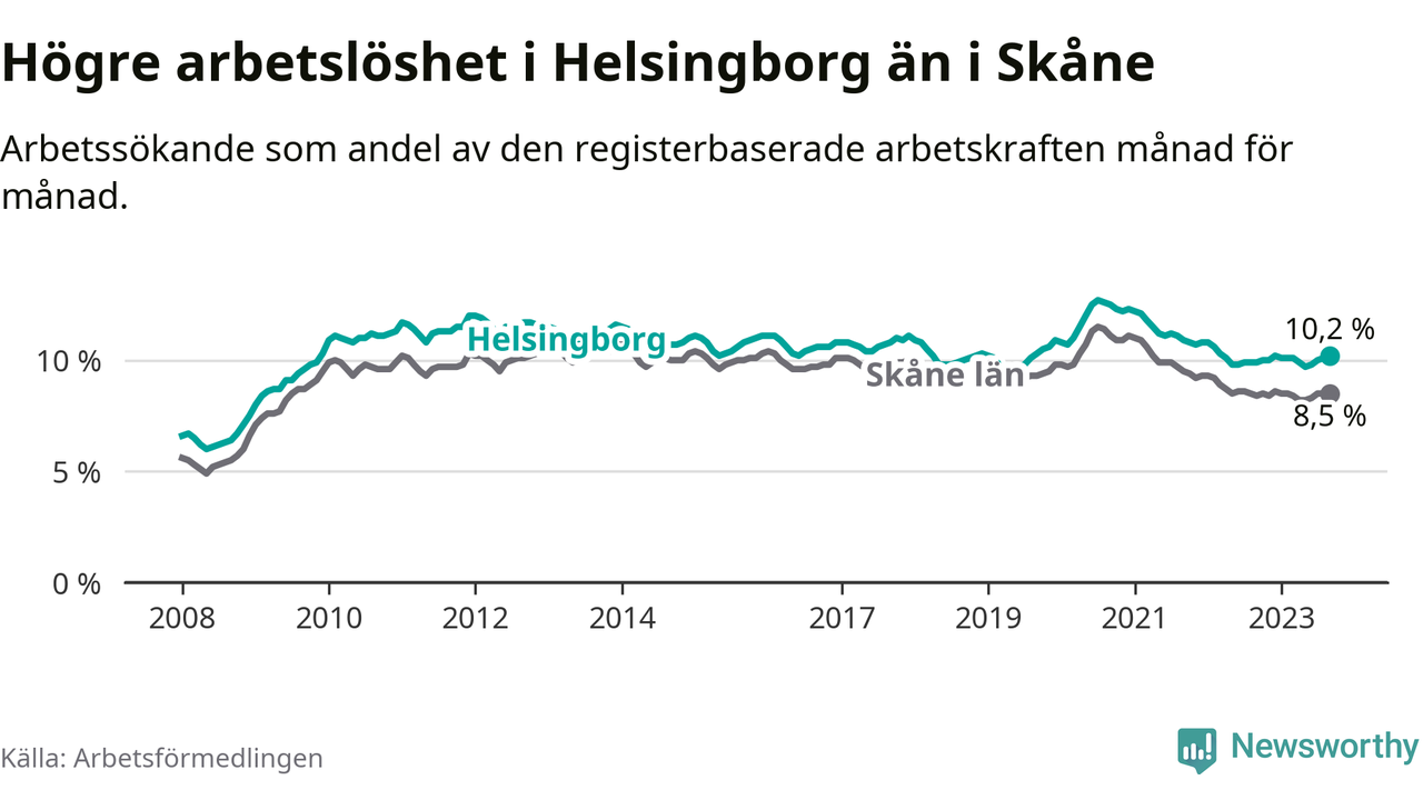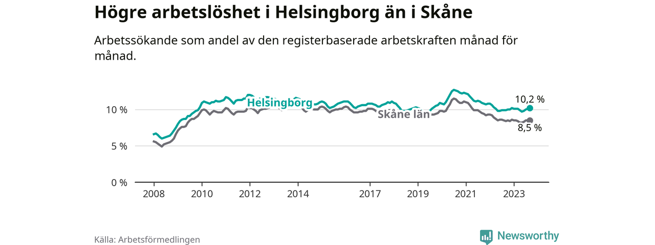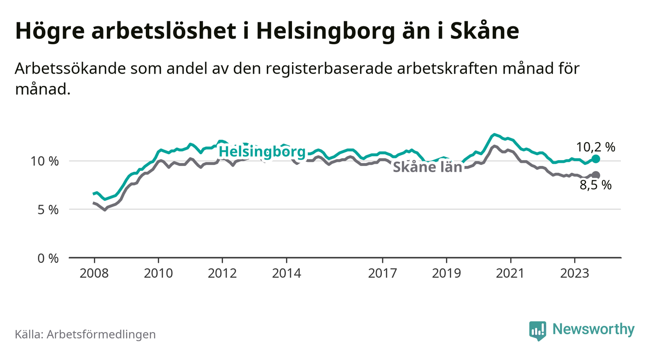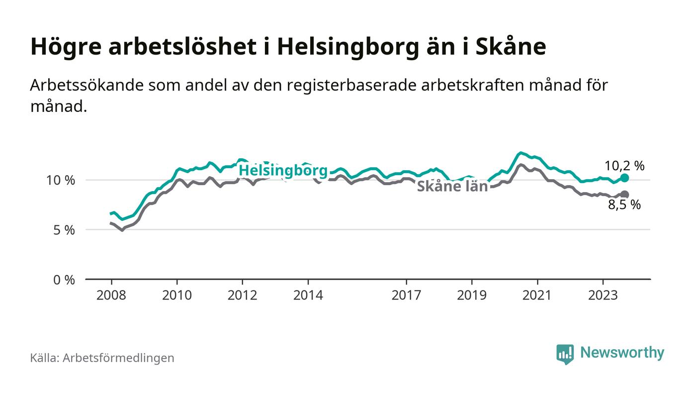 Helsingborg hade redan tidigare högre arbetslöshet än snittet i hela Skåne län och nu växer klyftan (10,2 procent i kommunen, jämfört med 8,5 procent i hela länet). Vellinge har den lägsta arbetslösheten i länet (3,3 procent), medan Malmö har den högsta (12,2 procent). För att Helsingborg skulle komma ner i samma arbetslöshetsnivå som Vellinge skulle 5 168 personer behöva sysselsättas.