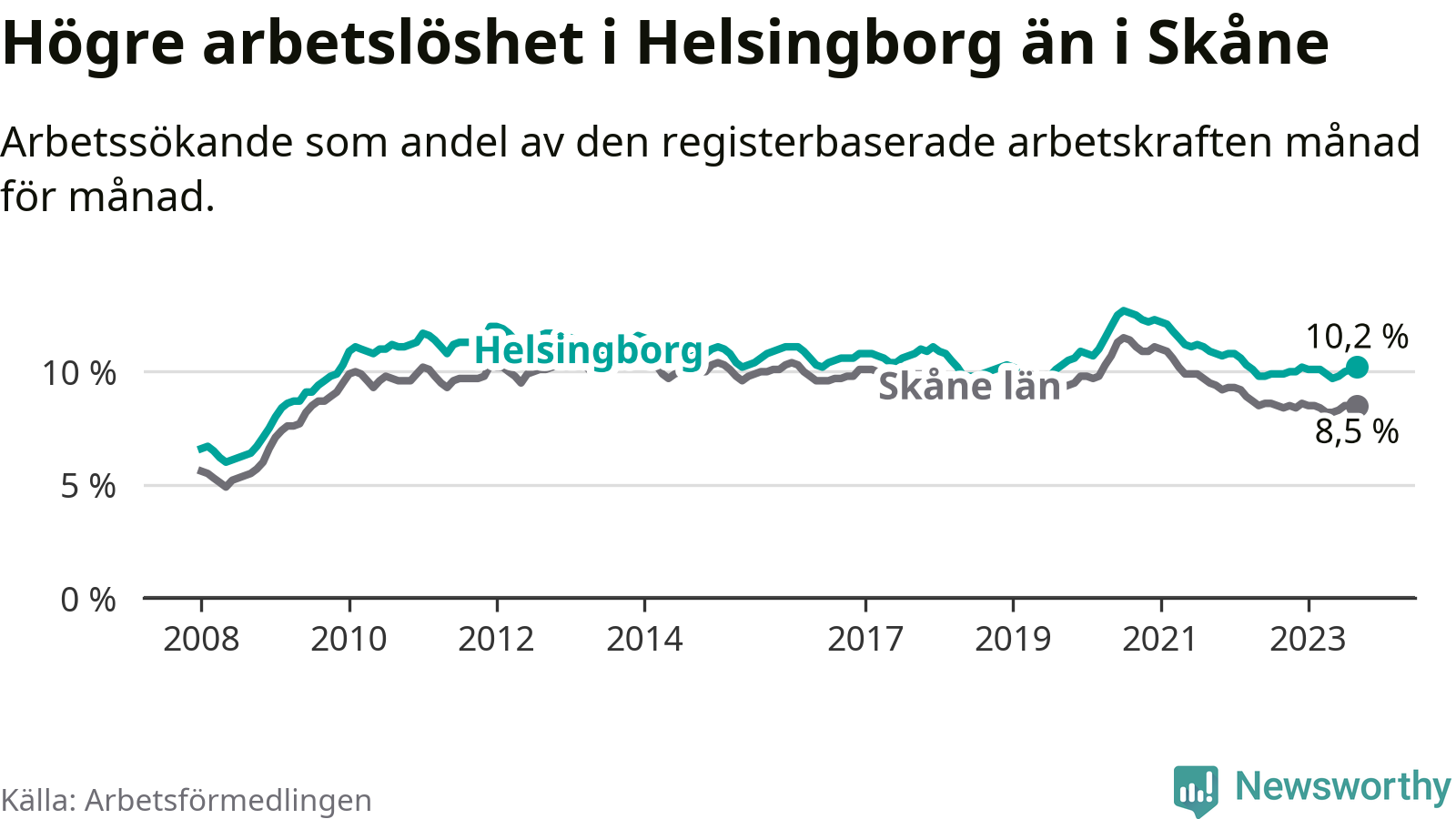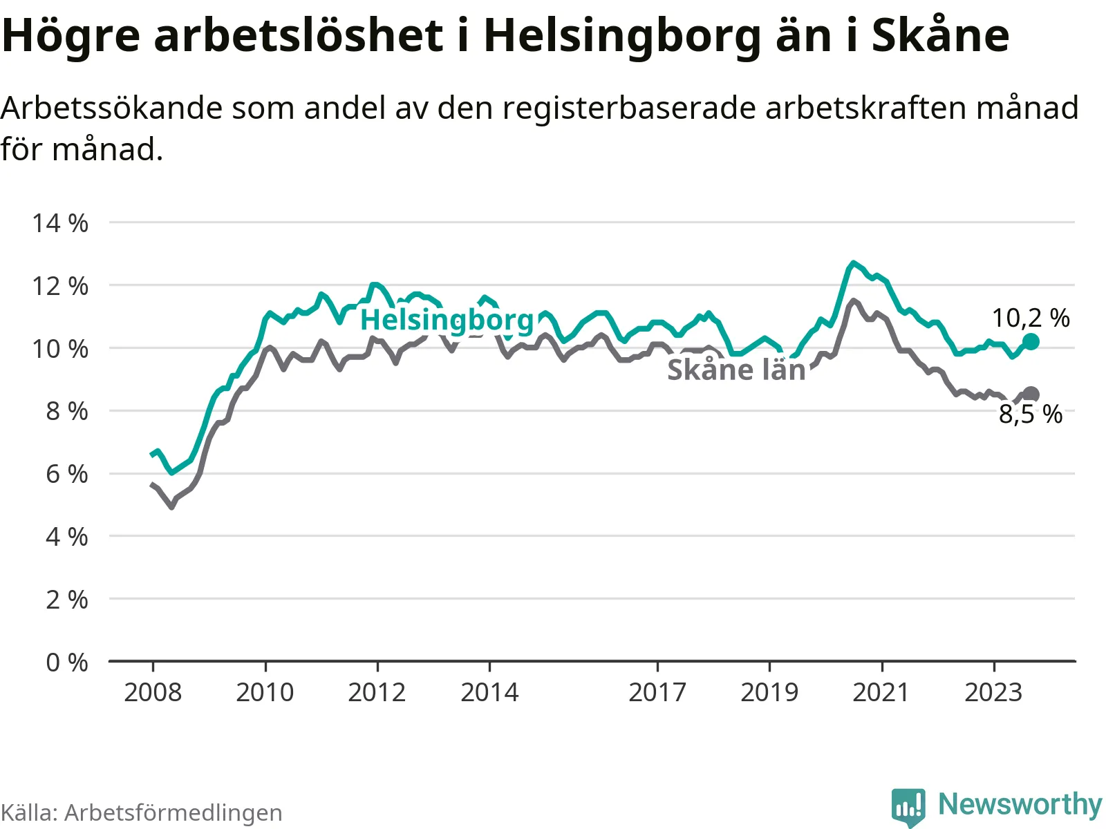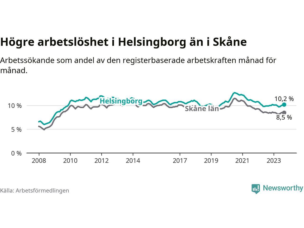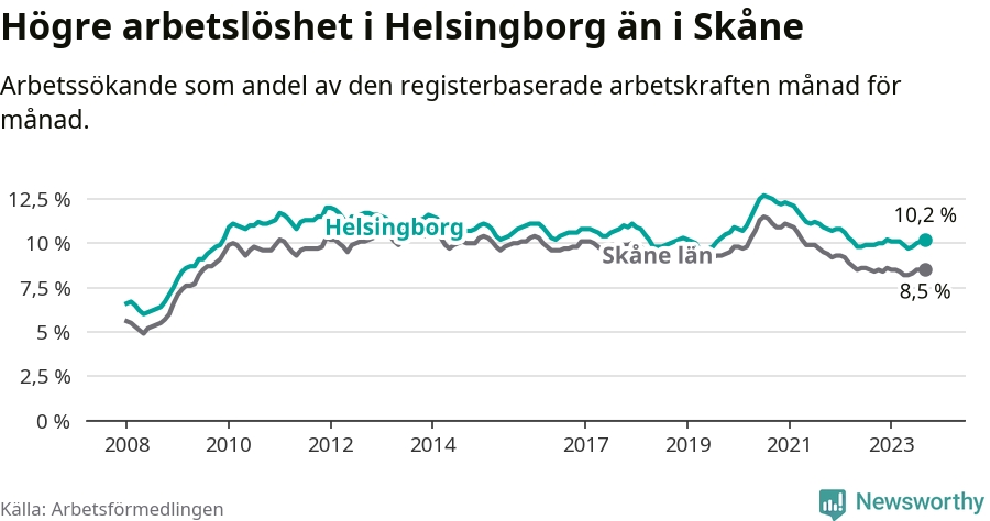 Helsingborg hade redan tidigare högre arbetslöshet än snittet i hela Skåne län och nu växer klyftan (10,2 procent i kommunen, jämfört med 8,5 procent i hela länet). Vellinge har den lägsta arbetslösheten i länet (3,3 procent), medan Malmö har den högsta (12,2 procent). För att Helsingborg skulle komma ner i samma arbetslöshetsnivå som Vellinge skulle 5 168 personer behöva sysselsättas.