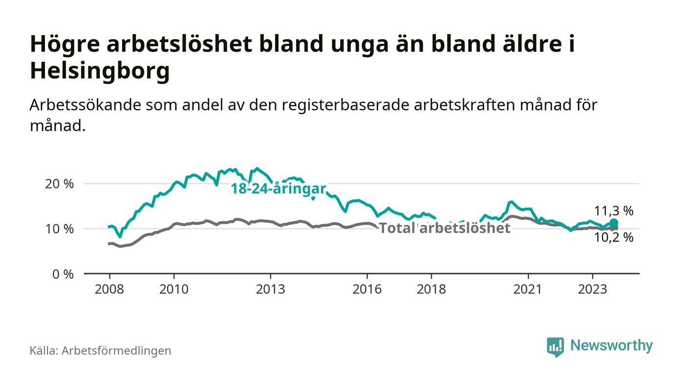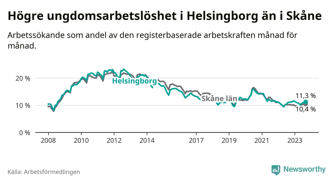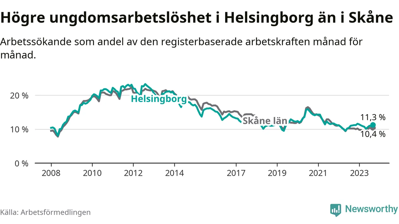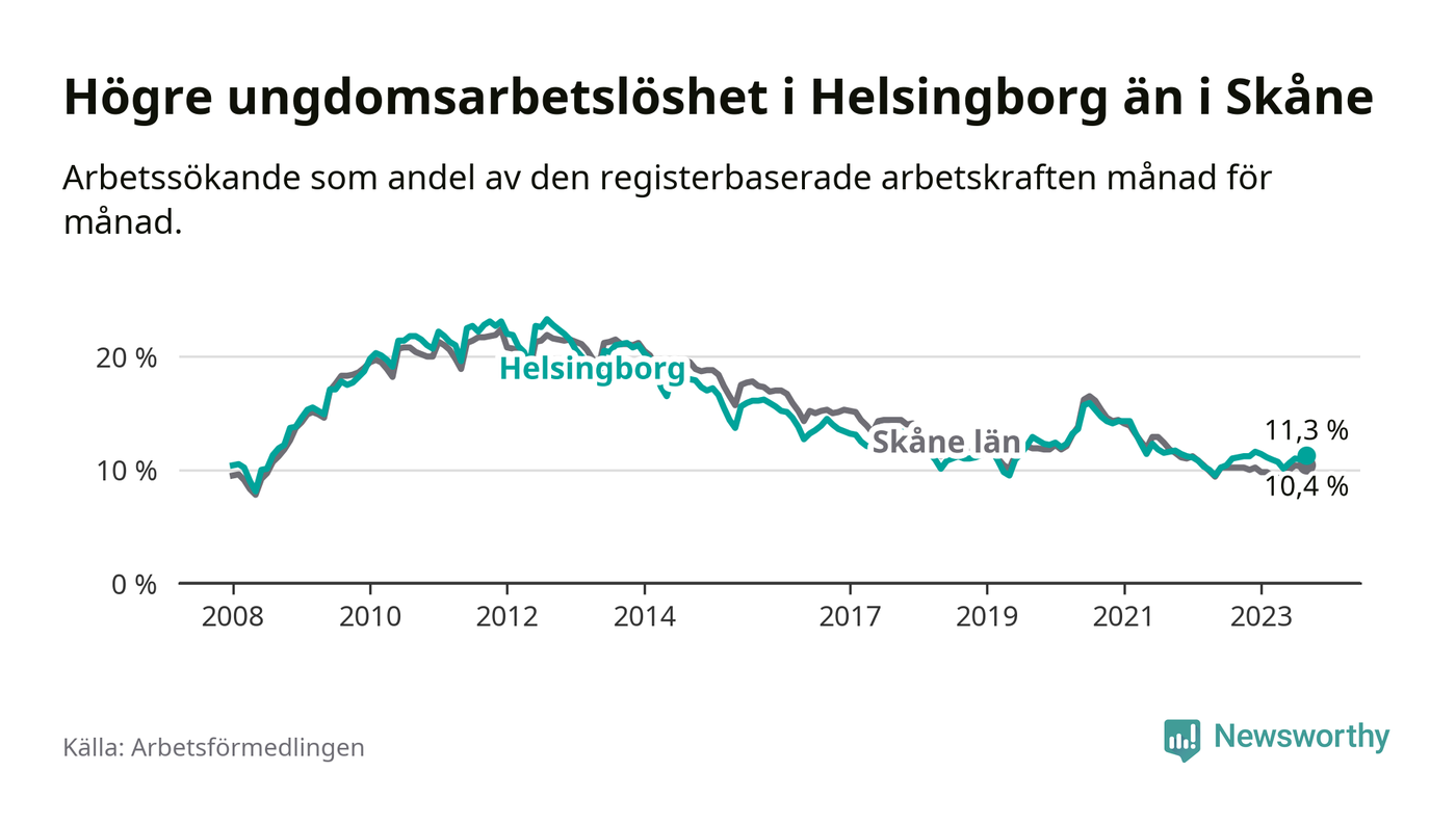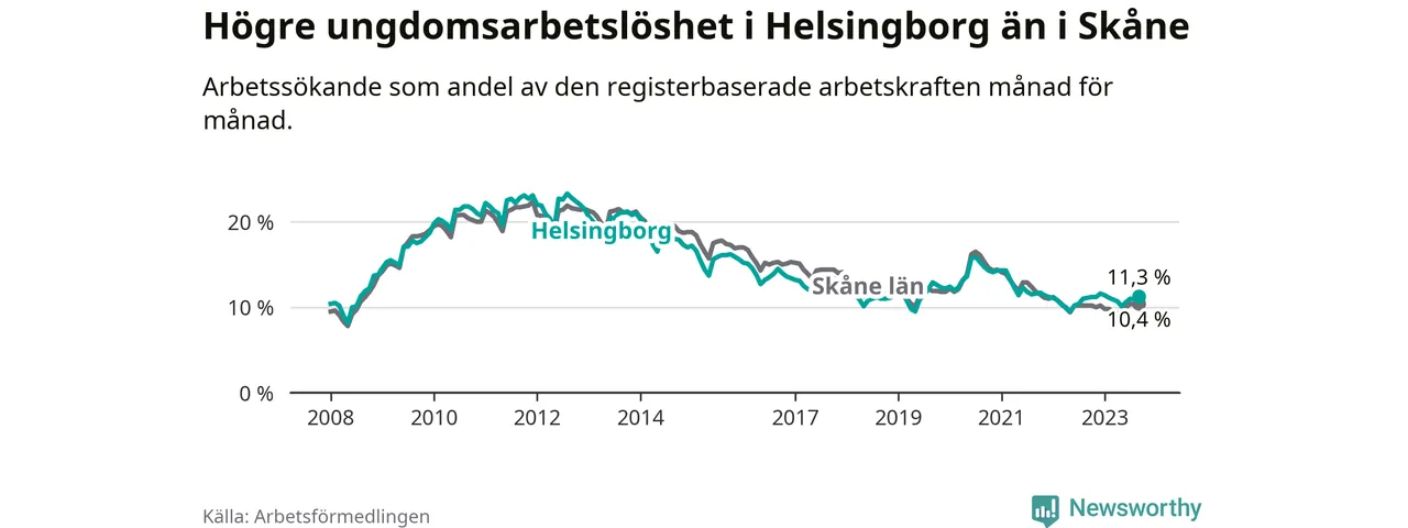 Precis som den totala arbetslösheten ligger ungdomsarbetslösheten i Helsingborg högre än i Skåne som helhet. Skillnaden mellan kommunen och länet är 0,9 procentenheter.
