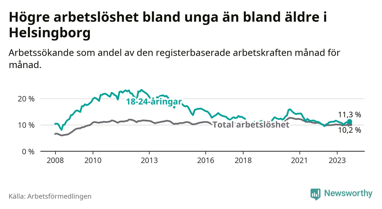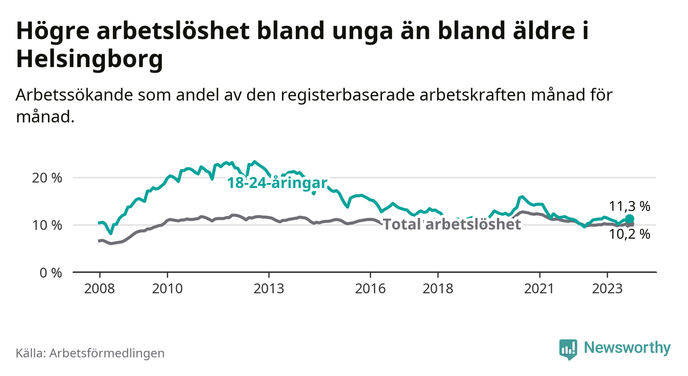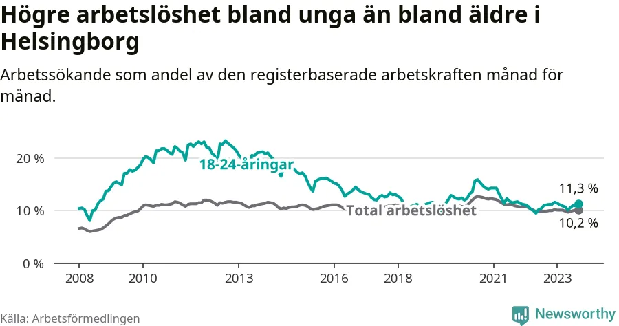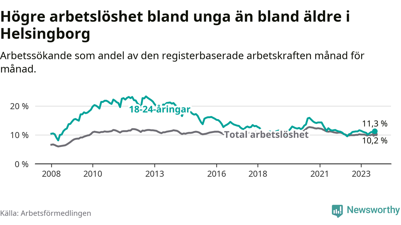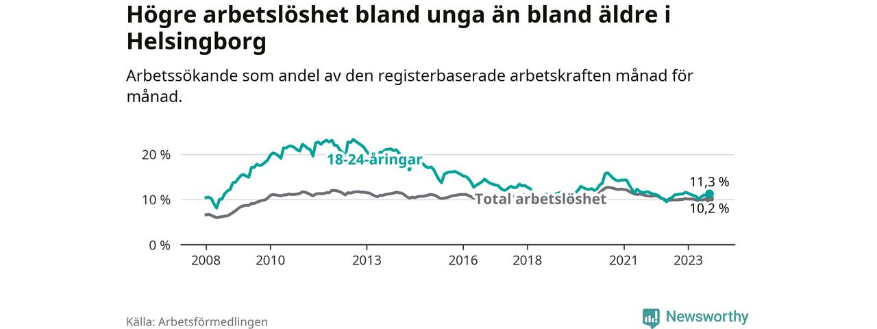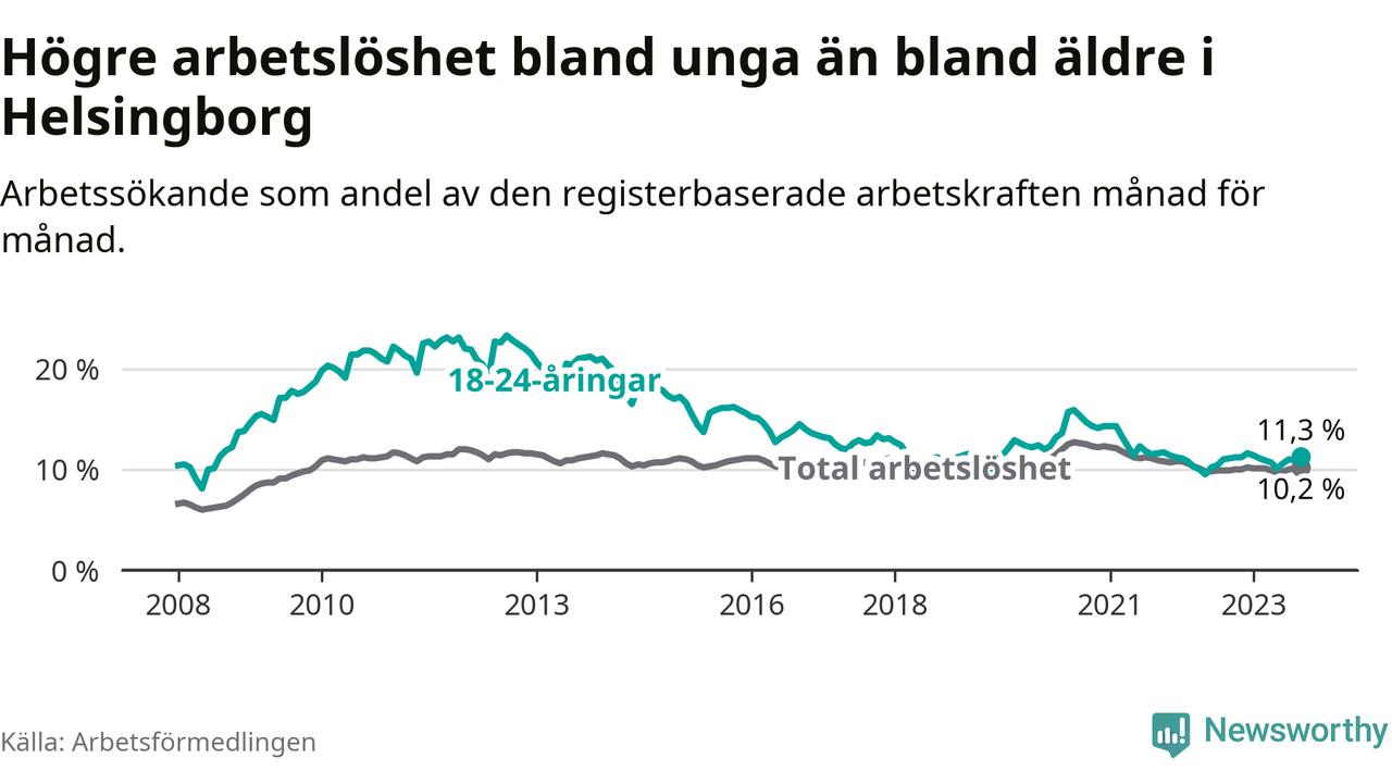 Precis som den totala arbetslösheten ligger ungdomsarbetslösheten i Helsingborg högre än i Skåne som helhet. Skillnaden mellan kommunen och länet är 0,9 procentenheter.
