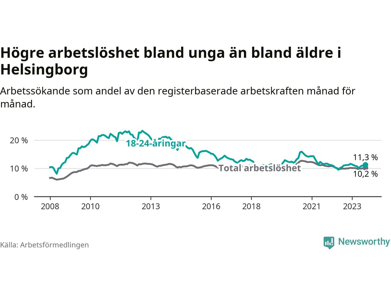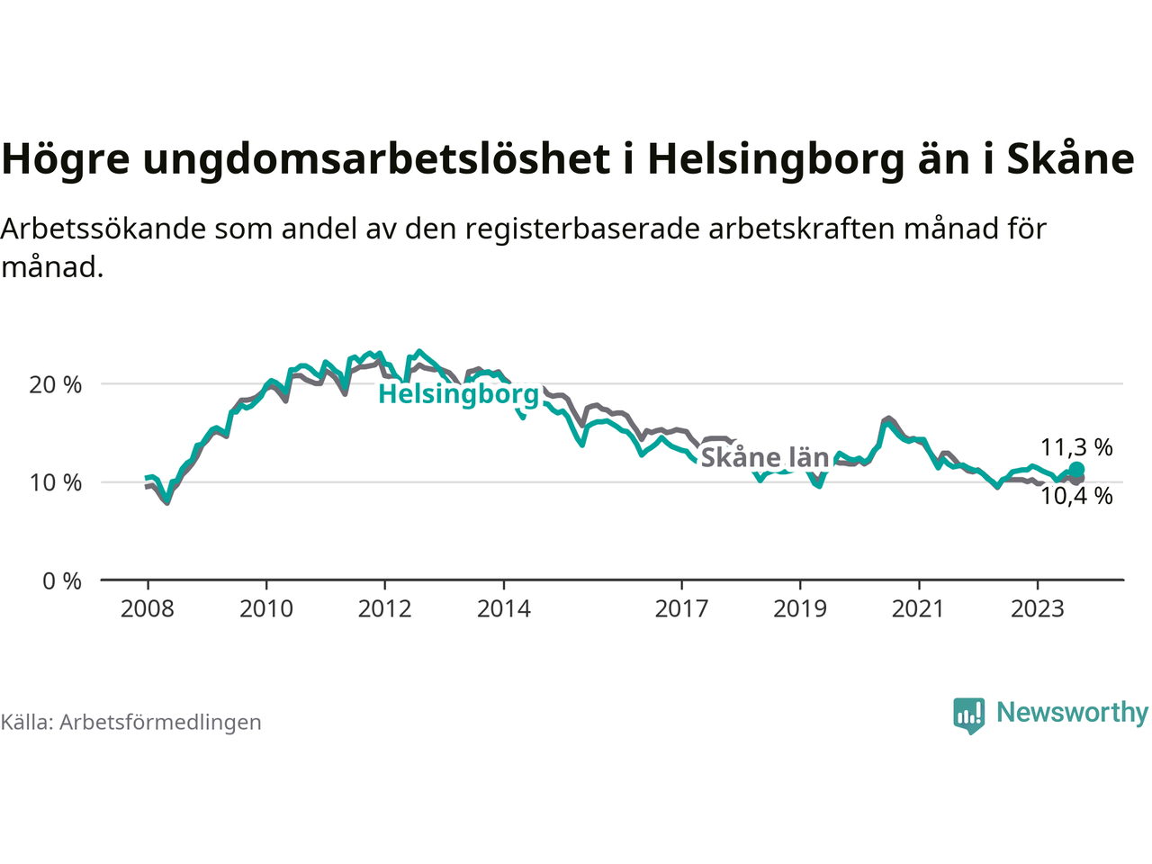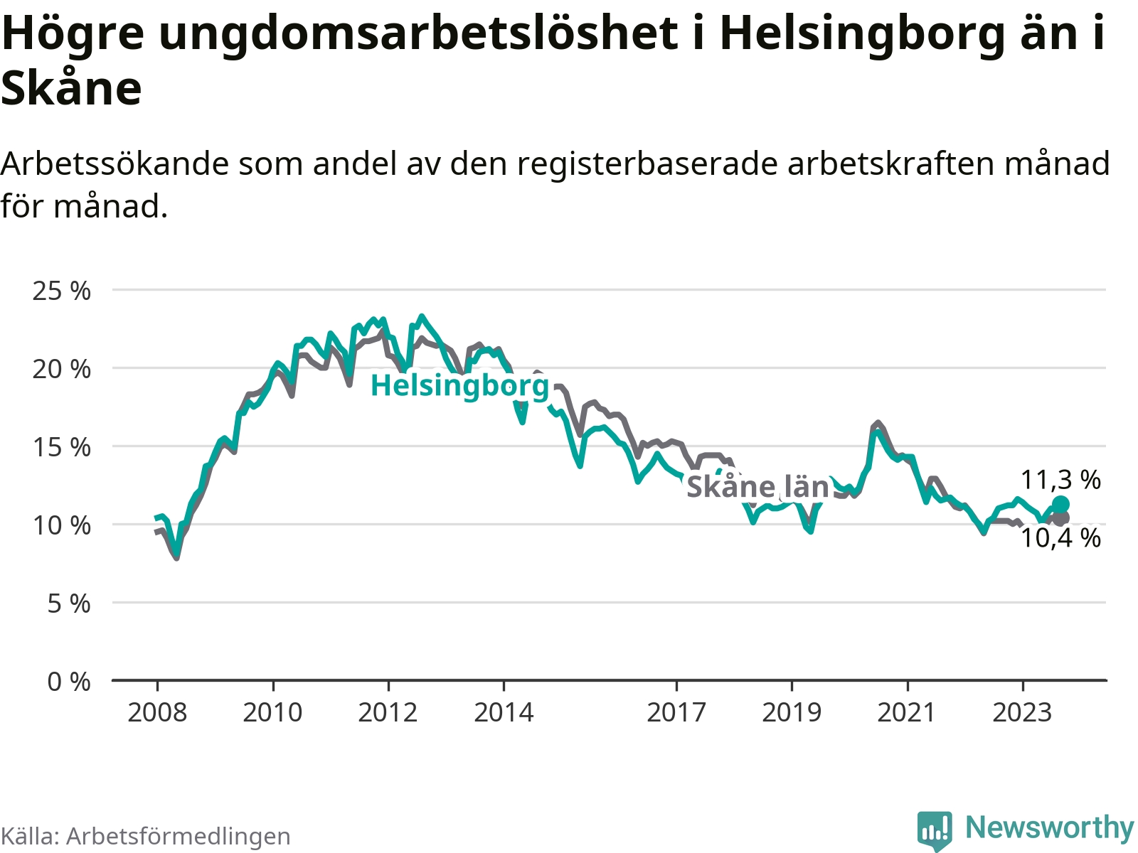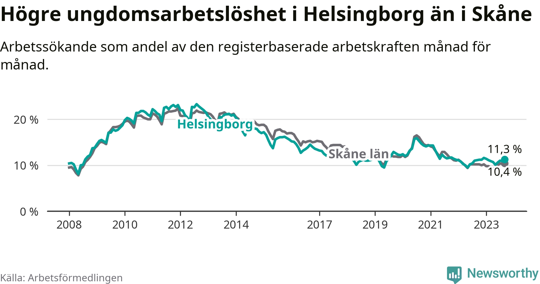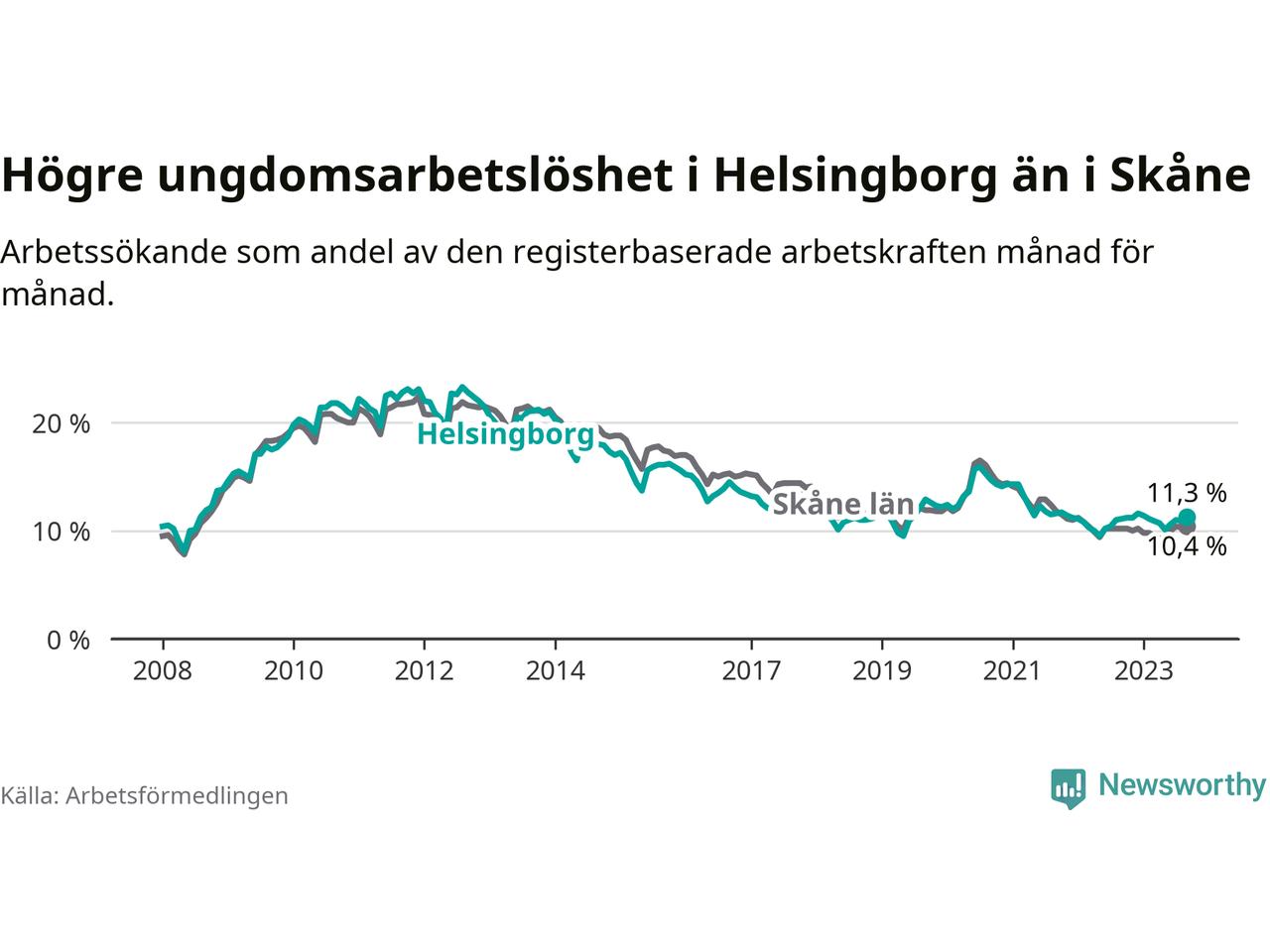 Precis som den totala arbetslösheten ligger ungdomsarbetslösheten i Helsingborg högre än i Skåne som helhet. Skillnaden mellan kommunen och länet är 0,9 procentenheter.