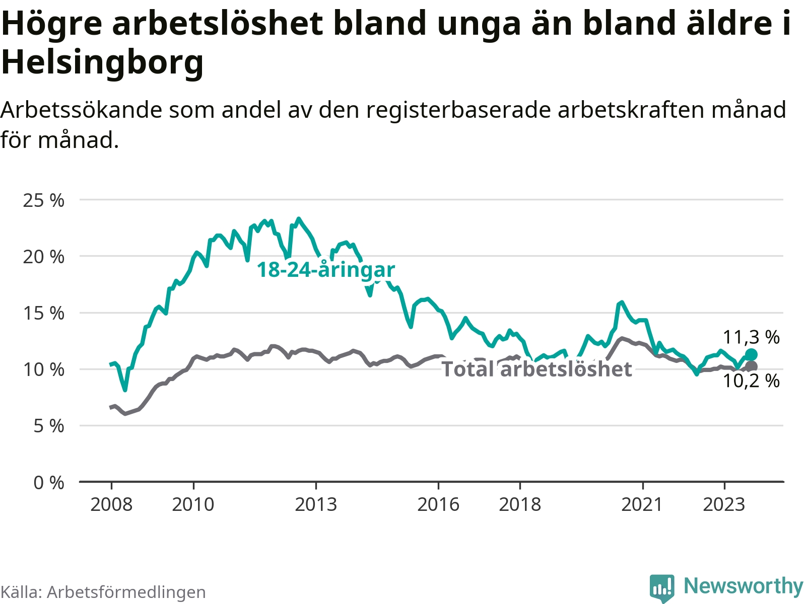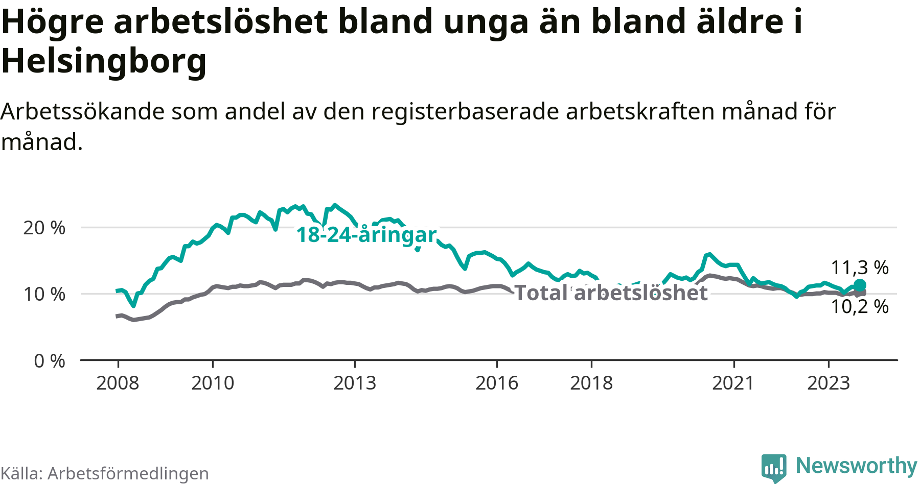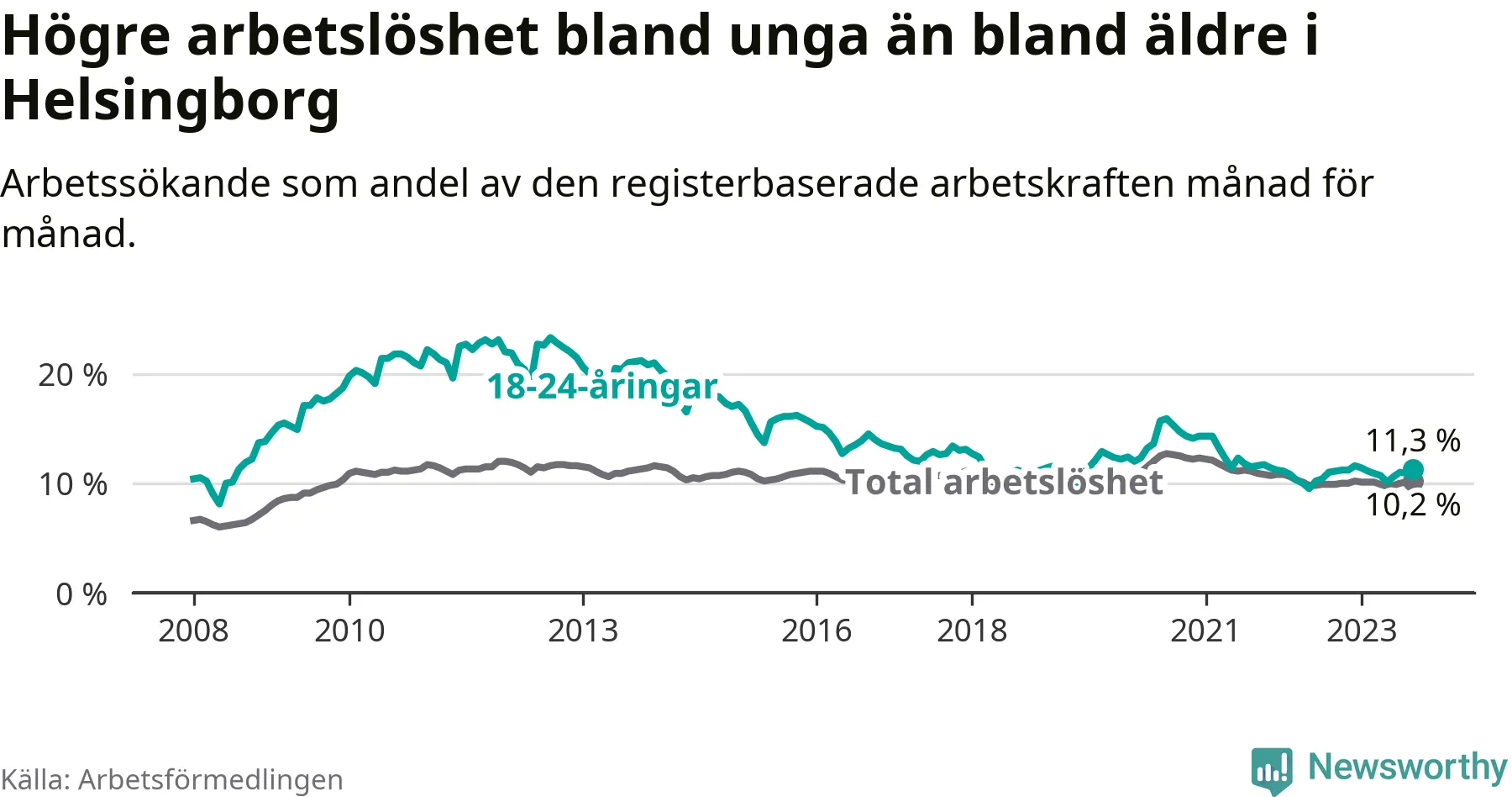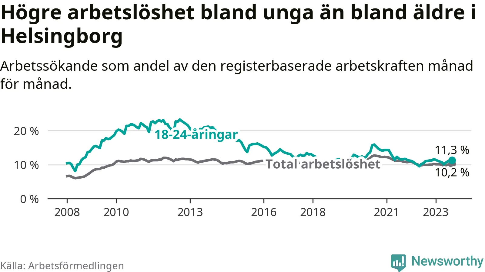 Precis som den totala arbetslösheten ligger ungdomsarbetslösheten i Helsingborg högre än i Skåne som helhet. Skillnaden mellan kommunen och länet är 0,9 procentenheter.